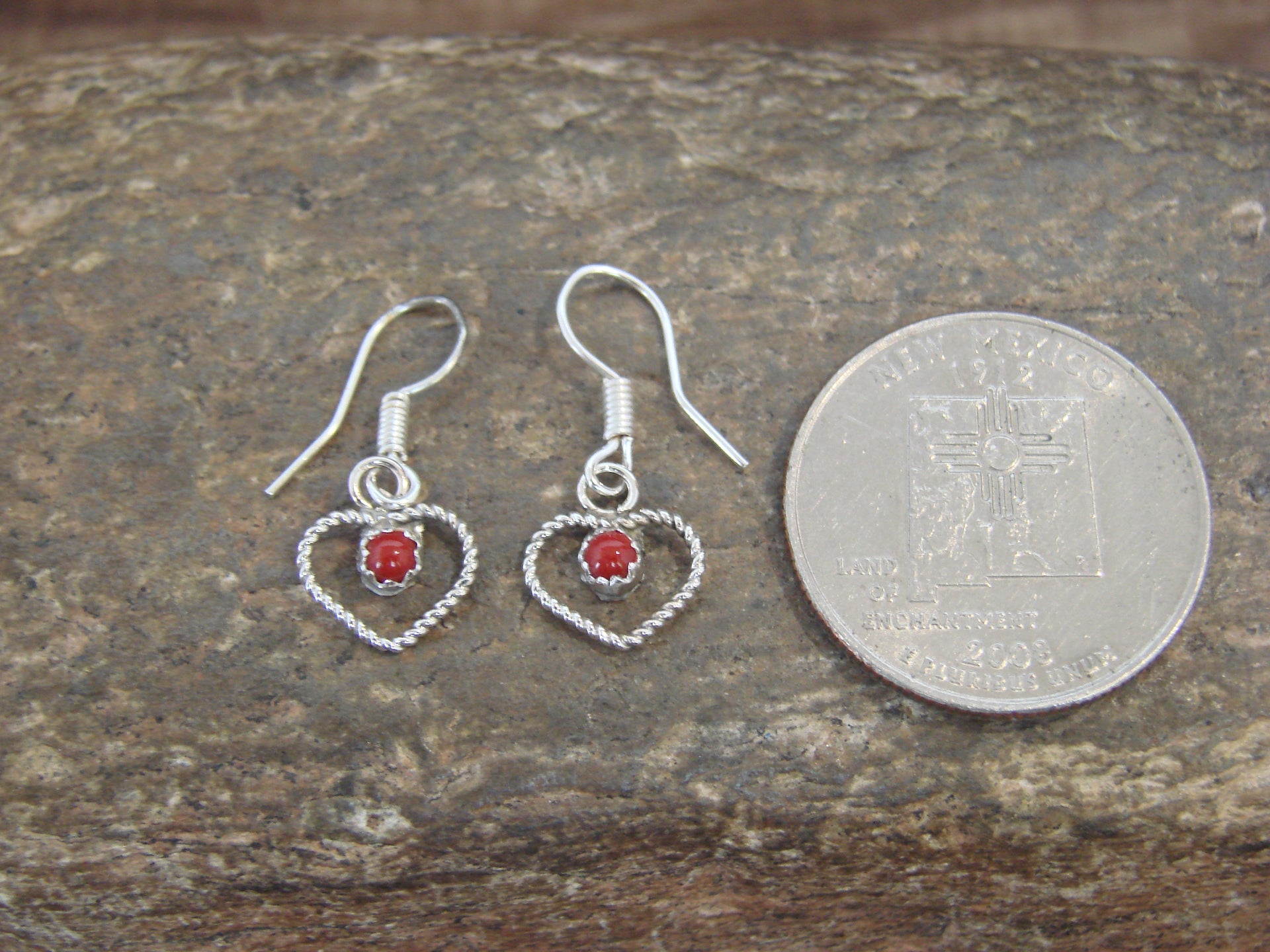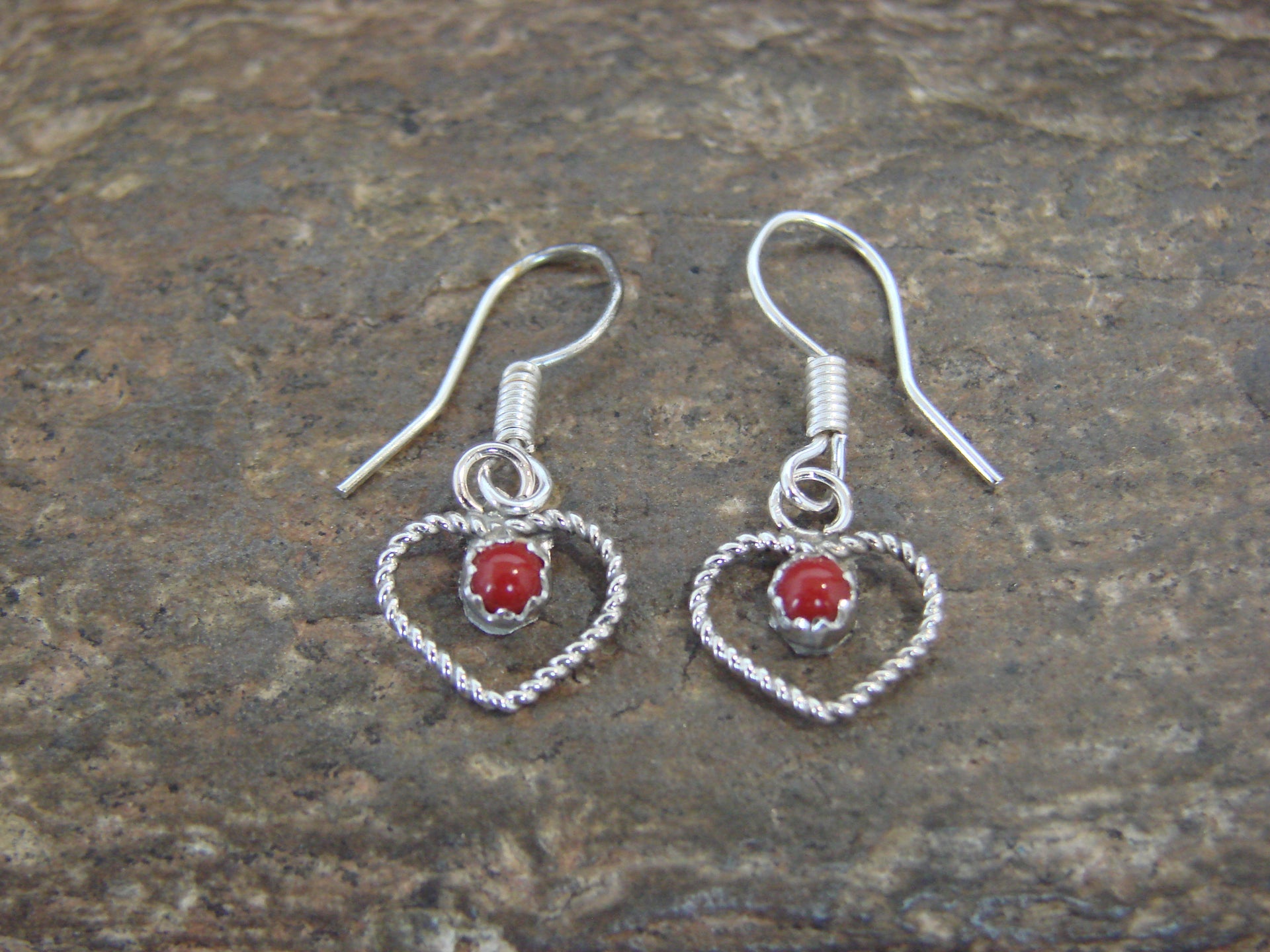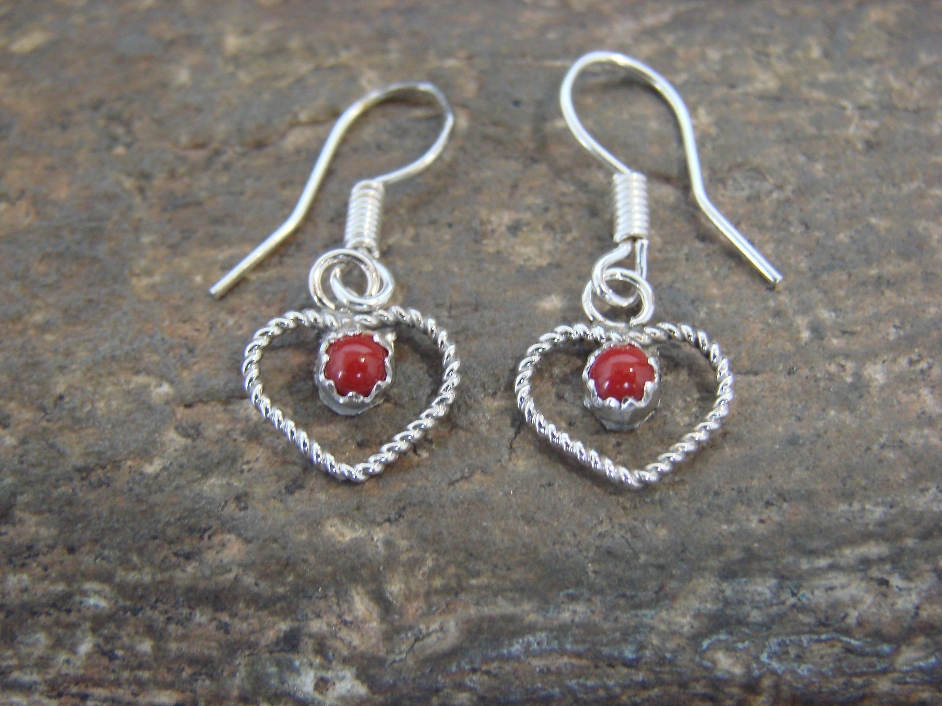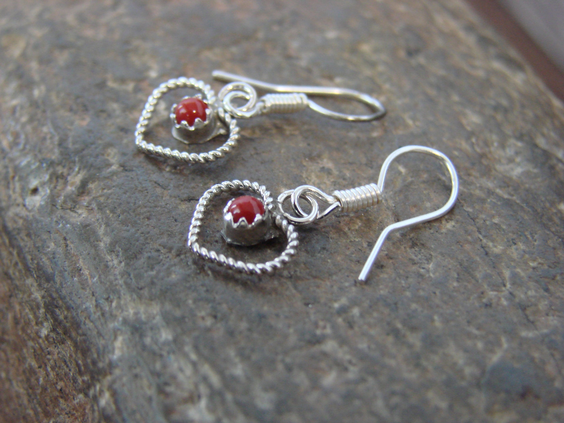 Native American Zuni Indian Sterling Silver & Coral Heart Dangle Earrings from Western New Mexico. These Gorgeous earrings feature beautiful Coral stones set into crown sterling silver bezel settings. This is a beautiful pair of earrings! Zuni Indian Handmade by Hazel Pablito. Unsigned. Free gift box included!