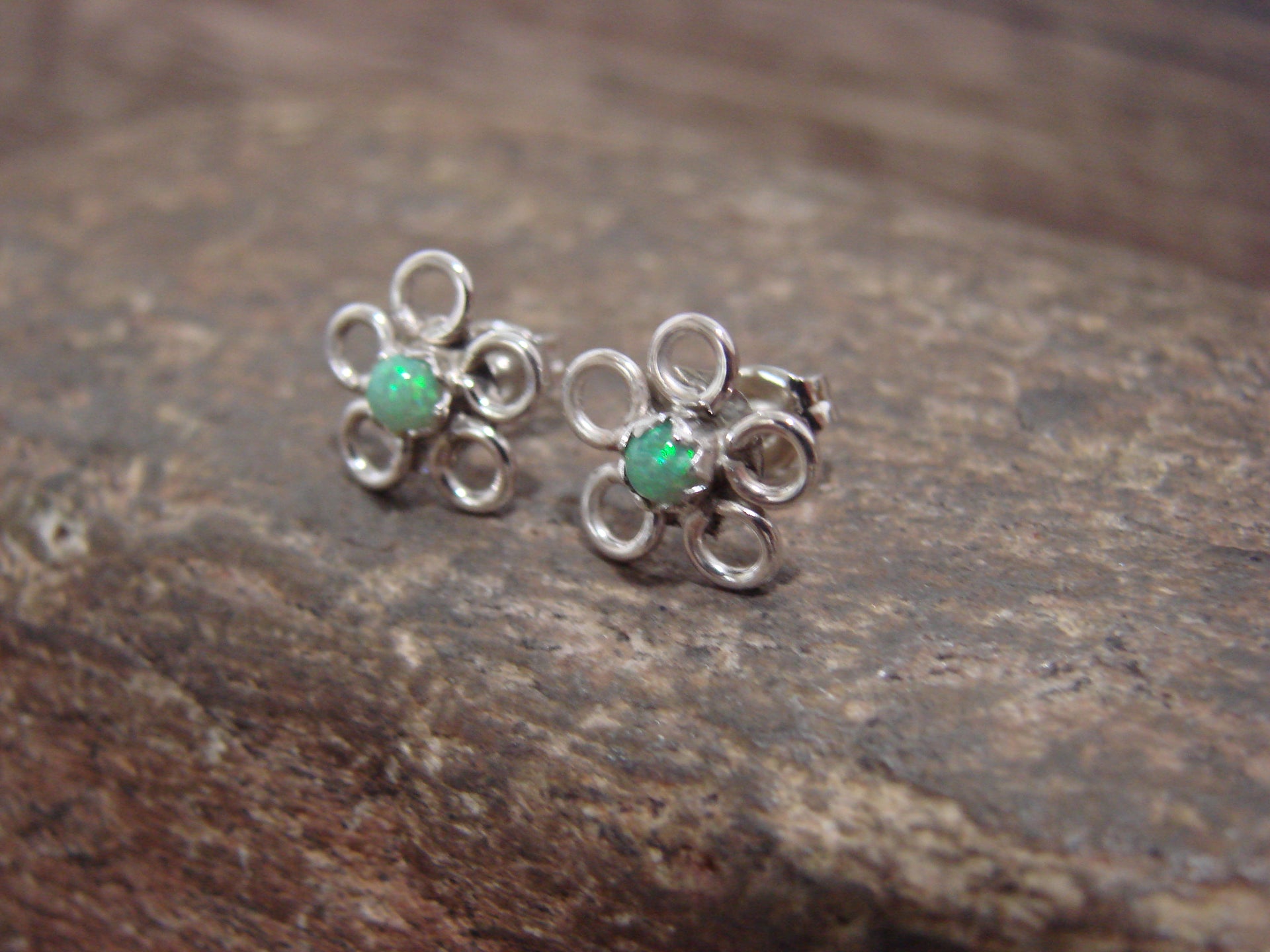 Native American Zuni Indian Sterling Silver & Green Opal Floral Stud Post Earrings from Western New Mexico. These stunning earrings feature beautiful Lab Opal Stones set into a crown Sterling Silver Flower setting. These earrings are gorgeous! Zuni Indian hand made by Ronald Yatsattie. Unsigned. Free shipping and gift box included!