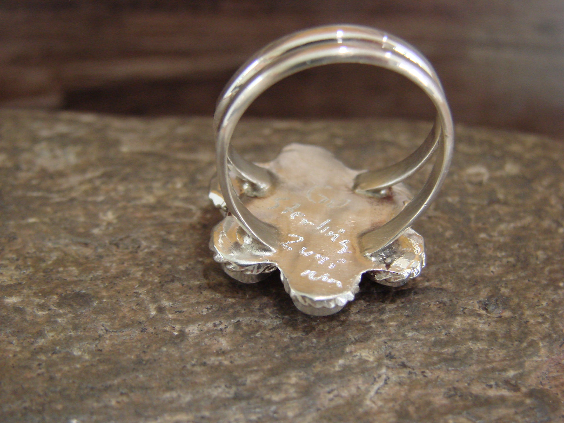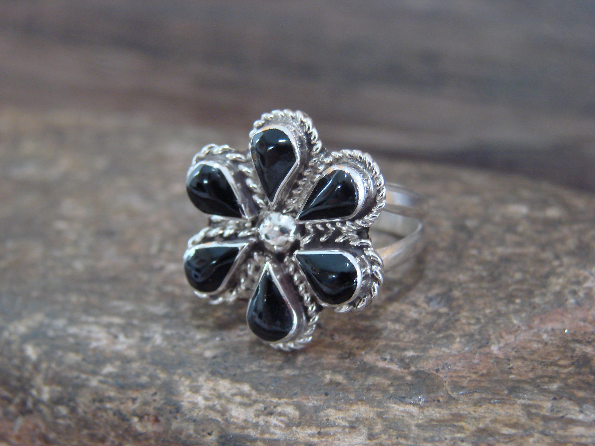 Genuine Native American Zuni Indian Sterling Silver & Onyx Cluster Ring from Western New Mexico. This Stunning ring features beautiful Onyx stones Inlayed into smooth Sterling Silver. Polished to a bright shine, this is a very nice ring! Handmade by Zuni Silversmith Gina Dosedo. Signed on the back. Free Shipping and gift box included!