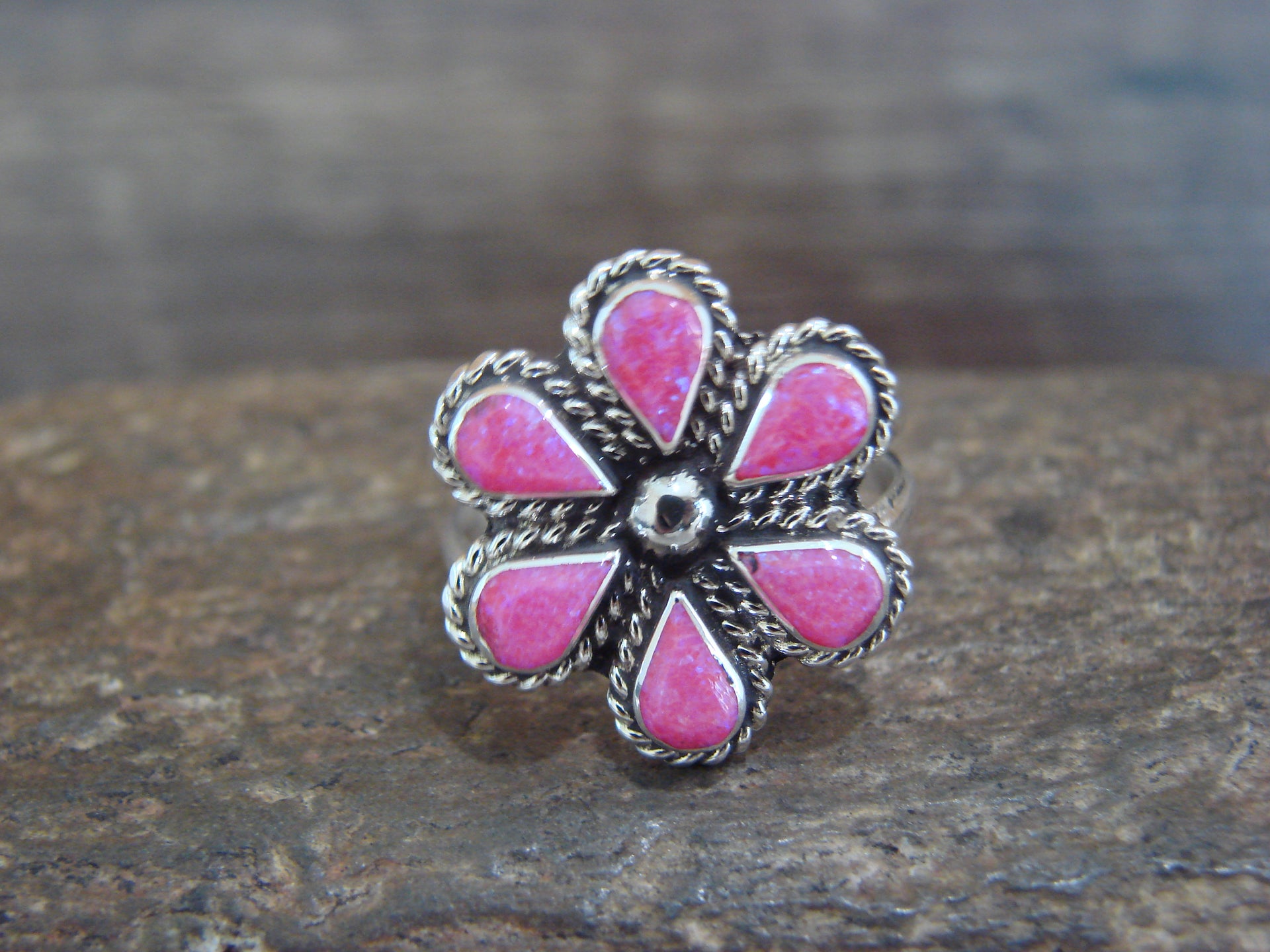 Native American Zuni Indian Sterling Silver & Pink Opal Cluster Ring from Western New Mexico. This Stunning ring features beautiful Pink Lab Opal stones Inlayed into smooth Sterling Silver. Polished to a bright shine, this is a very nice ring! Handmade by Zuni Silversmith Gina Dosedo. Signed on the back. Free Shipping and gift box included!