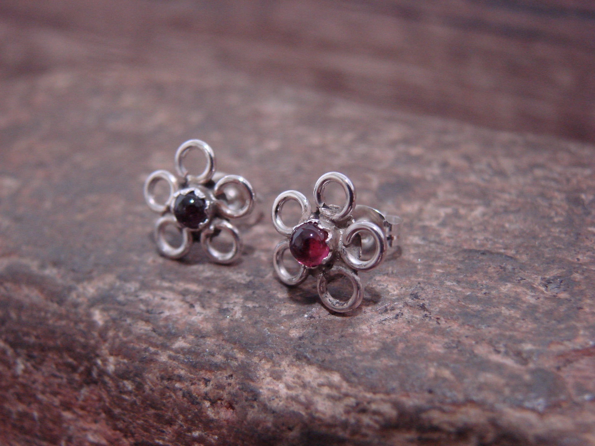 Native American Zuni Indian Sterling Silver & Purple Floral Stud Post Earrings from Western New Mexico. These stunning earrings feature beautiful Man Made Amethyst Stones set into a crown Sterling Silver Flower setting. These earrings are gorgeous! Zuni Indian hand made by Ronald Yatsattie. Unsigned. Free shipping and gift box included!