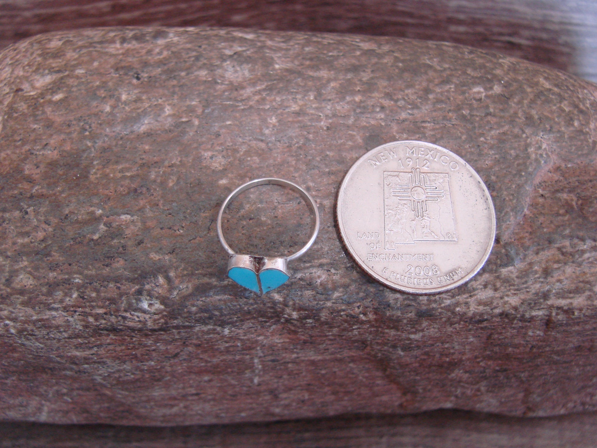 Genuine Native American Zuni Indian Sterling Silver & Turquoise Inlay Heart Ring from Western New Mexico. This Genuine piece features two Genuine Turquoise stones intricately inlayed into a smooth Sterling Silver Heart Bezel Setting. Zuni Indian hand made by Dorothy Neha. Unsigned. Free Shipping and gift box included!