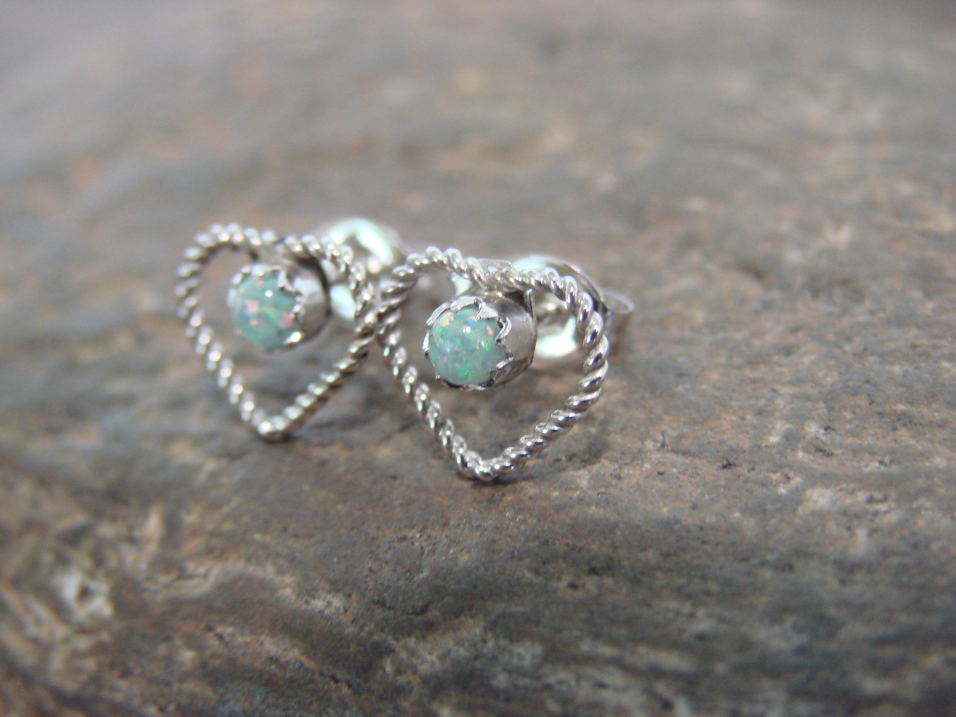 Native American Zuni Indian Sterling Silver & White Opal Heart Earrings from Western New Mexico. These Stunning earrings feature beautiful White Opal Lab Opal stones. The stones are polished and set into crown sterling silver bezel settings. Surrounding the stones are smooth twisted Hearts in Sterling Silver. Zuni Indian Handmade by Hazel Pablito. Unsigned. Free Shipping and Gift Box included!