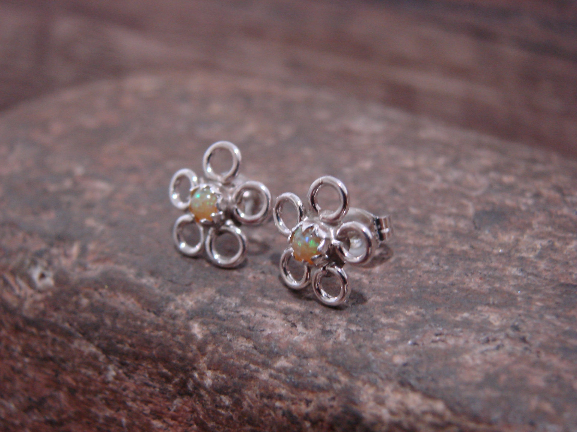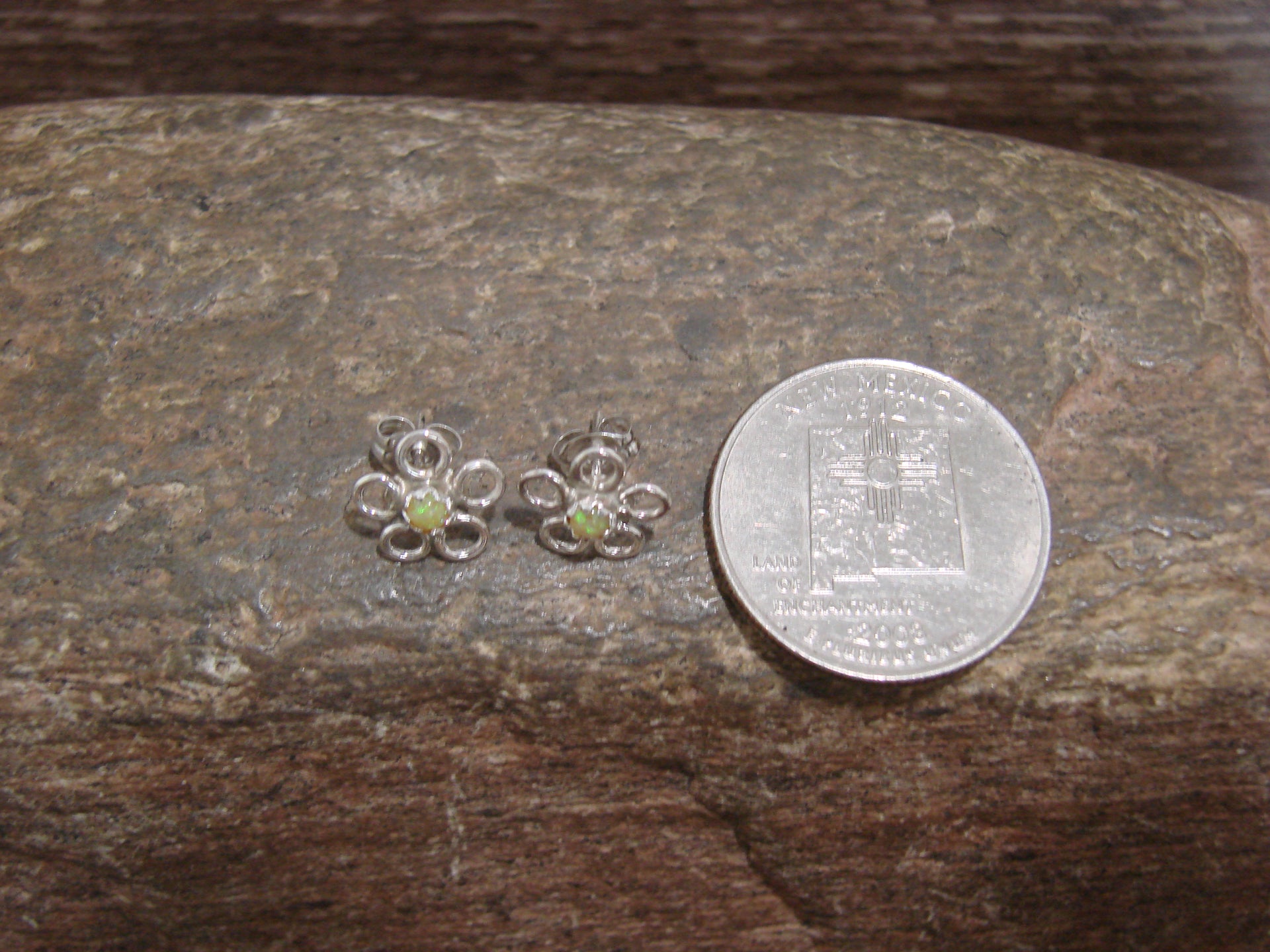 Native American Zuni Indian Sterling Silver & Yellow Opal Floral Stud Post Earrings from Western New Mexico. These stunning earrings feature beautiful Lab Opal Stones set into a crown Sterling Silver Flower setting. These earrings are gorgeous! Zuni Indian hand made by Ronald Yatsattie. Unsigned. Free shipping and gift box included!
