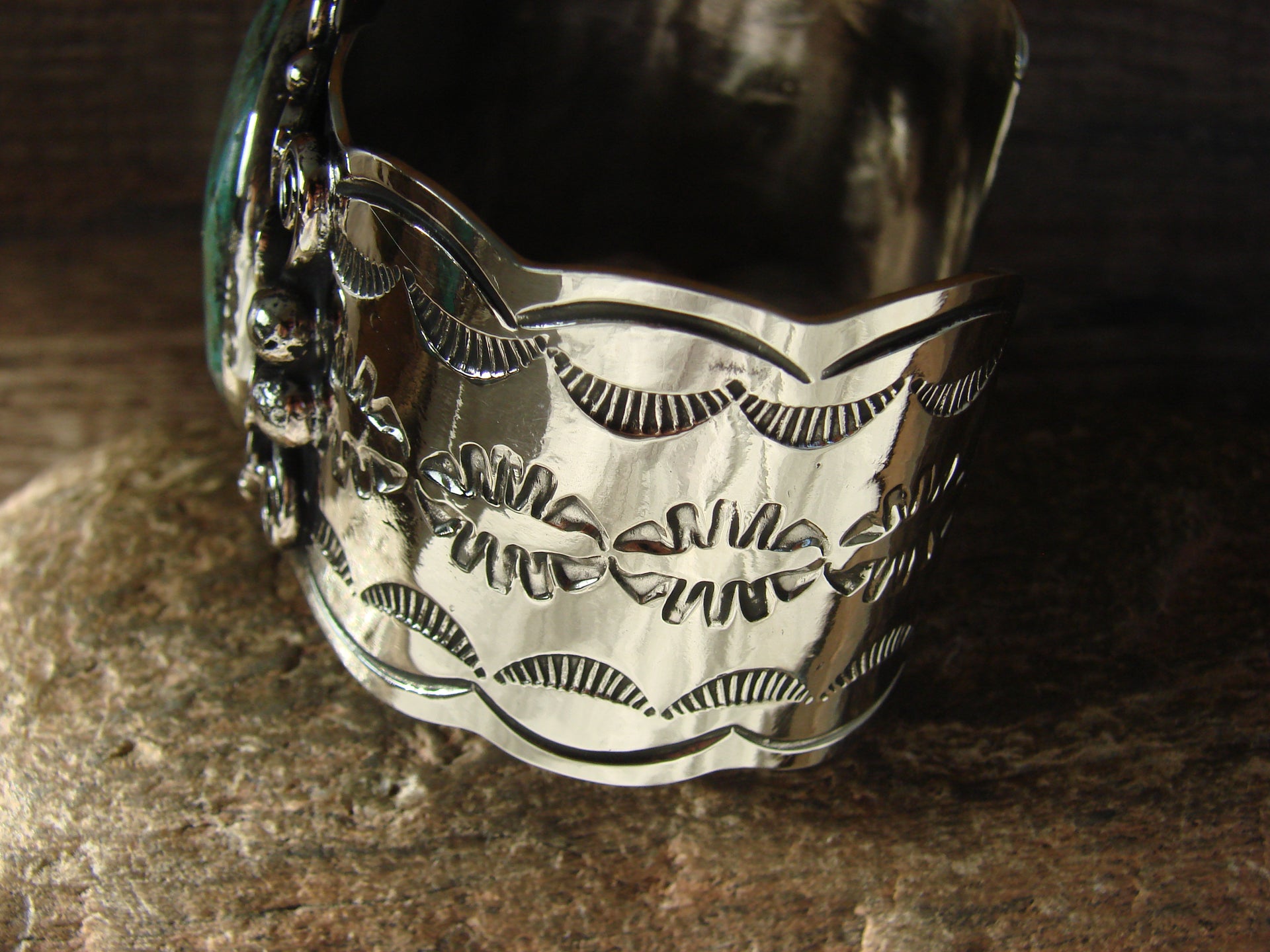 Native American Navajo Indian Handmade Nickel Silver & Turquoise Bracelet from Western New Mexico. This bracelet features a Turquoise stone set into a crown bezel setting. The stone is nicely polished and surrounded by traditional Navajo style design work in Nickel Silver. Navajo Indian handmade by well-known Silversmith Jackie Cleveland. Signed "JC" on the back. Free Shipping with a gift box included!