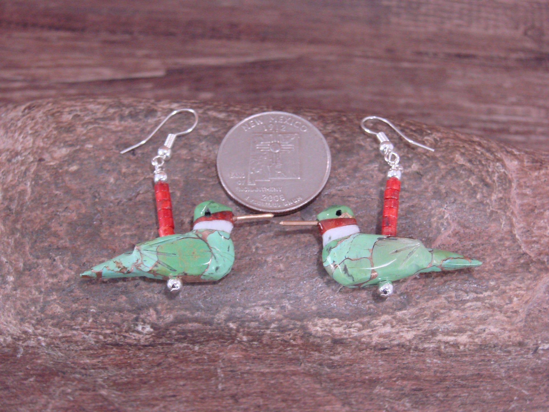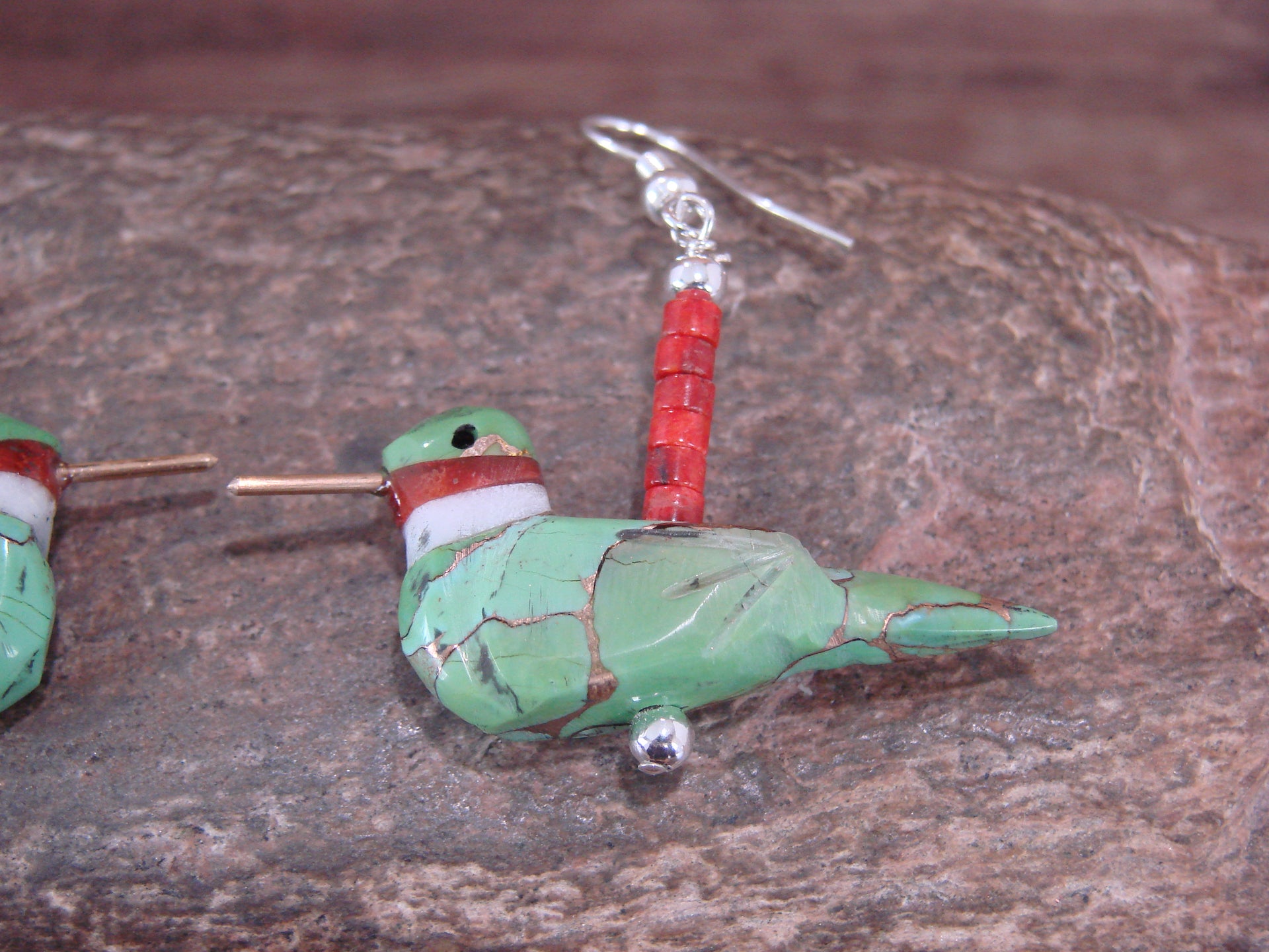 Hand Carved Fetish Earring from New Mexico. These earrings feature beautifully hand carved man made Bronze Infused Gaspeite Aggregate & Apple Coral Hummingbirds. The Hummingbirds are nicely carved. This is a great pair of earrings! Free gift box included! Handmade by Matt Mitchell, although Matt is non-Native American his carving work is some of the best around.