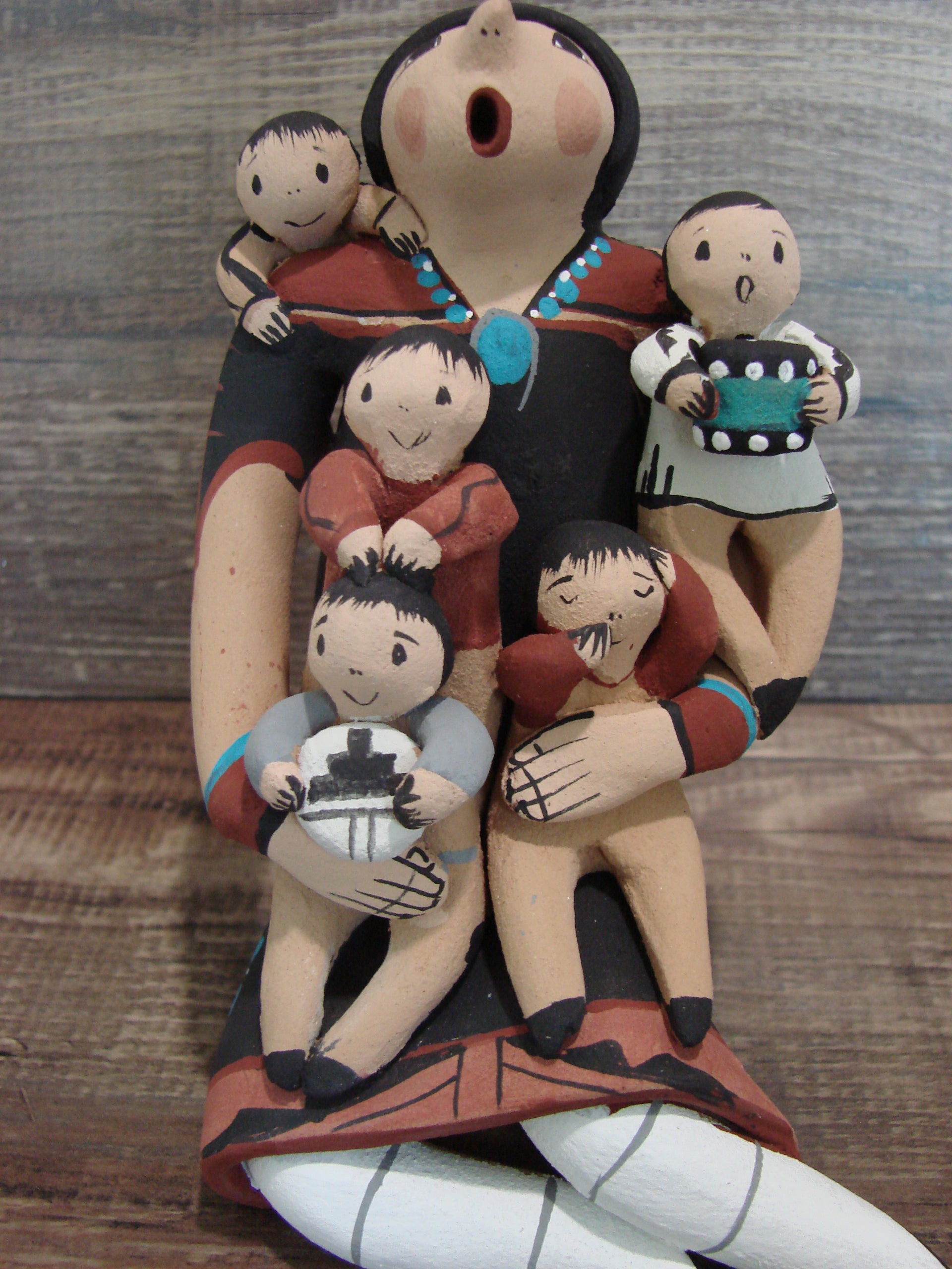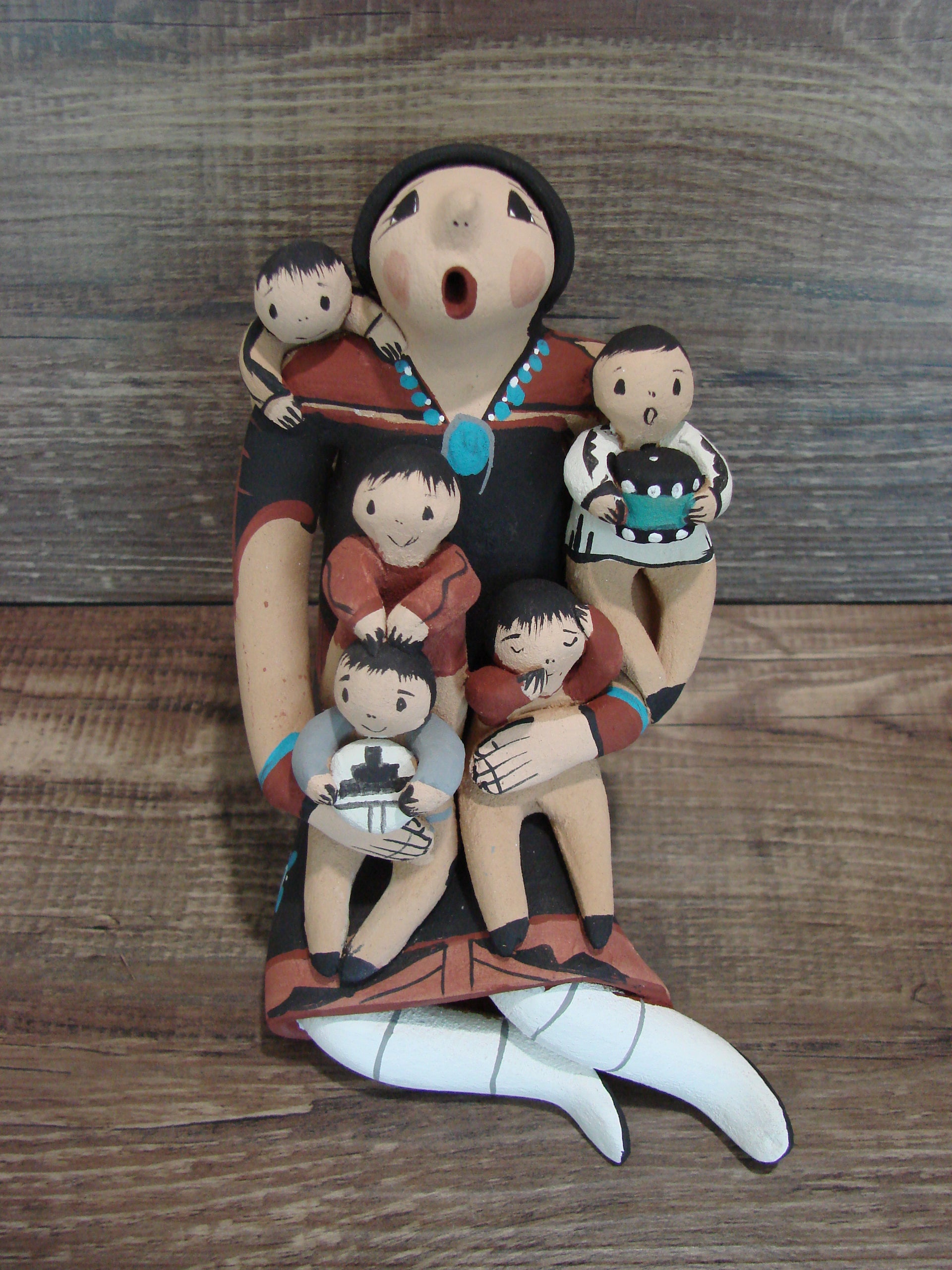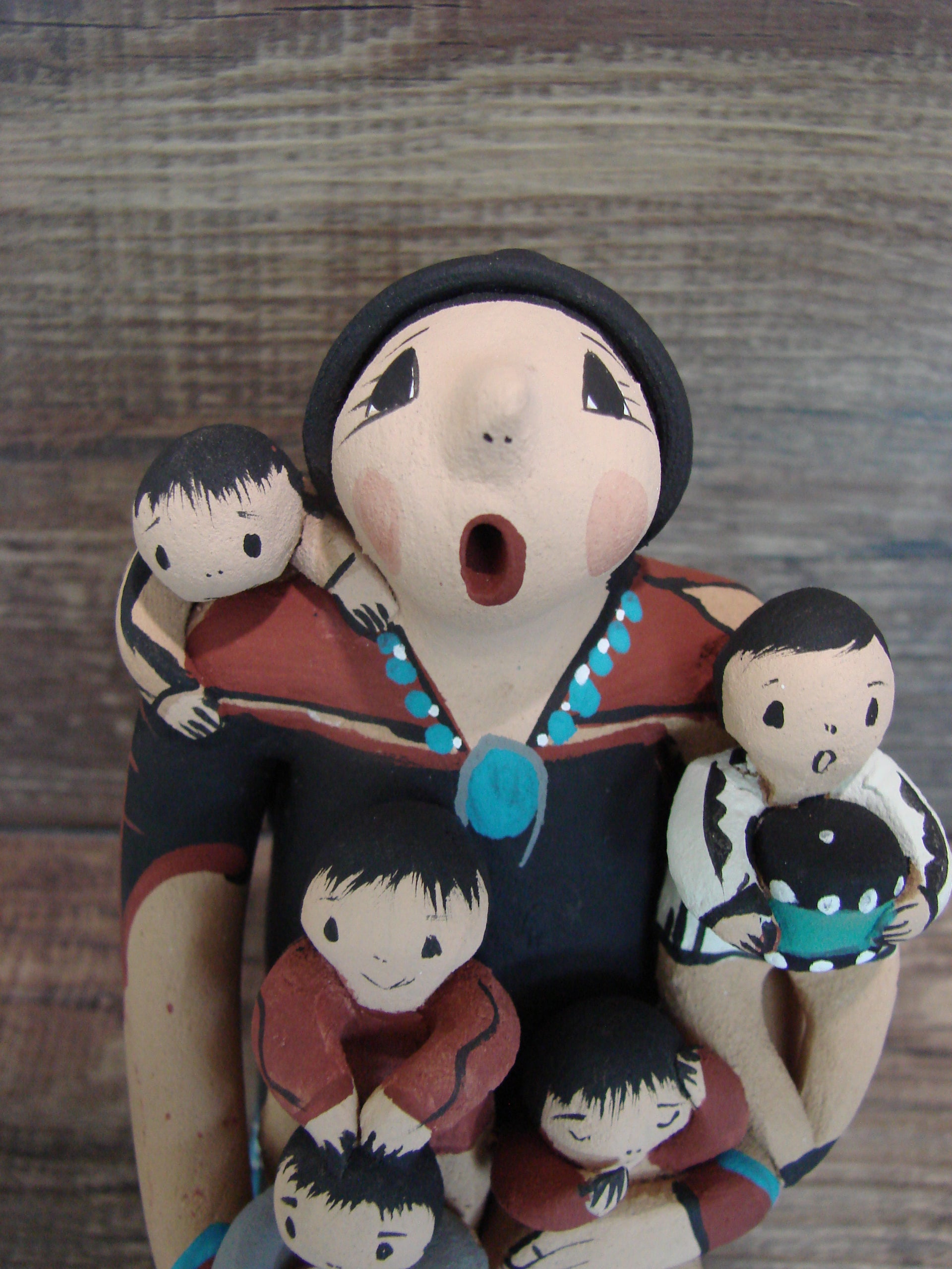 Native American Jemez Indian Hand Made Clay Storyteller from Northern New Mexico. This Stunning Storyteller features a Women singing and holding her children. This piece is handmade with Jemez Mountain Clay. The storyteller is beautifully hand painted throughout. Handmade by D Lucero. Signed on the bottom. Free shipping included!