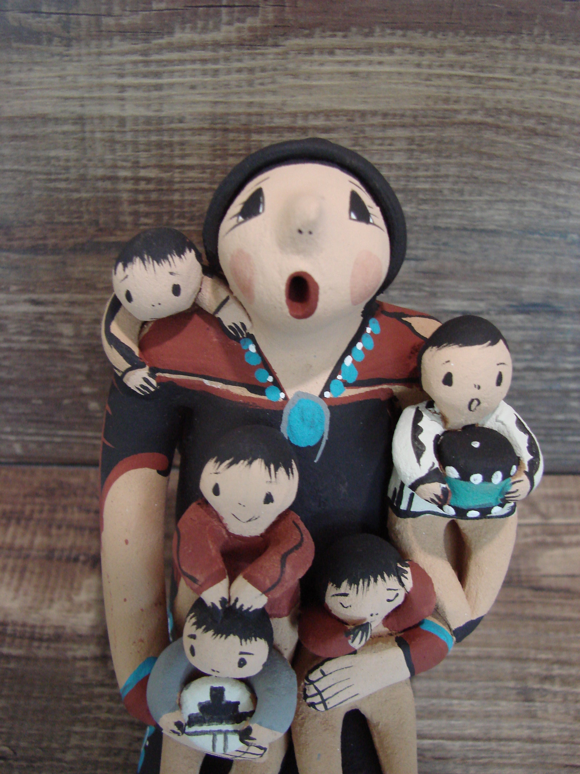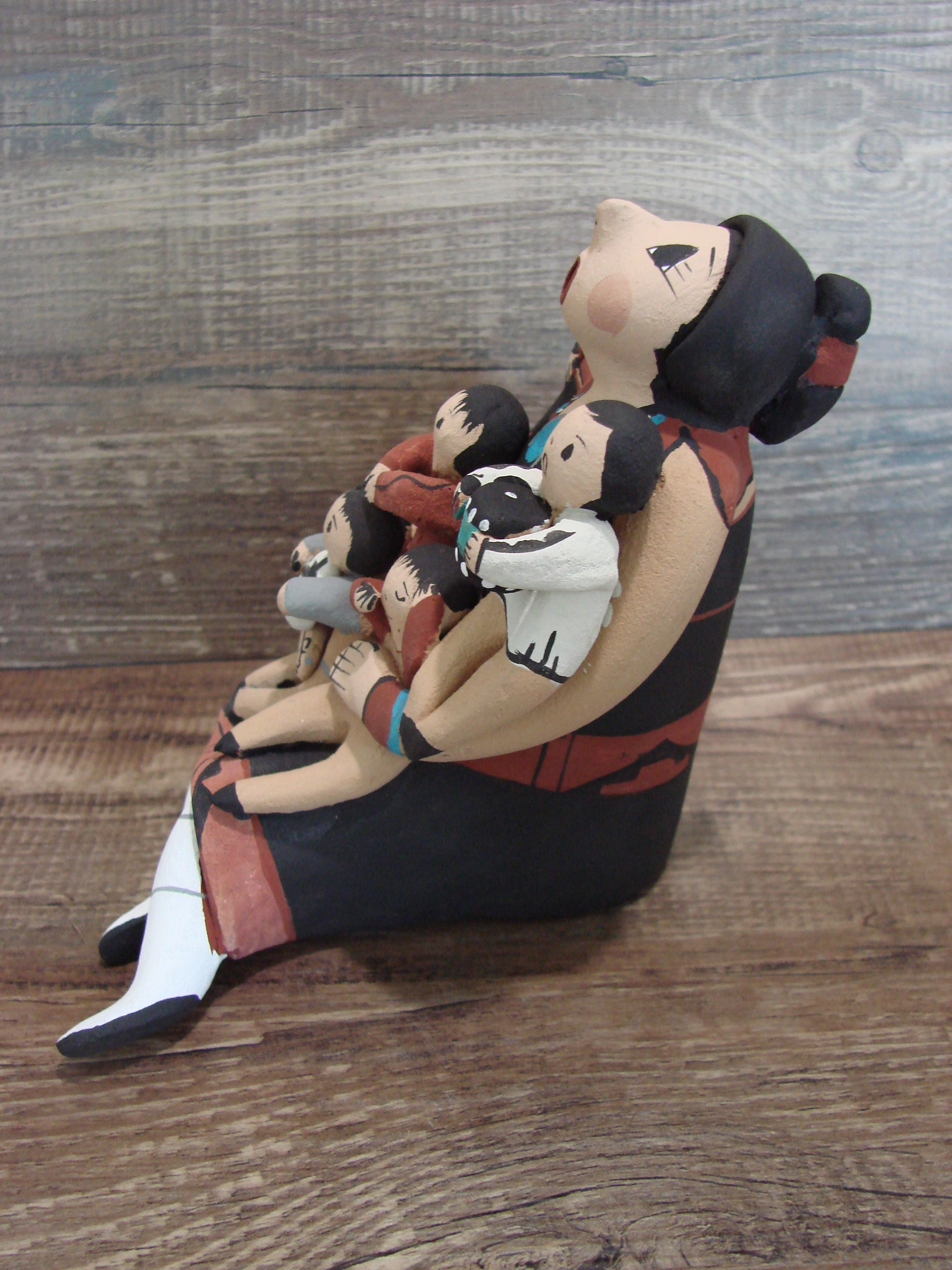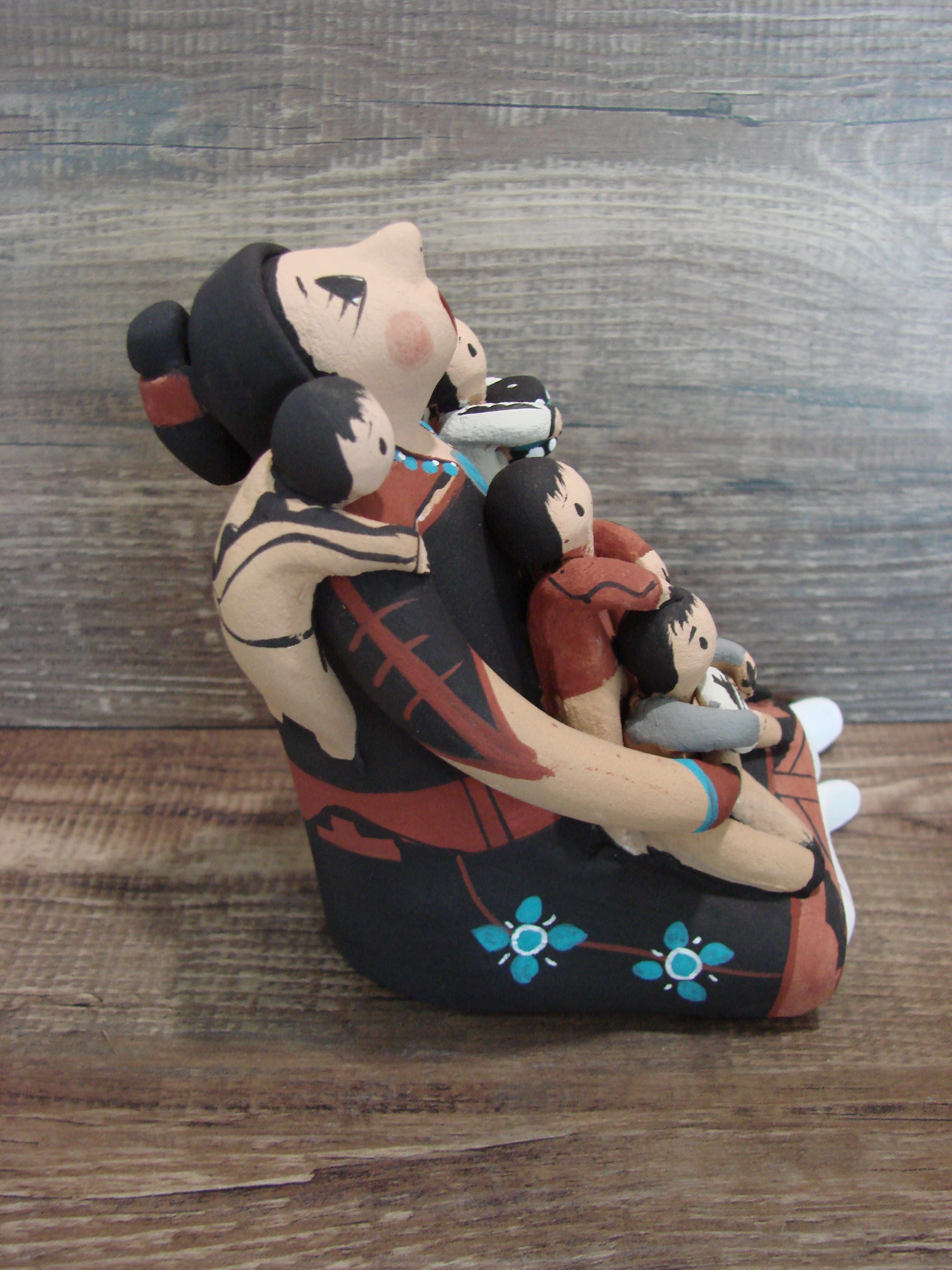 Native American Jemez Indian Hand Made Clay Storyteller from Northern New Mexico. This Stunning Storyteller features a Women singing and holding her children. This piece is handmade with Jemez Mountain Clay. The storyteller is beautifully hand painted throughout. Handmade by D Lucero. Signed on the bottom. Free shipping included!