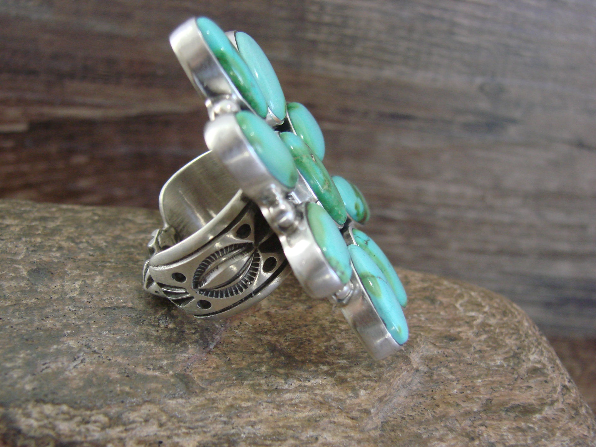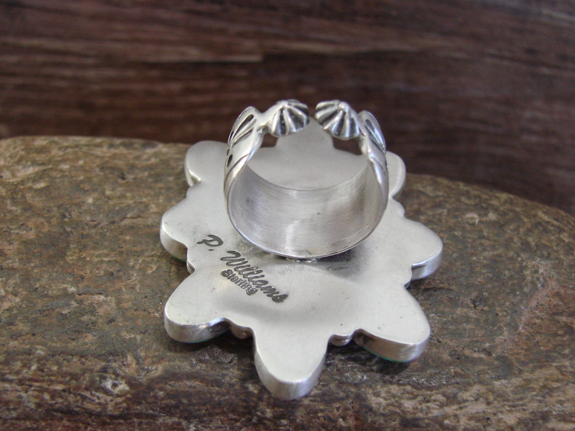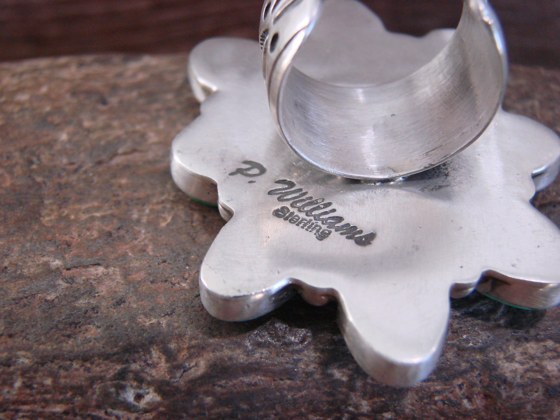 Genuine Native American Navajo Indian Sterling Silver & Sonoran Turquoise Cluster Ring from Western New Mexico. This Gorgeous ring features Genuine Turquoise stones set into smooth Sterling Silver bezel settings. Beautiful details in Sterling Silver Surround the Stones. The stones are polished and have a Stunning look! Handmade by Navajo Silversmith P. Williams. Signed "P. Williams" and Stamped "Sterling" on the back. Free gift box and shipping included!