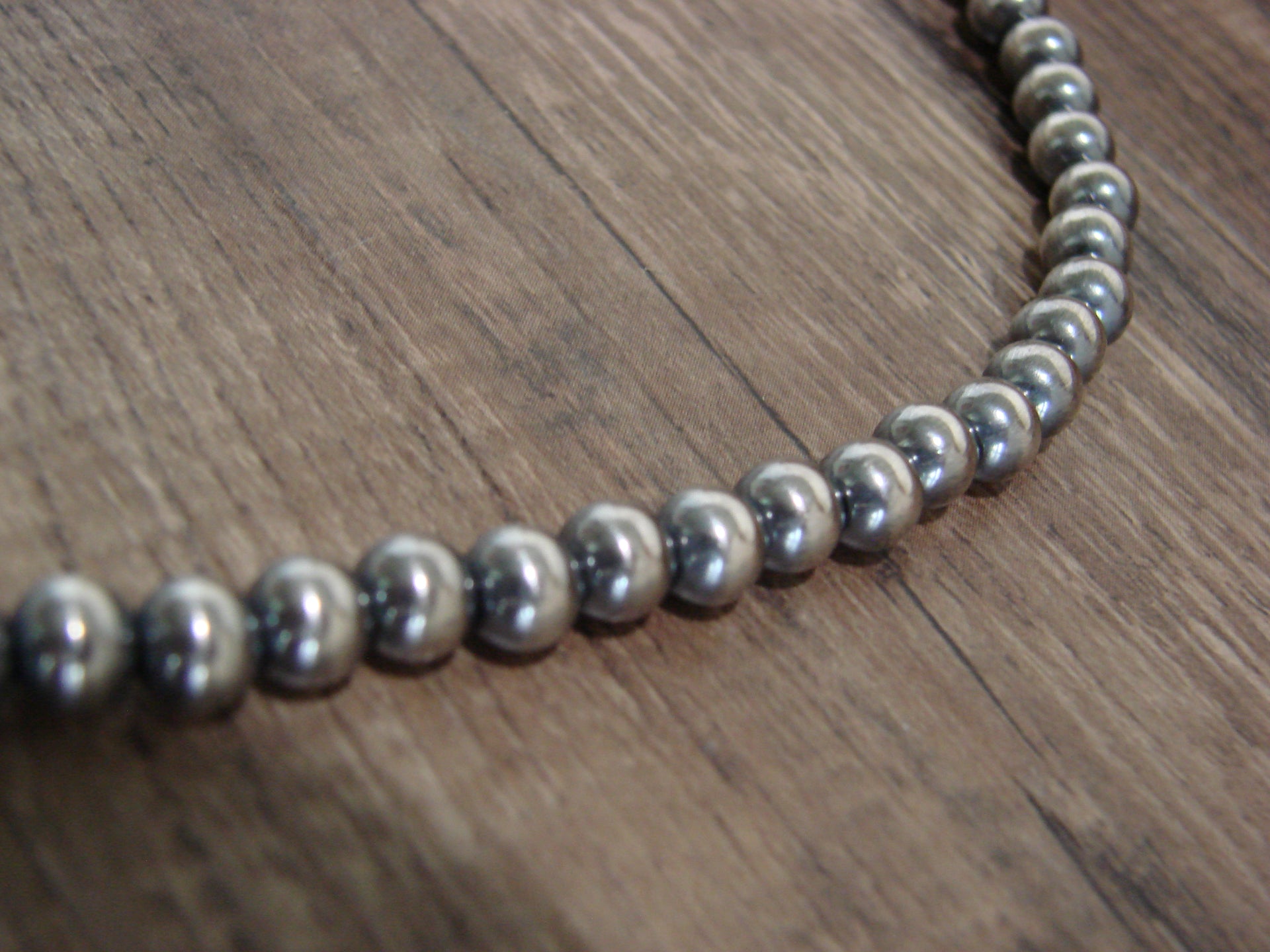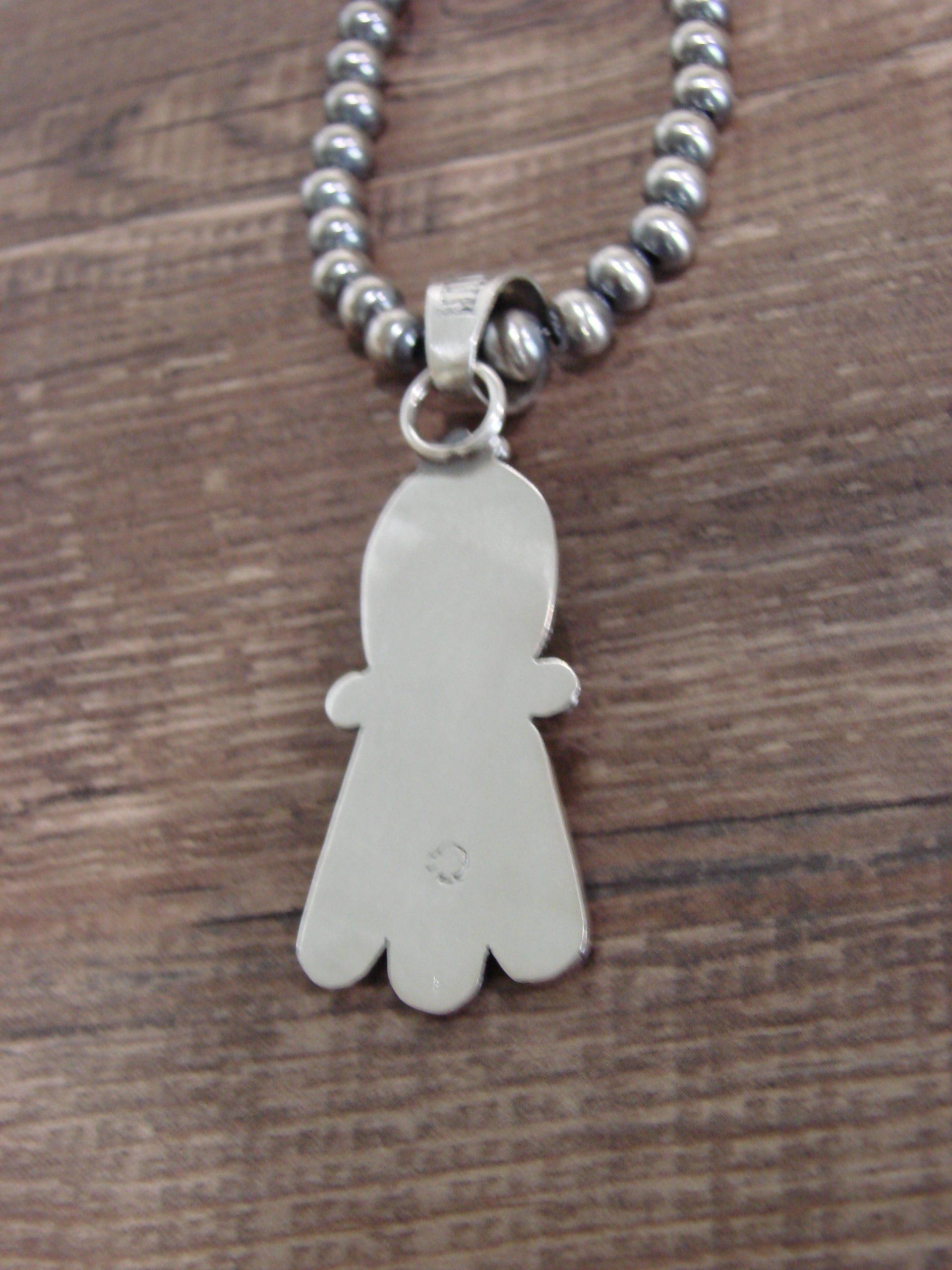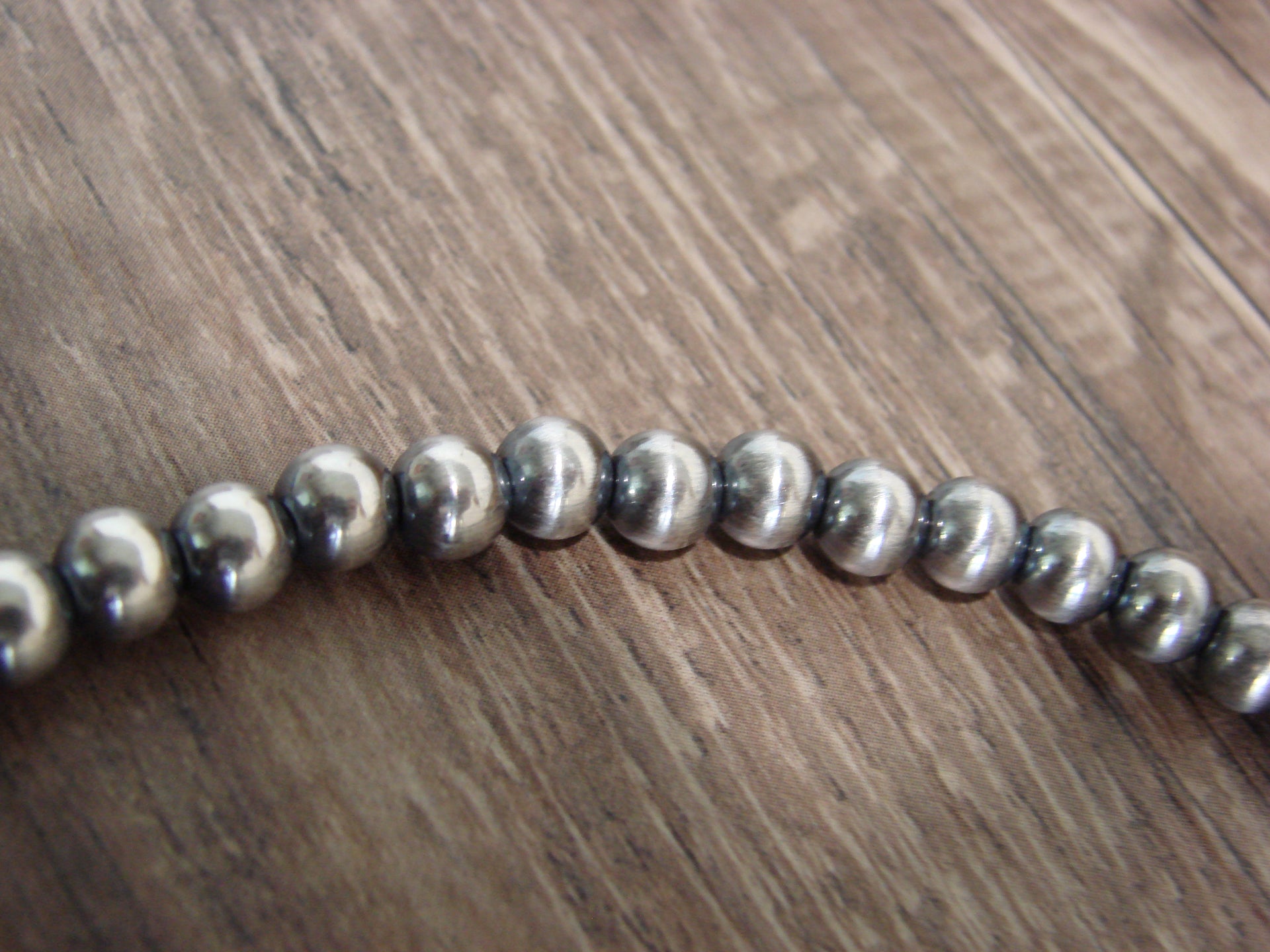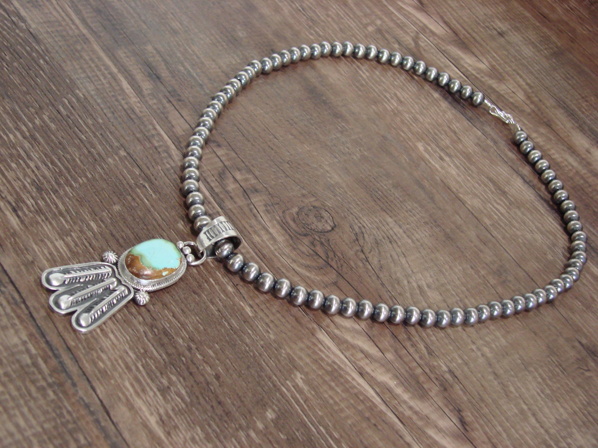 Genuine Native American Navajo Indian Sterling Silver & Turquoise Navajo Pearl Necklace from Western New Mexico. This Stunning Necklace features a Genuine Sonoran Turquoise stone beautifully set into smooth Sterling Silver bezel setting. Hand Stamping and Gorgeous details in Sterling Silver surround the Stones. Hand Made to Perfection, this piece dangles at the center of an 18", 6 mm String of Navajo Pearls! Handmade by Navajo Silversmith Verley Betone. Hallmarked on the back. Free Shipping and Gift Box included!