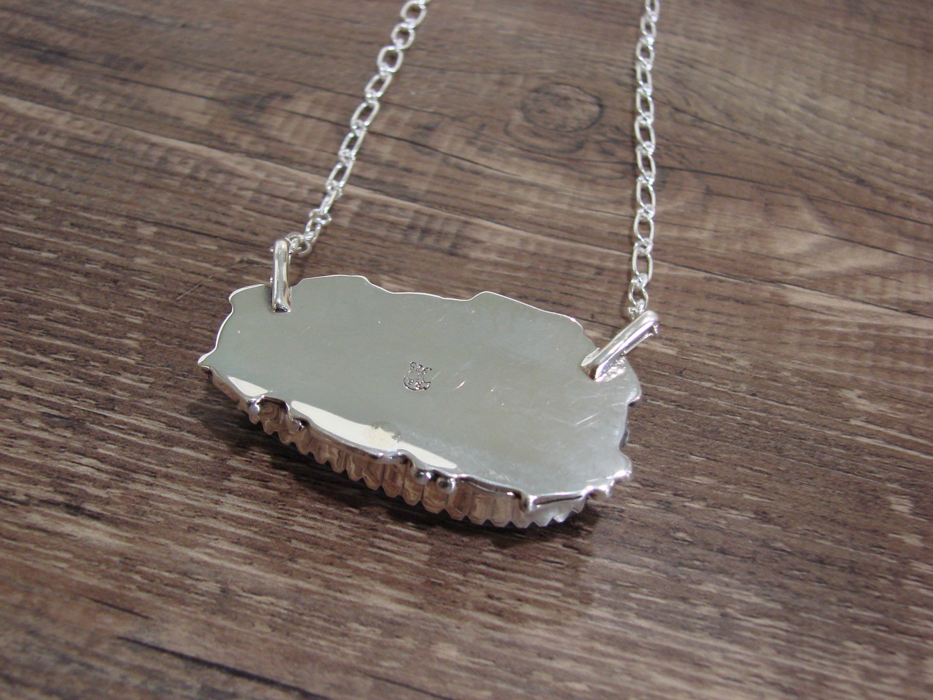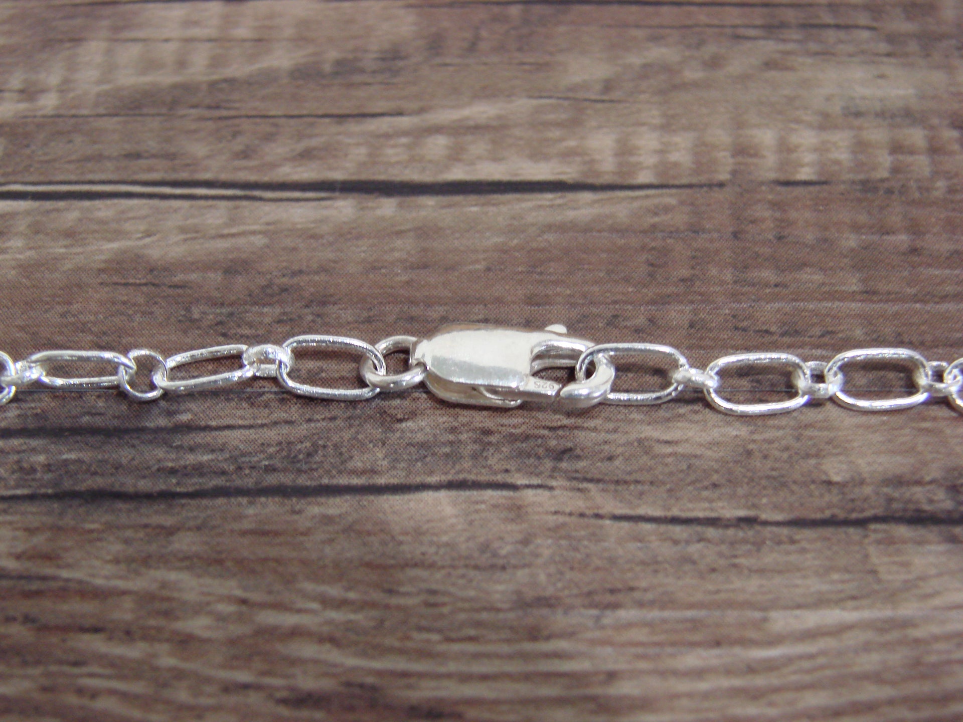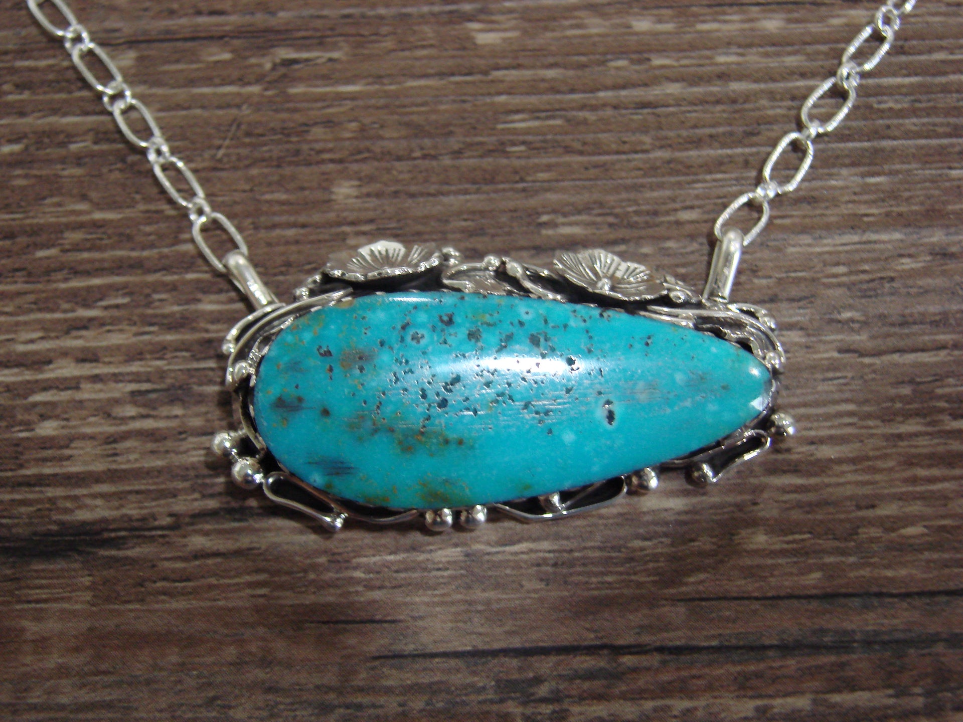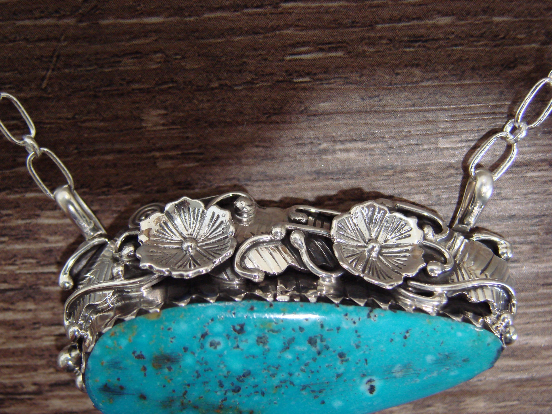 Genuine Native American Navajo Indian Sterling Silver & Turquoise Floral Chain Link Necklace. This Stunning Hand Made necklace features a Genuine Turquoise Stone intricately set into a Crown Sterling Silver bezel setting. Beautiful details in Sterling Silver and Hand Stamping surround the stone. This is a great necklace that can be adjusted to desired length with the Hade Made Sterling Silver links! Expertly Handmade by Navajo silversmith Evelyn Bahe. Hallmarked on the back. Free gift box and shipping included!