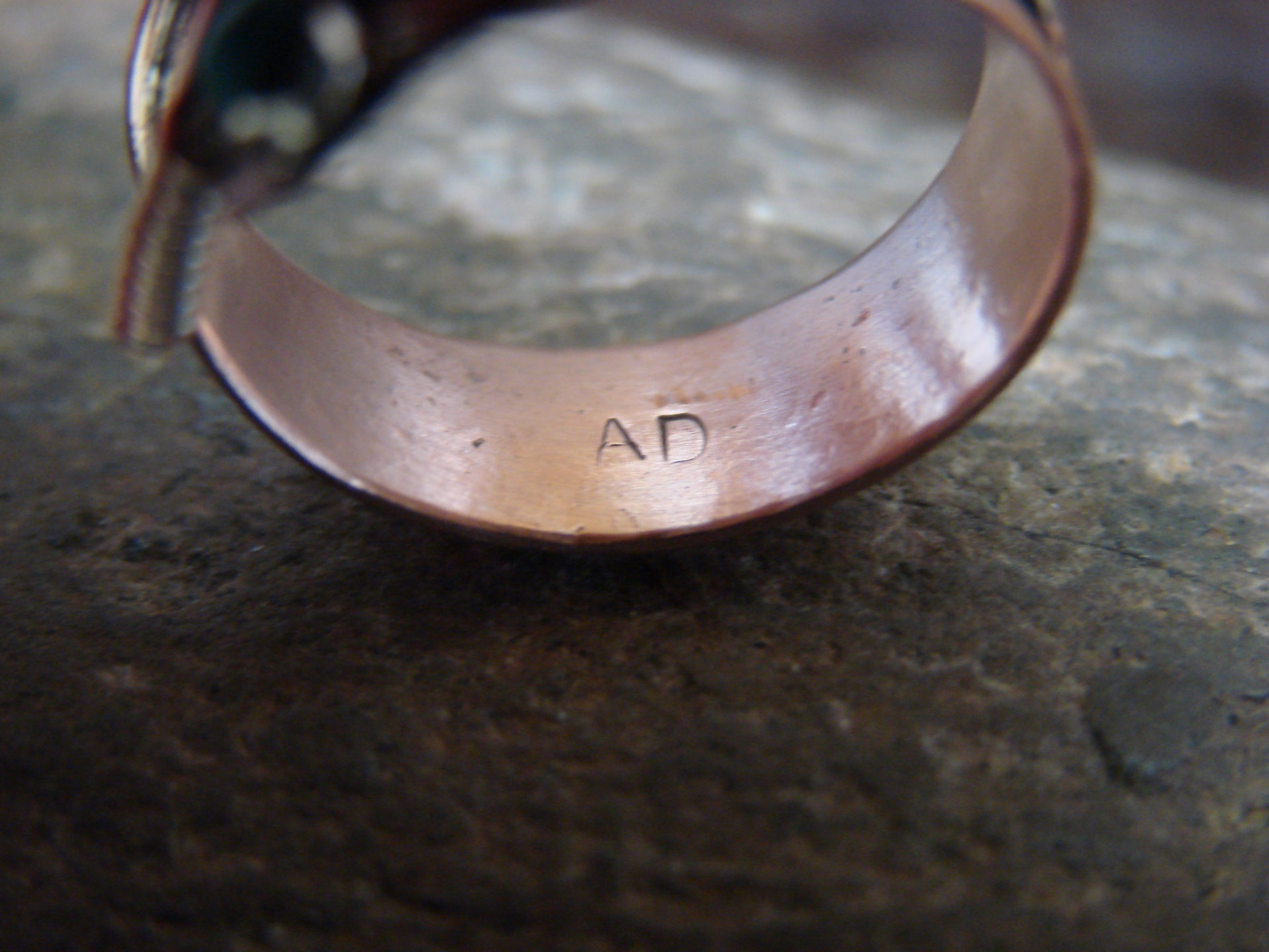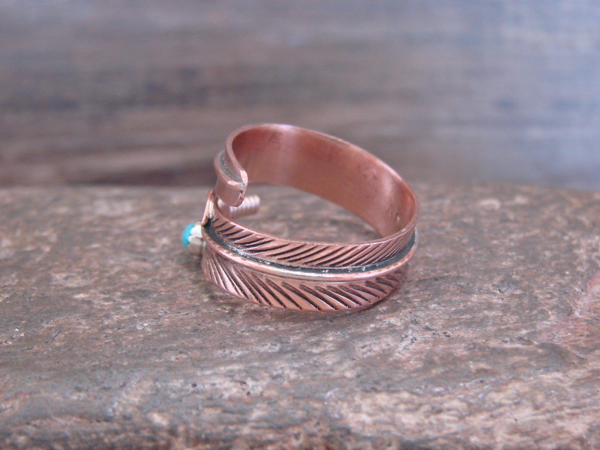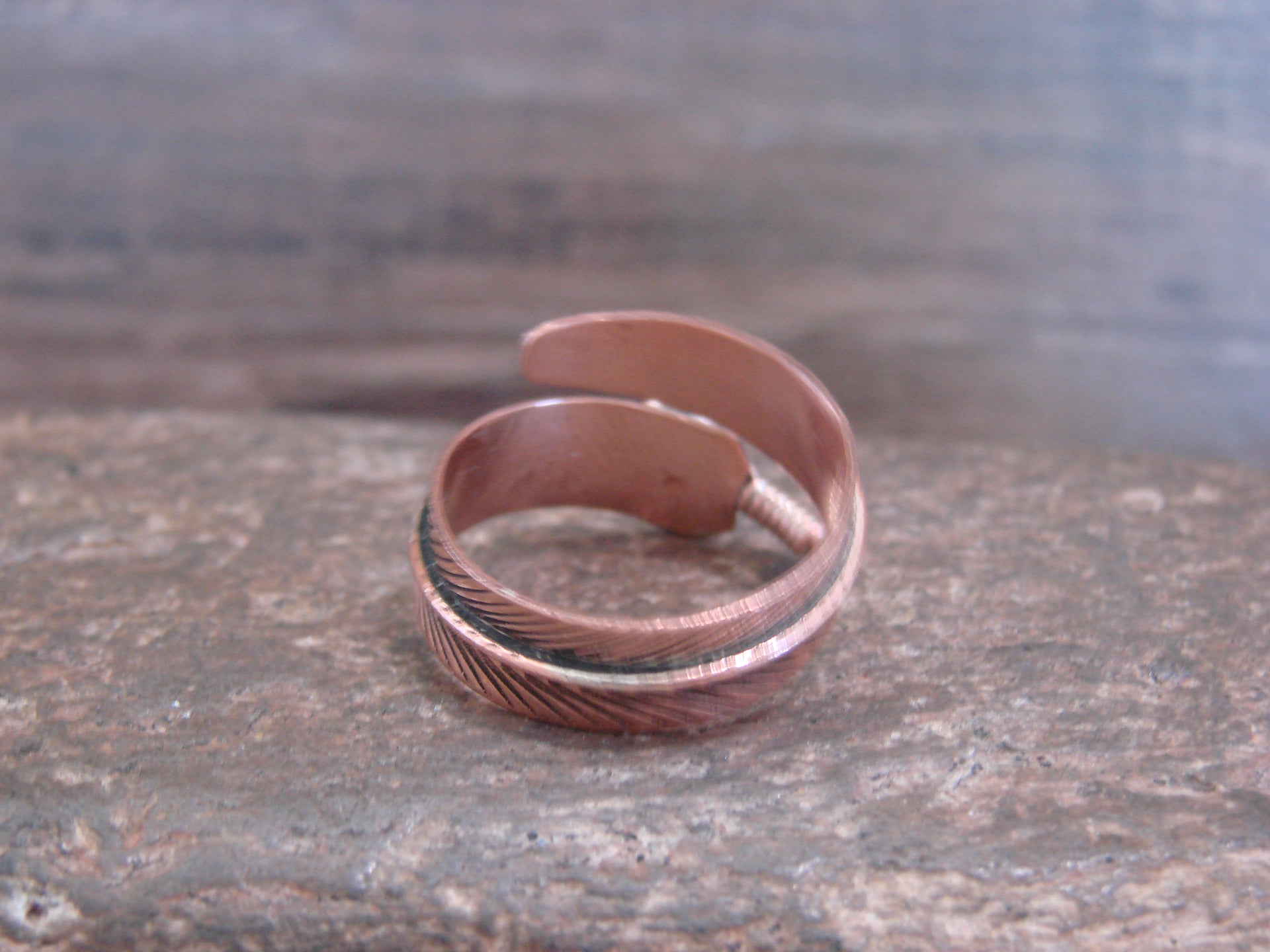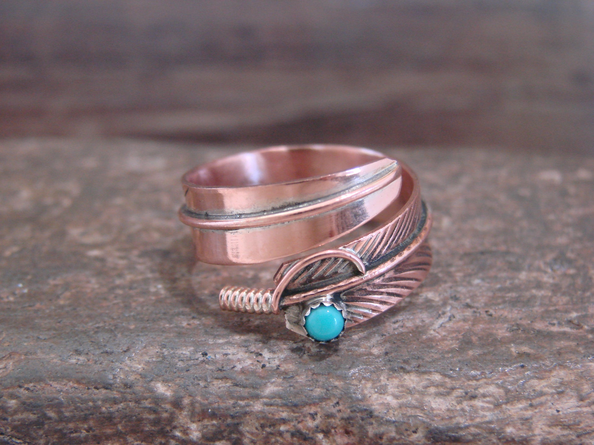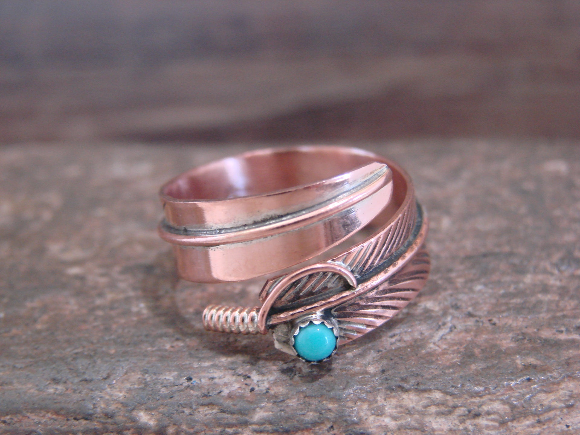 Genuine Native American Navajo Indian Copper Ring from Western New Mexico. This Stunning ring features beautiful hand stamping throughout a Copper Feather. This is a very nice ring that can be easily adjustable from size 6-9! Navajo Indian handmade by Aaron Davis. Signed "AD" on the inner band. Free Gift Box and Shipping included!