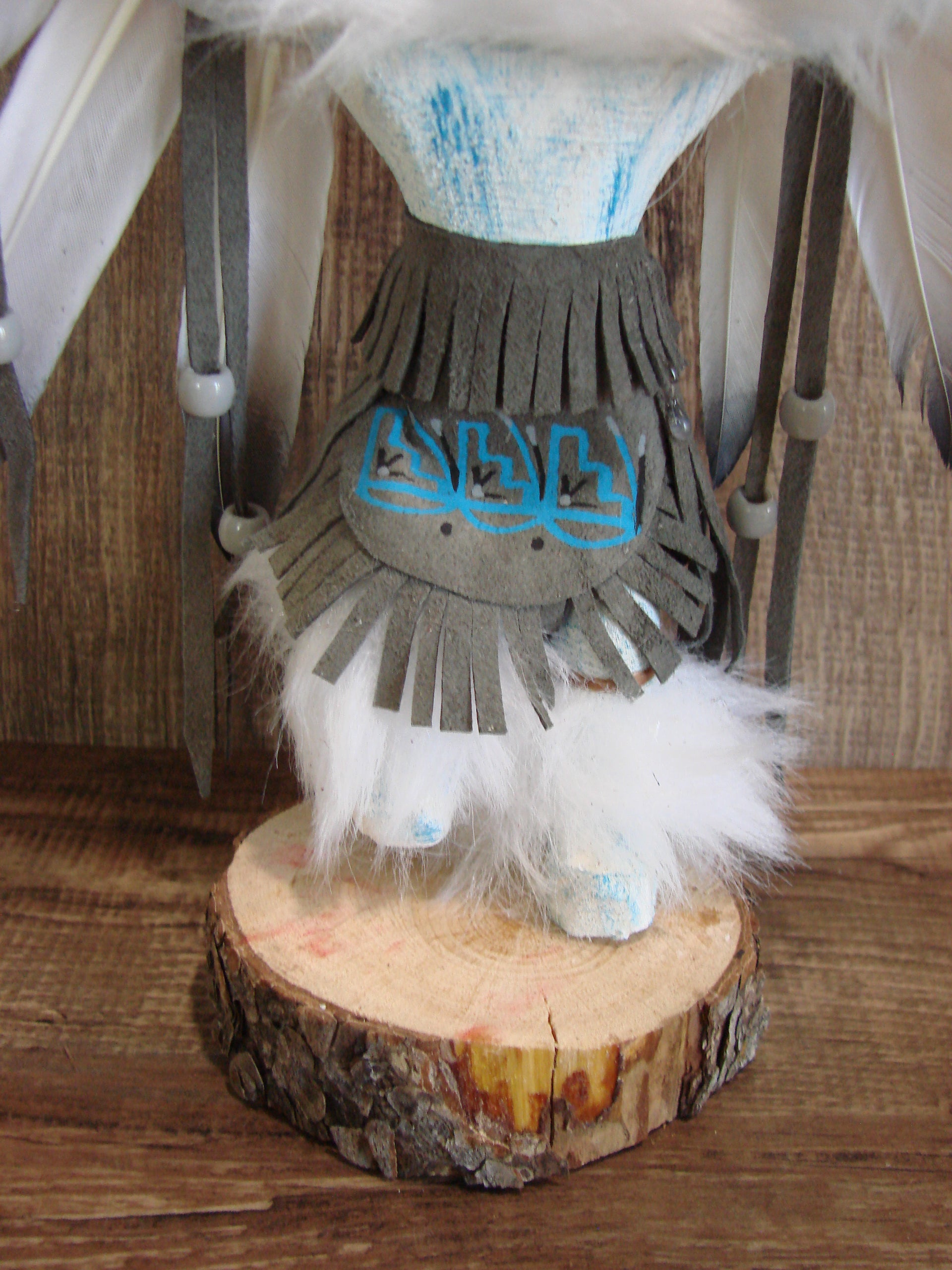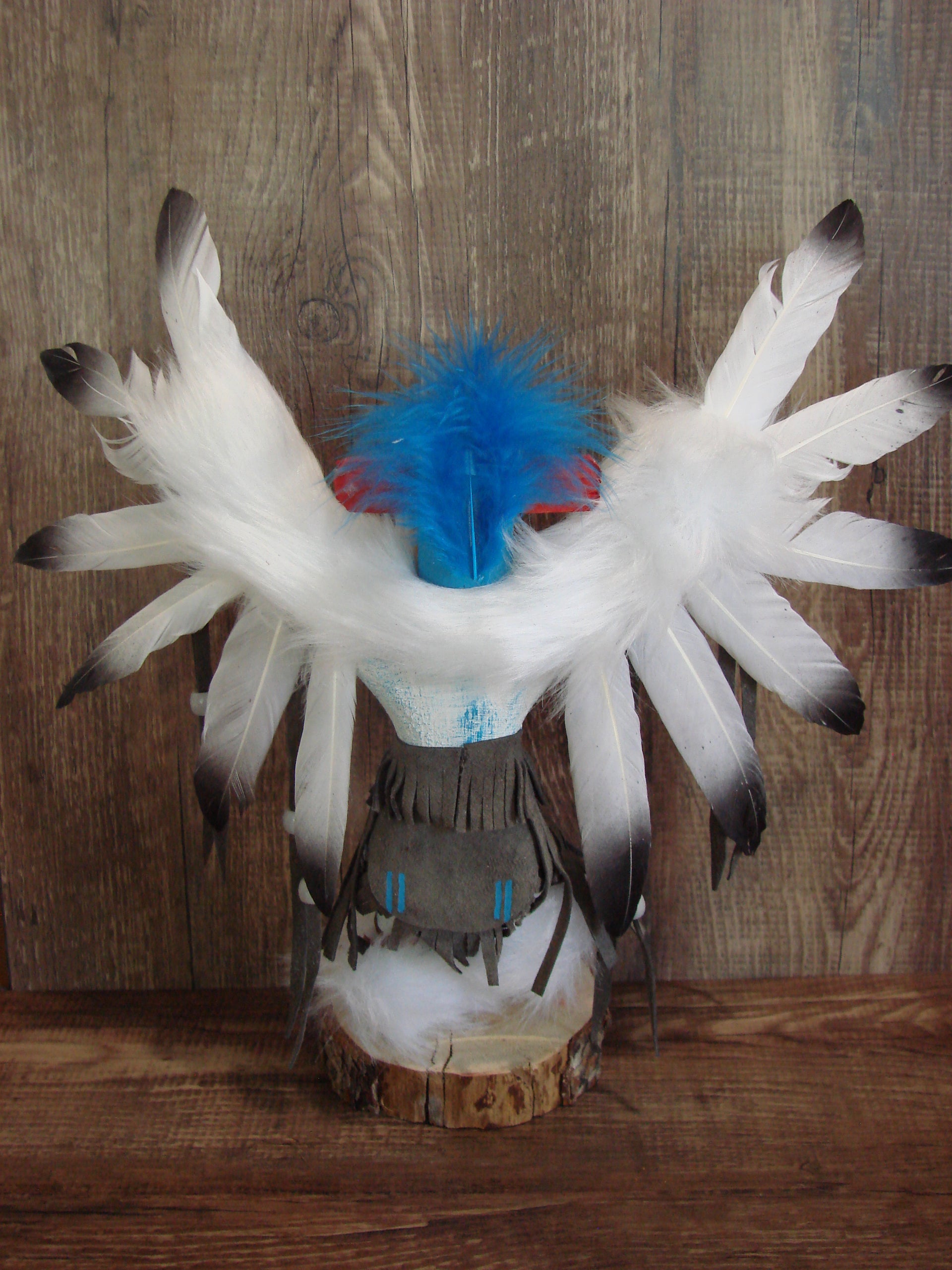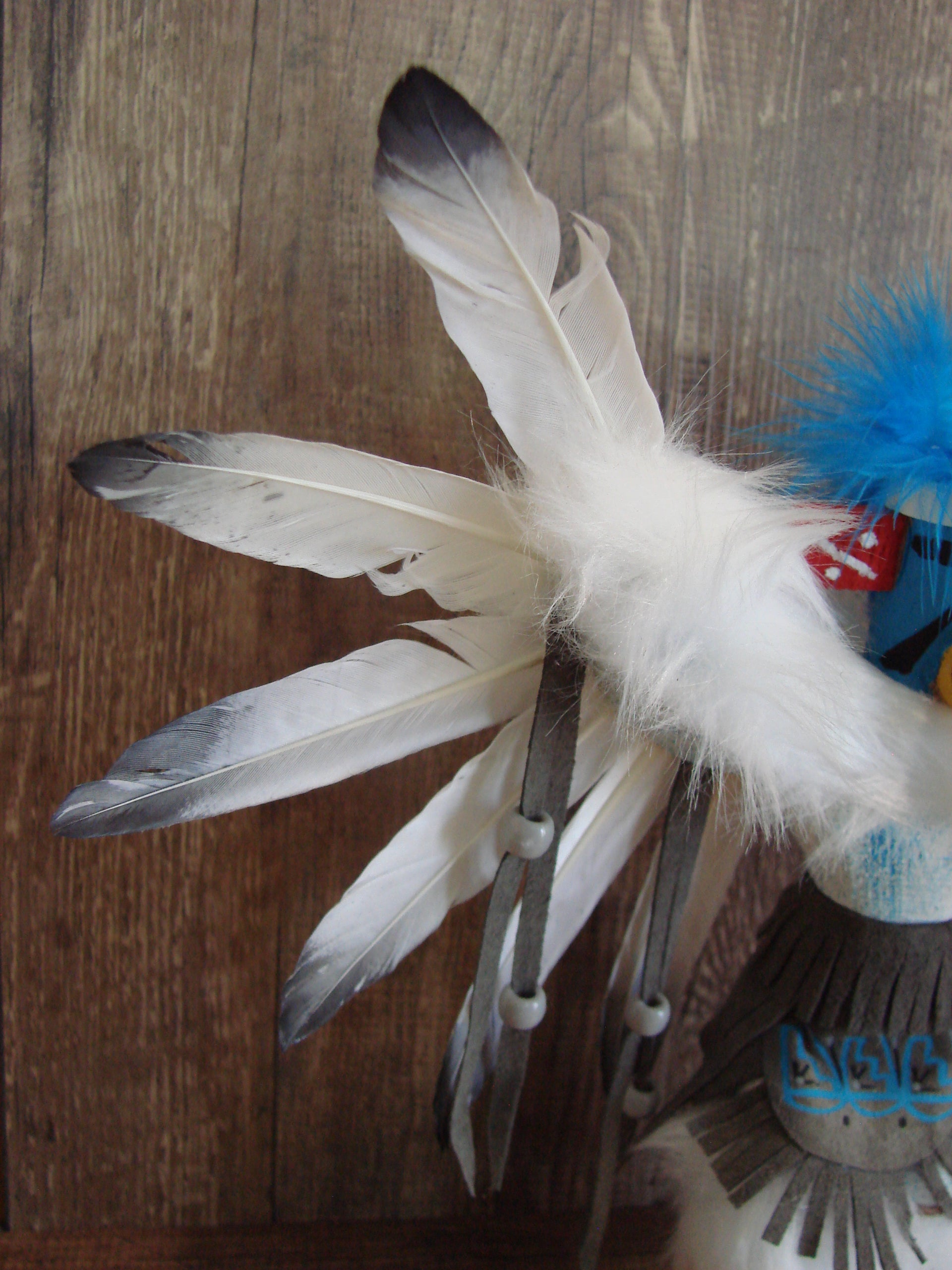 Native American Navajo Indian Kachina Dancer from the Navajo Nation. This Kachina features beautiful hand painting and hand carving from top to bottom. This Kachina is carved into pine and decorated with feathers, Rabbit Fur, and leather. Navajo Indian Handmade and Signed by M. Lonjose on the base. Free shipping included!