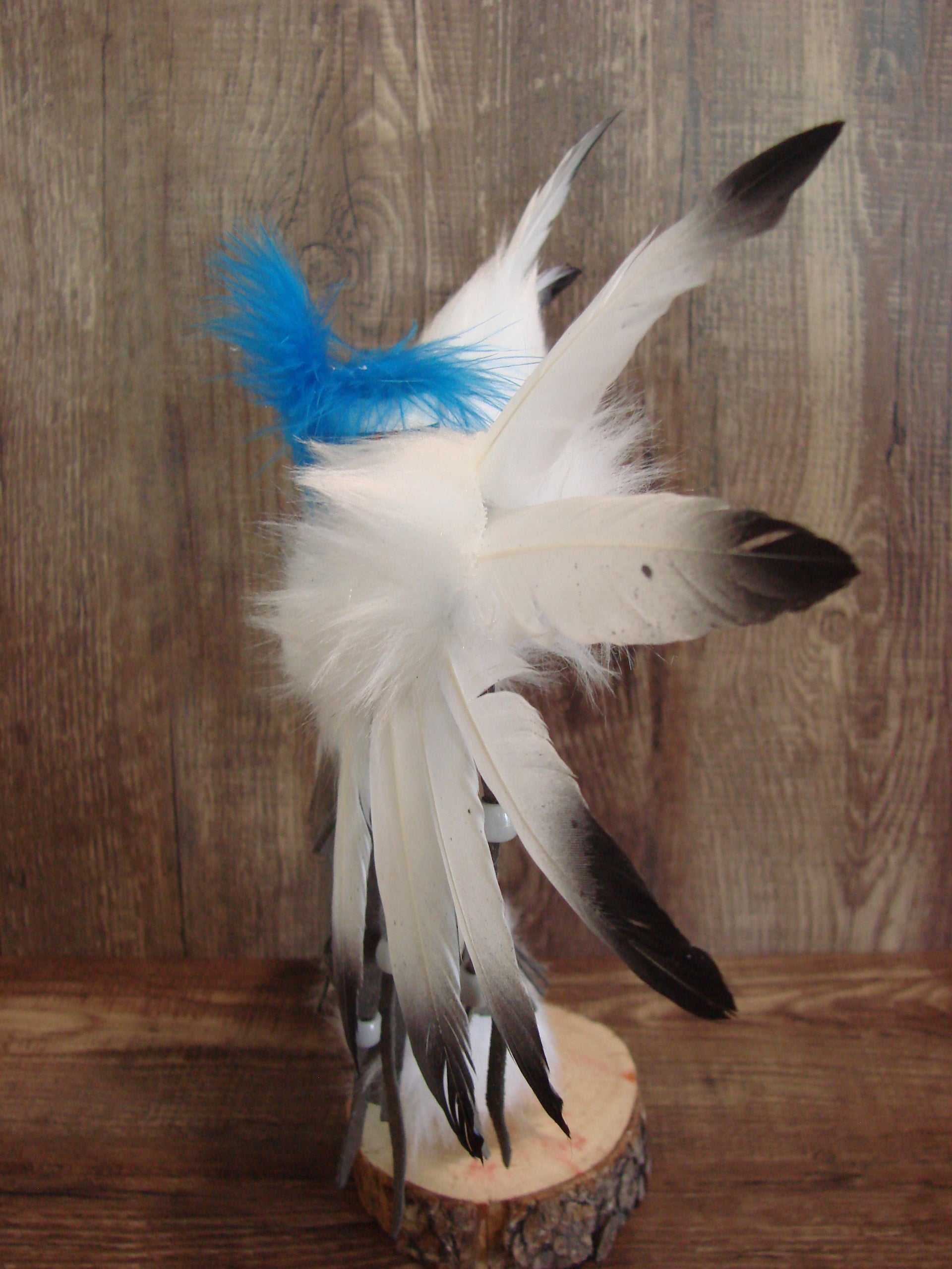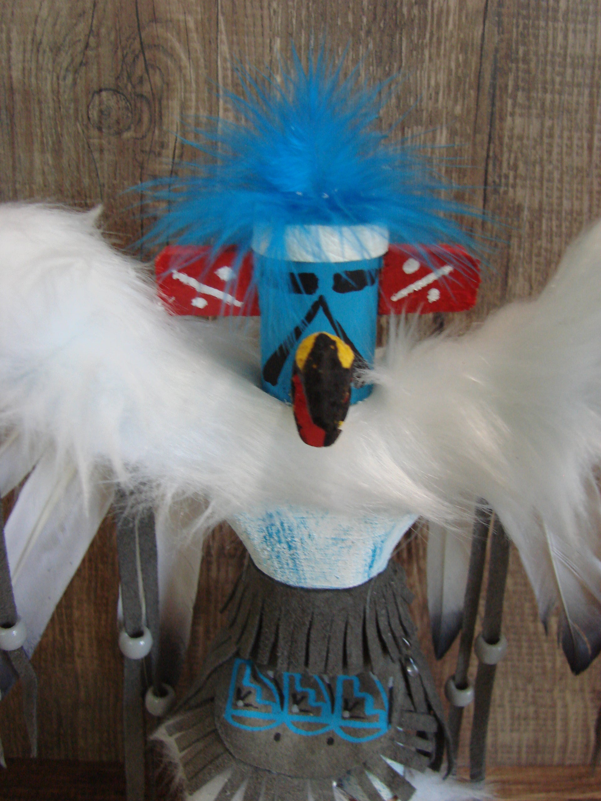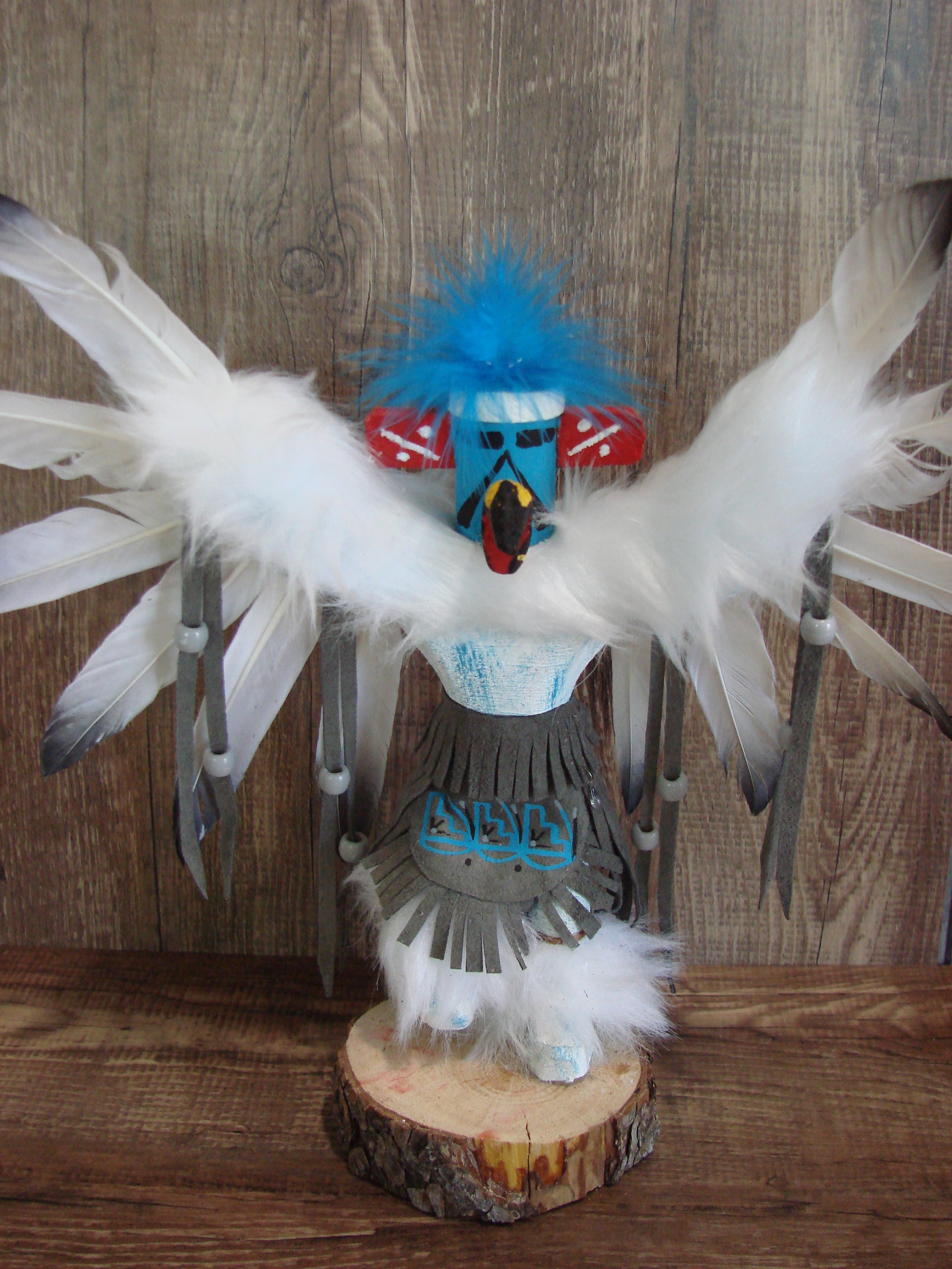 Native American Navajo Indian Kachina Dancer from the Navajo Nation. This Kachina features beautiful hand painting and hand carving from top to bottom. This Kachina is carved into pine and decorated with feathers, Rabbit Fur, and leather. Navajo Indian Handmade and Signed by M. Lonjose on the base. Free shipping included!