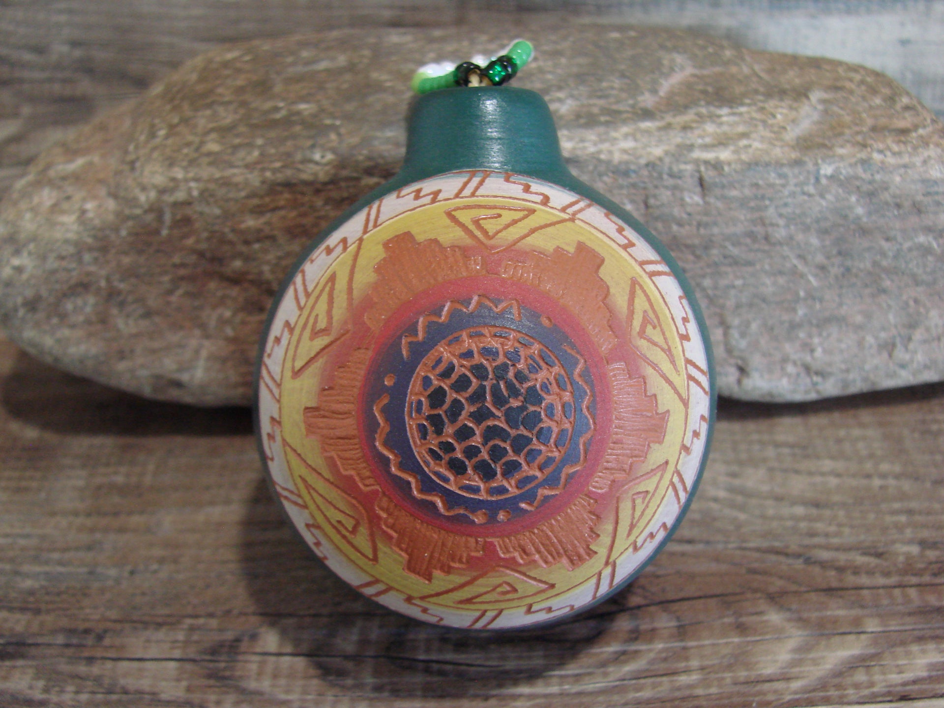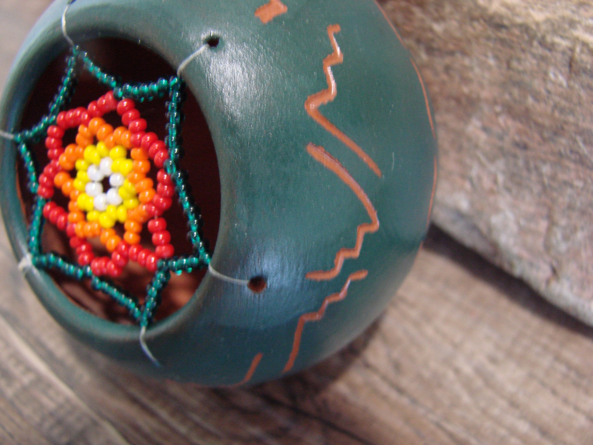 Genuine Native American Navajo Indian Hand Etched, Hand Painted, and Hand Beaded Dream Catcher Ornament Pottery from Western New Mexico. This Beautiful Hand Made Masterpiece features Stunning Details and Navajo patterns throughout! Hand Made by Kianna Benally. Signed on the bottom. Free shipping included!