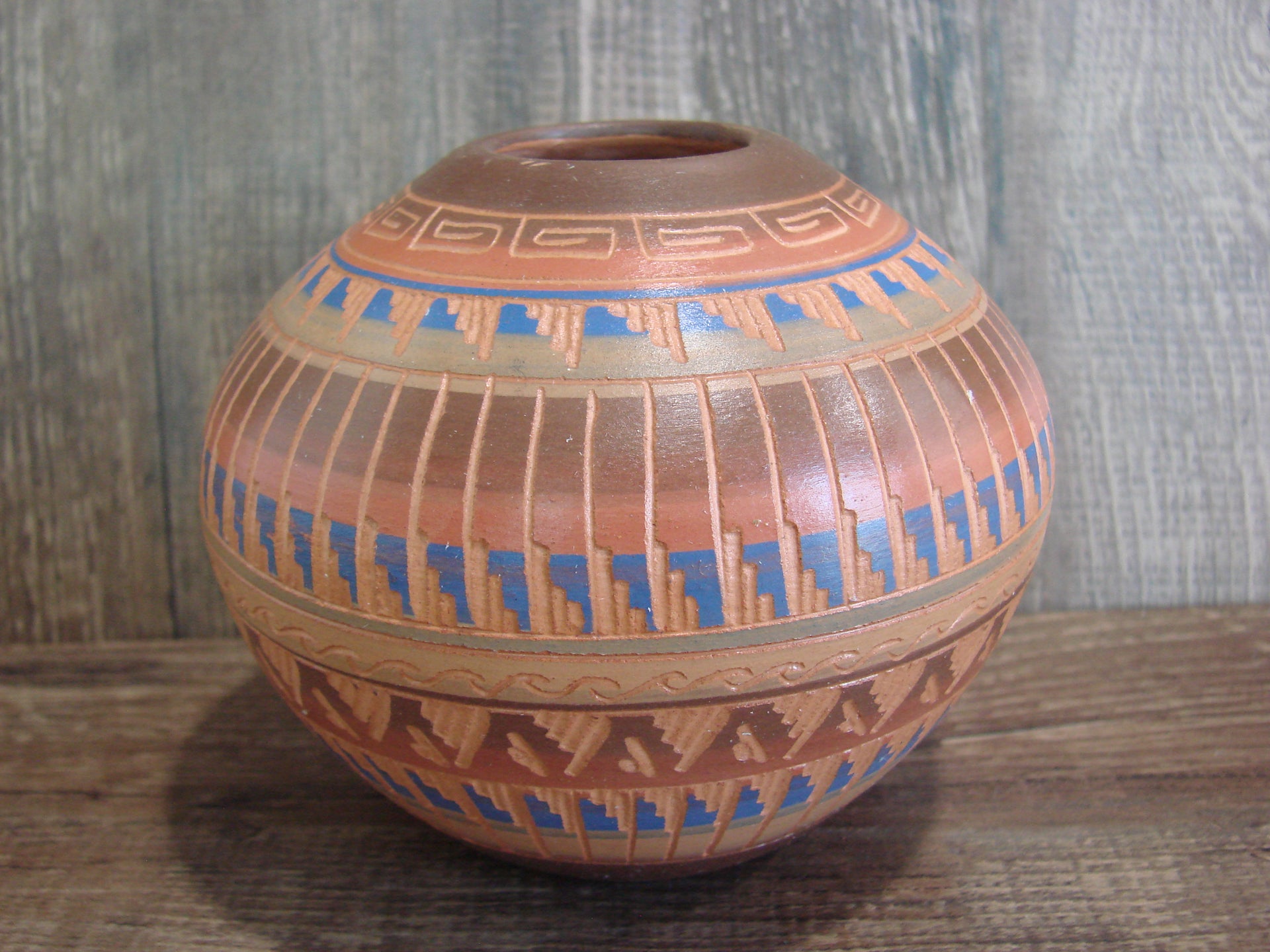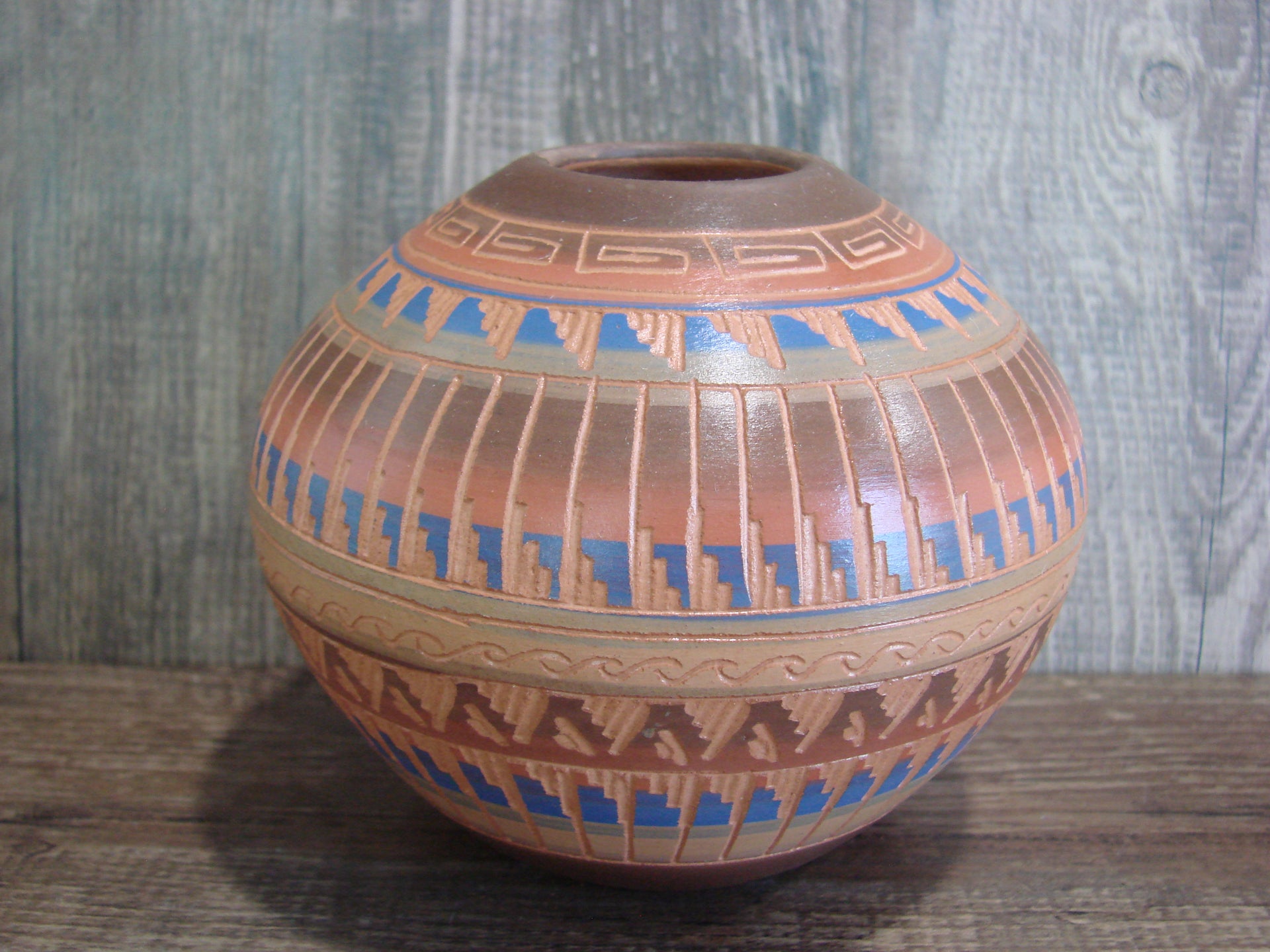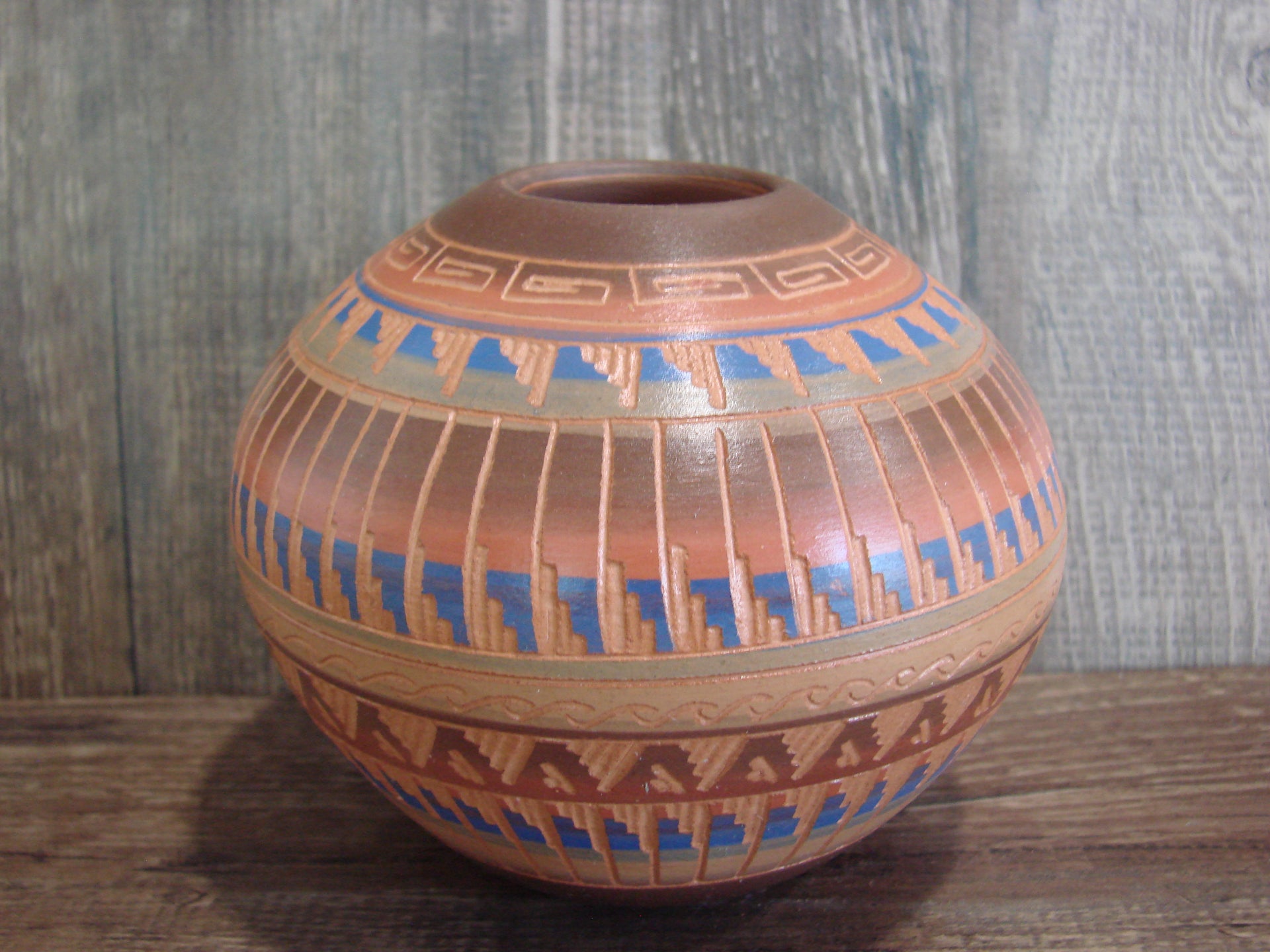 Genuine Native American Navajo Indian Hand Etched and Hand Painted Pottery from Western New Mexico. This beautiful piece of pottery features stunning Hand Painted and traditional Hand Etched Navajo patterns throughout. Hand etched and painted by E. Gilmore. Signed "EG" on the bottom. Free shipping included!