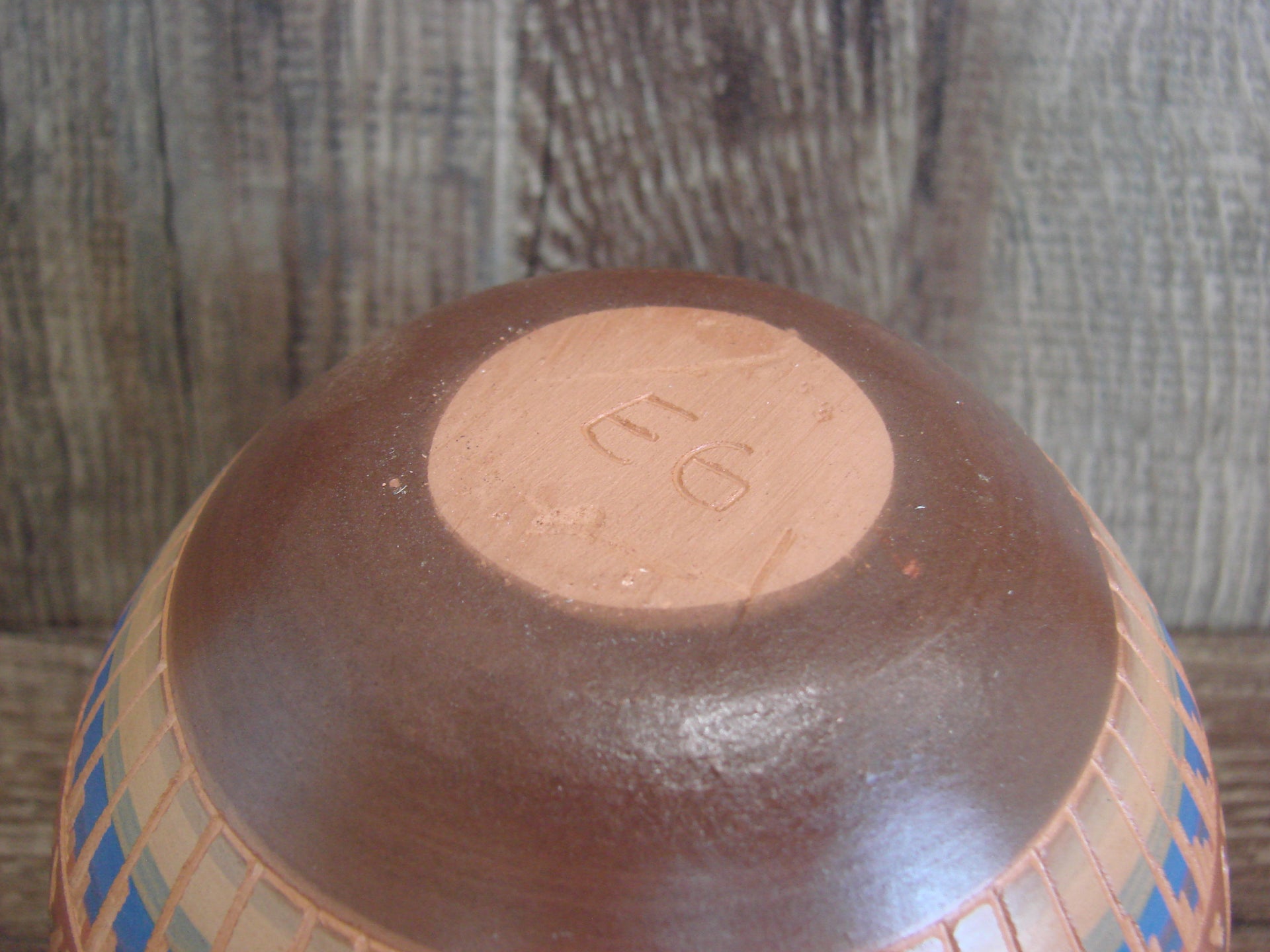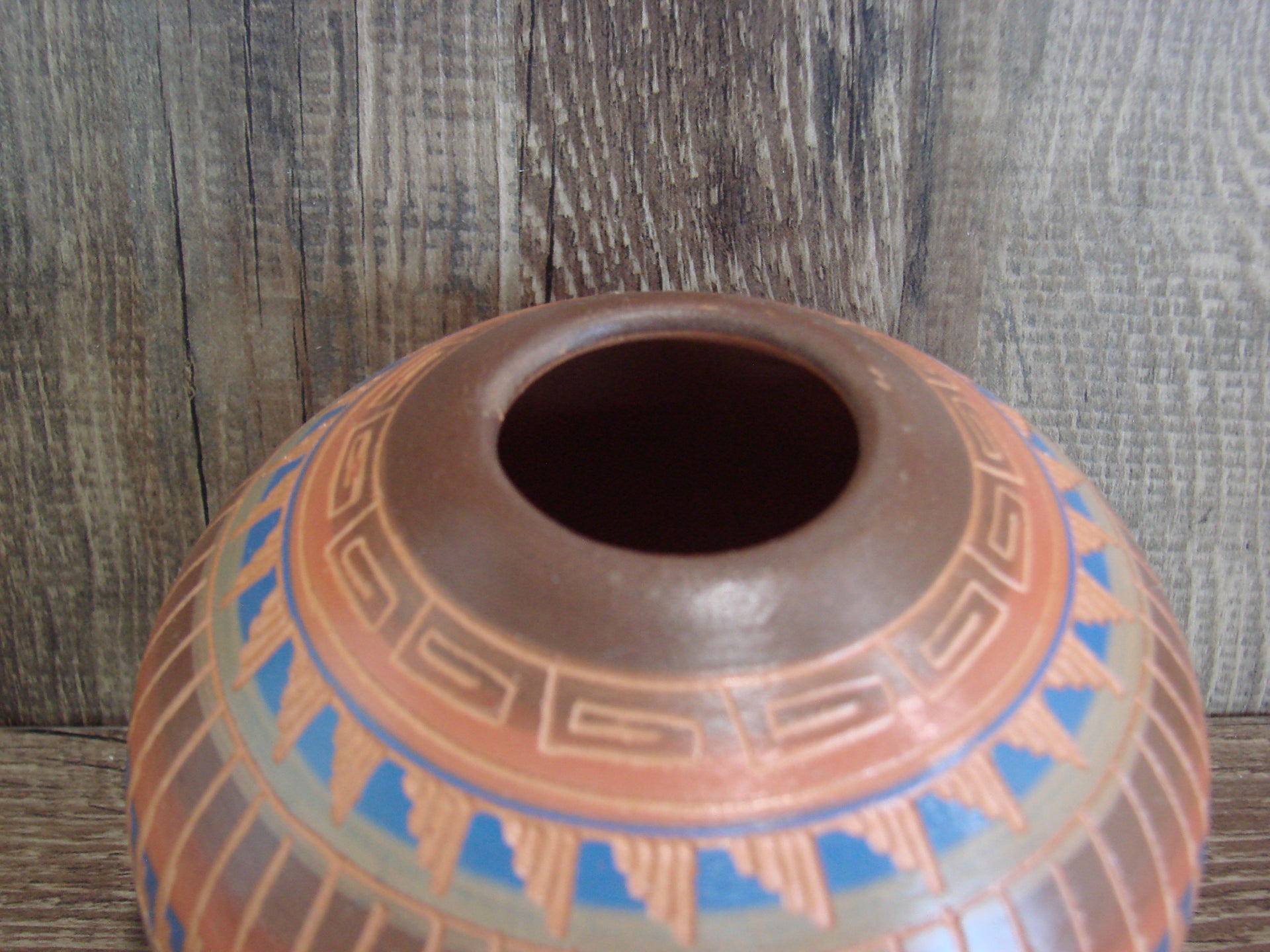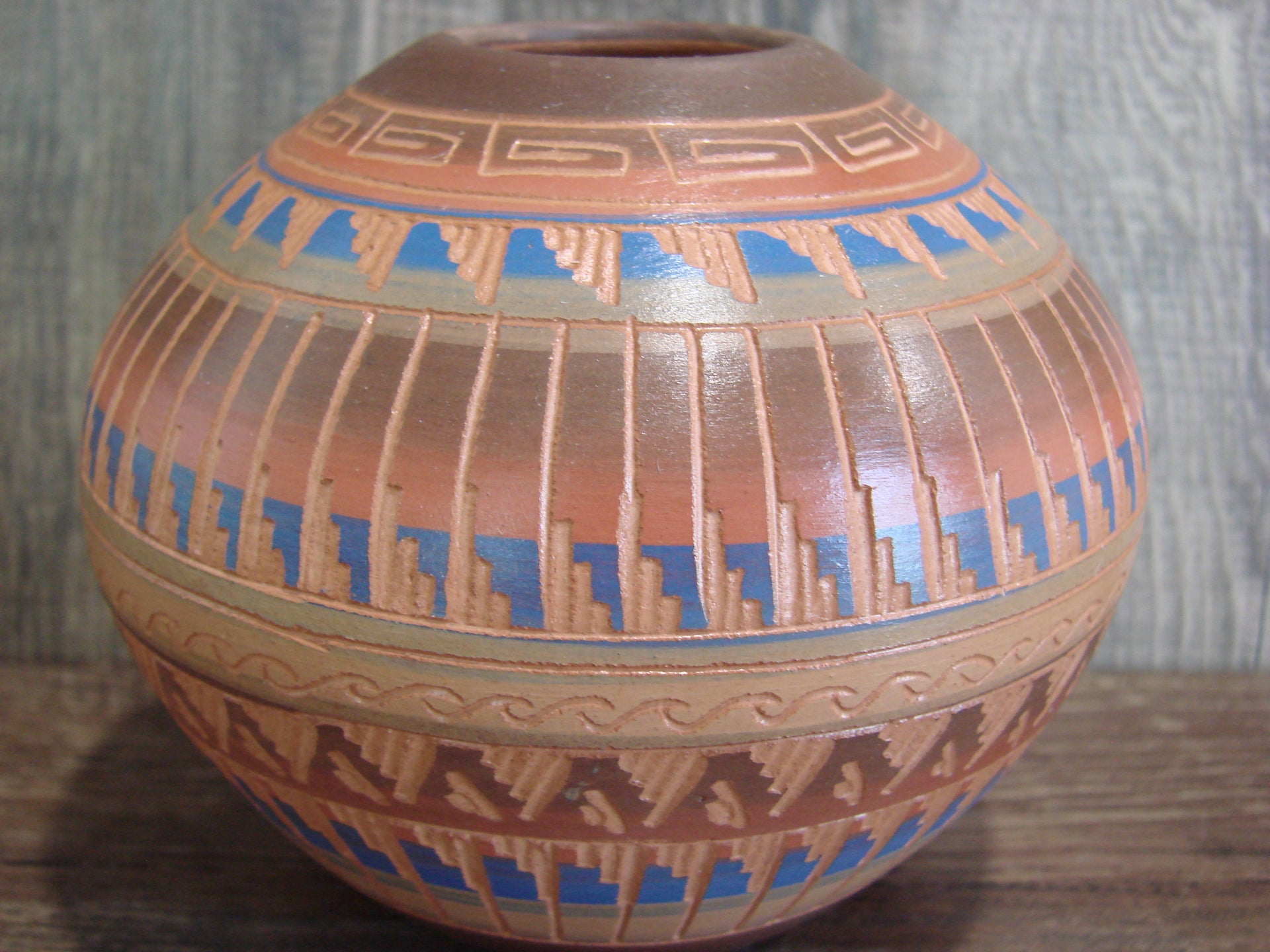 Genuine Native American Navajo Indian Hand Etched and Hand Painted Pottery from Western New Mexico. This beautiful piece of pottery features stunning Hand Painted and traditional Hand Etched Navajo patterns throughout. Hand etched and painted by E. Gilmore. Signed "EG" on the bottom. Free shipping included!