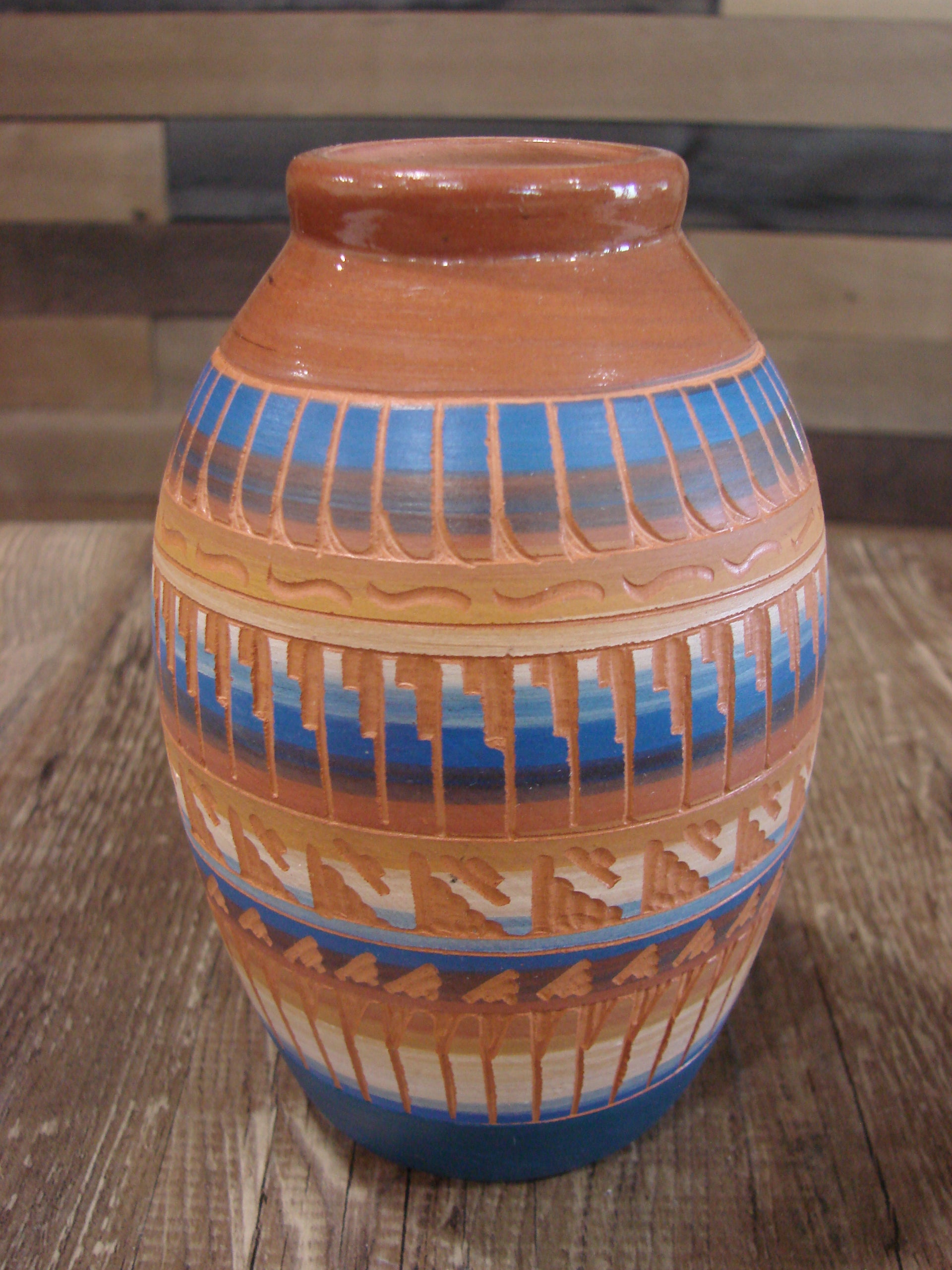 Genuine Native American Navajo Indian Hand Etched and Hand Painted Pottery from Western New Mexico. This beautiful piece of pottery features stunning Hand Painted and traditional Hand Etched Navajo patterns throughout. Hand etched and painted by M. Gilmore. Signed "MG" on the bottom. Free shipping included!