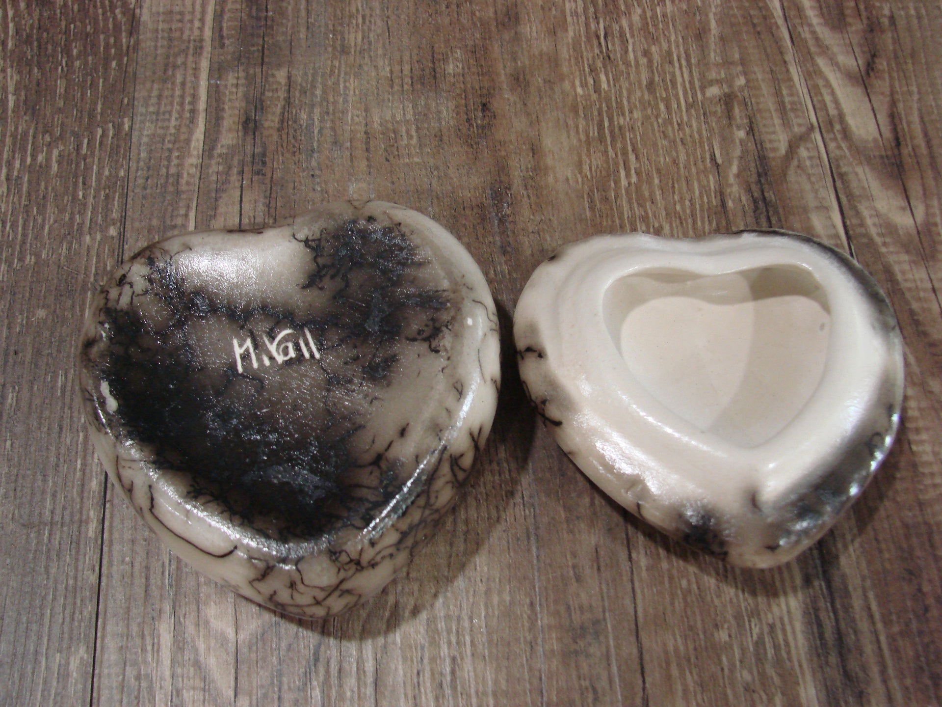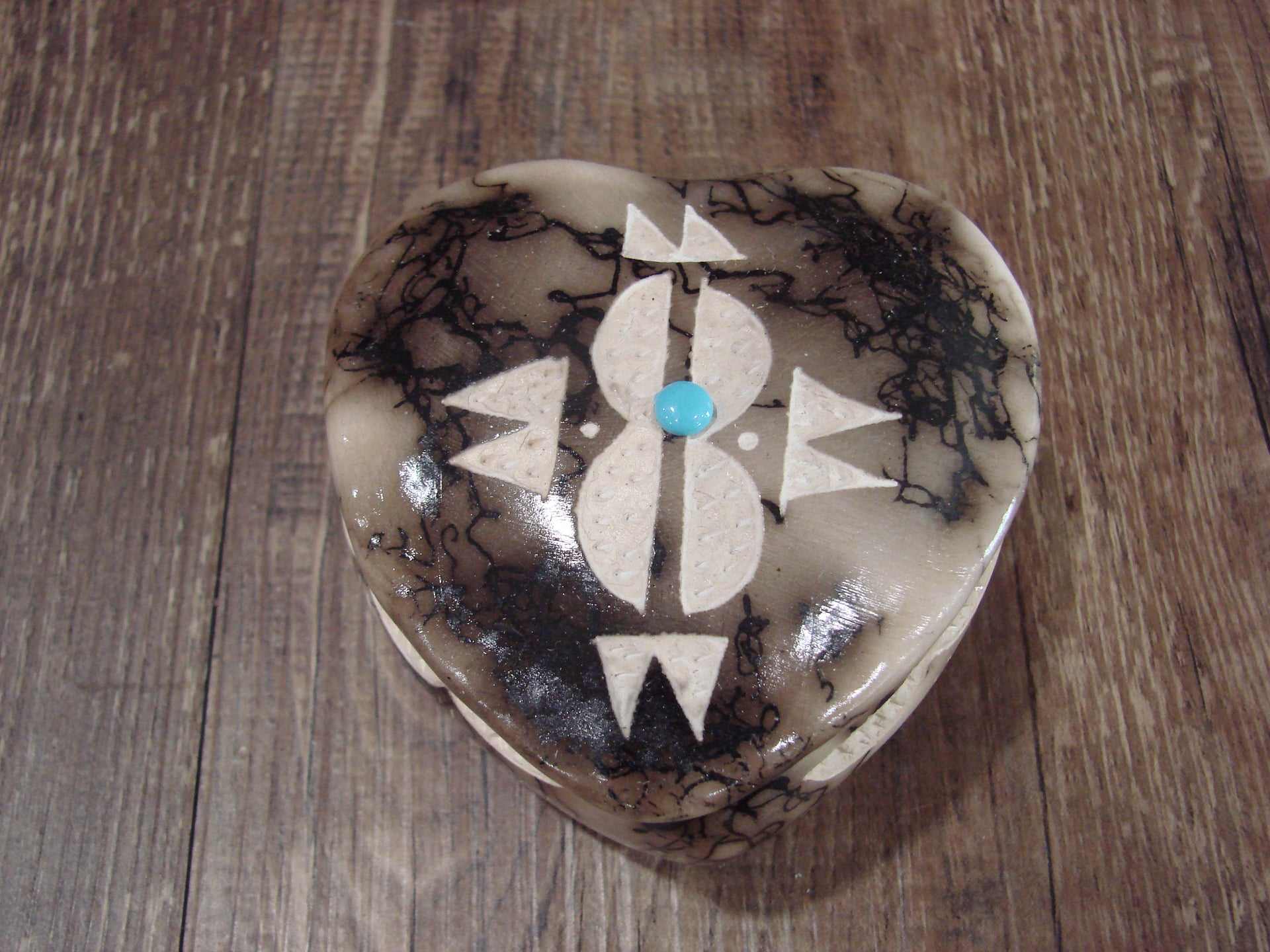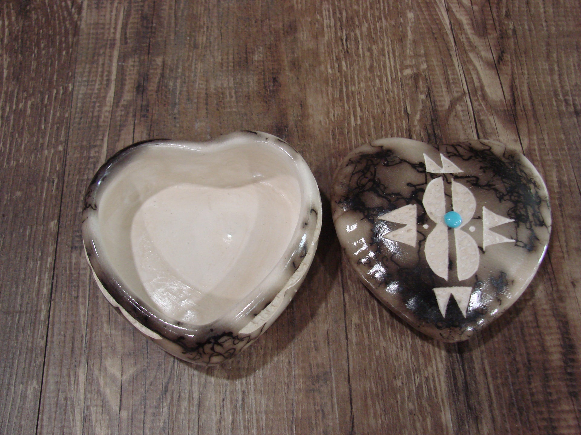 Genuine Native American Navajo Indian Horse Hair Heart Trinket Jewelry Box from Western New Mexico. This trinket box features beautiful horse hair and hand etching throughout. The lid is accented with hand etching. The Horse hair is laid over this piece during firing. The result is a unique one of a kind look. Hand etched by Navajo artist M. Vail. Signed on the bottom. Free shipping included!