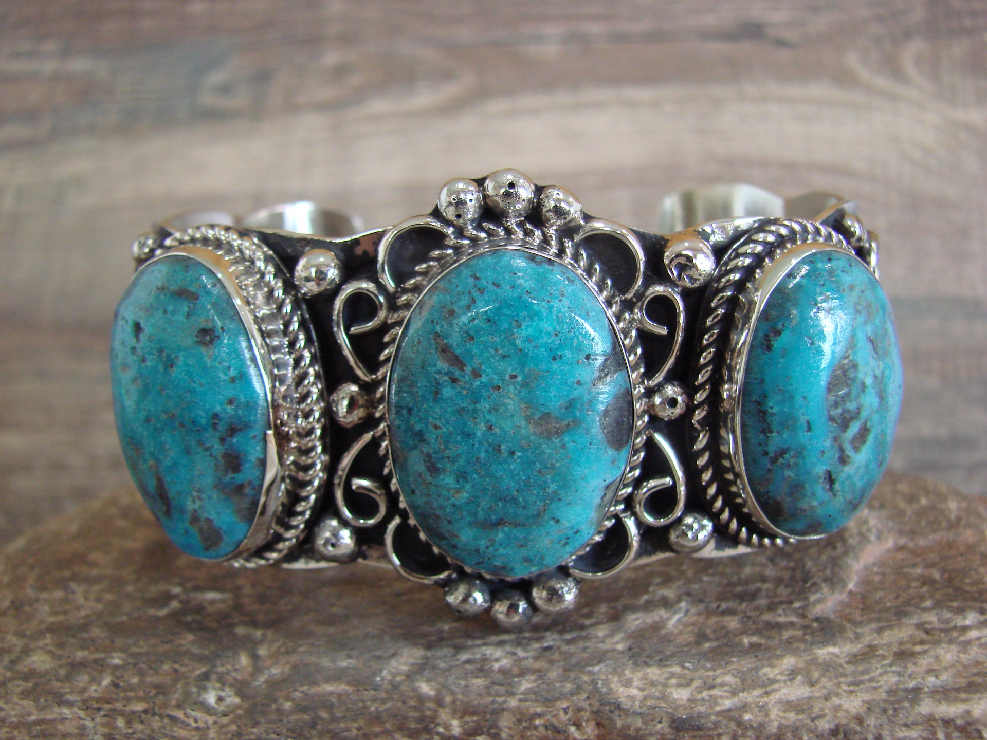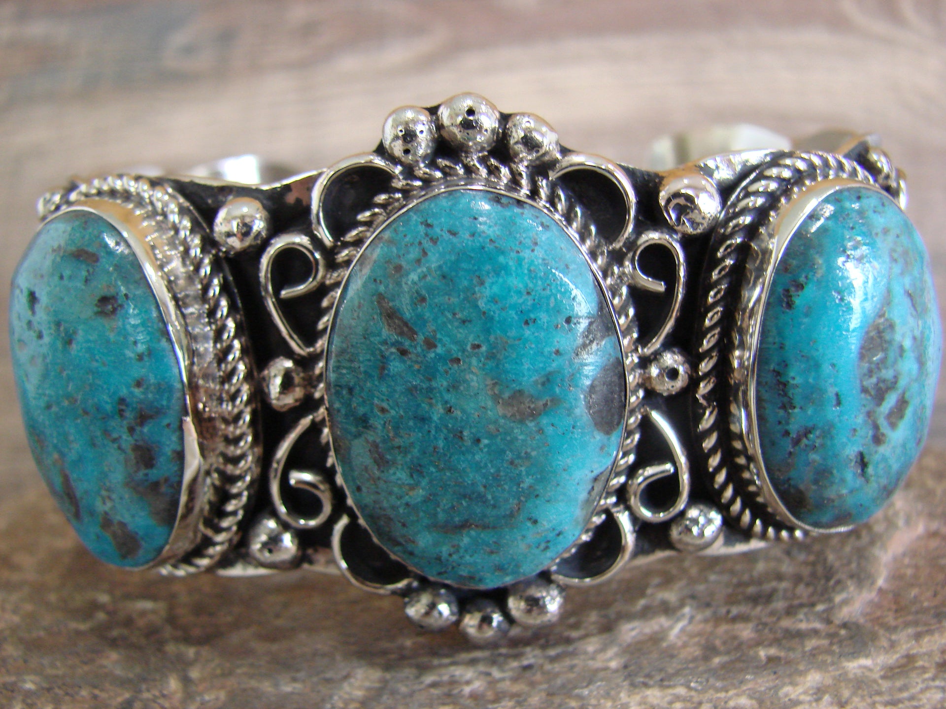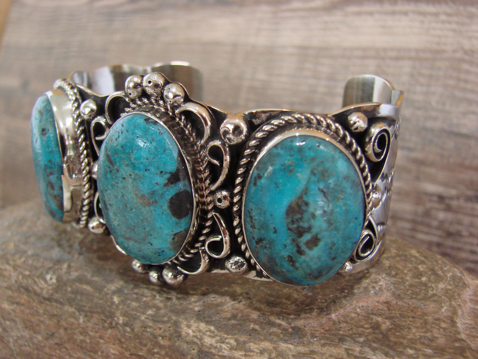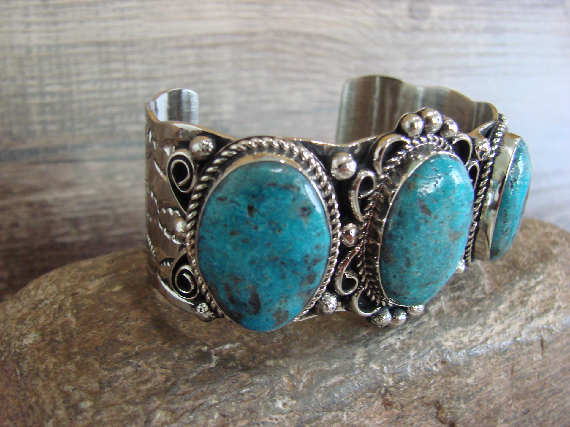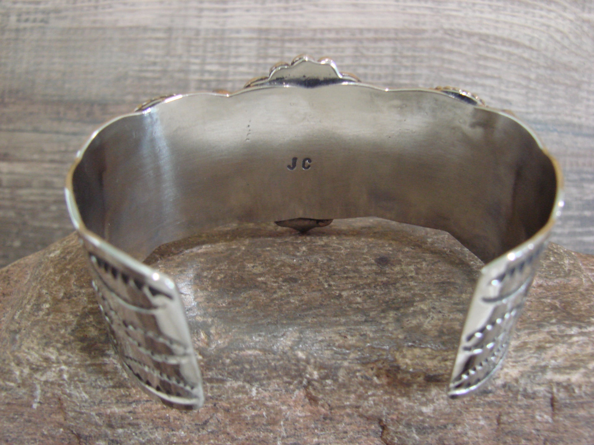 Native American Navajo Indian Handmade Nickel Silver & Turquoise Bracelet from Western New Mexico. This bracelet features 3 Turquoise stones set into smooth Nickel Silver bezel settings. The stones are nicely polished and surrounded by traditional Navajo Hand Stamping and details in Nickel Silver. Navajo Indian handmade by well-known Silversmith Jackie Cleveland. Signed "JC" on the back. Free Shipping with a gift box included!