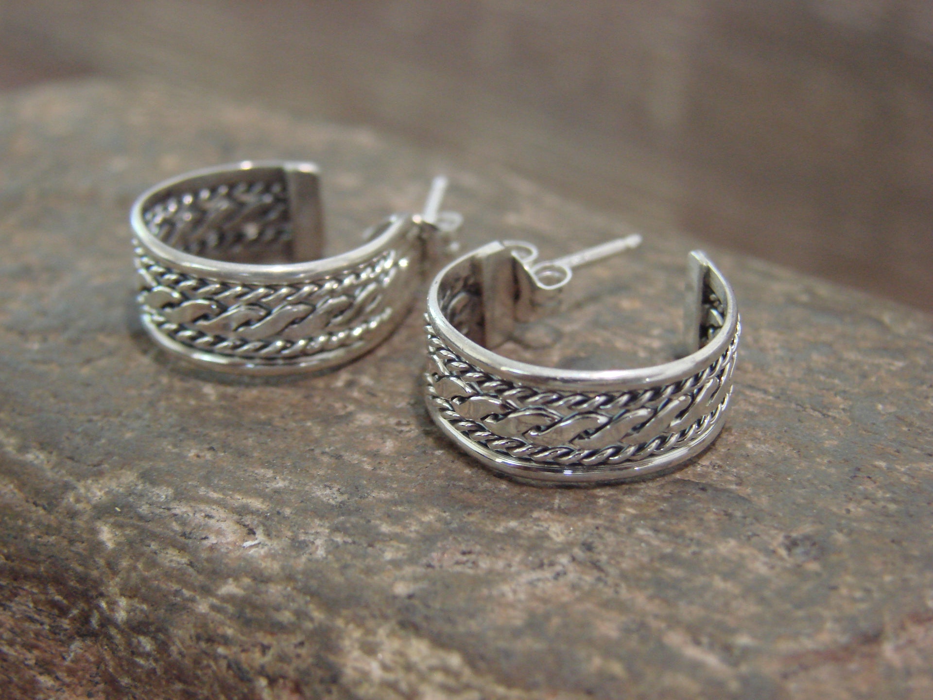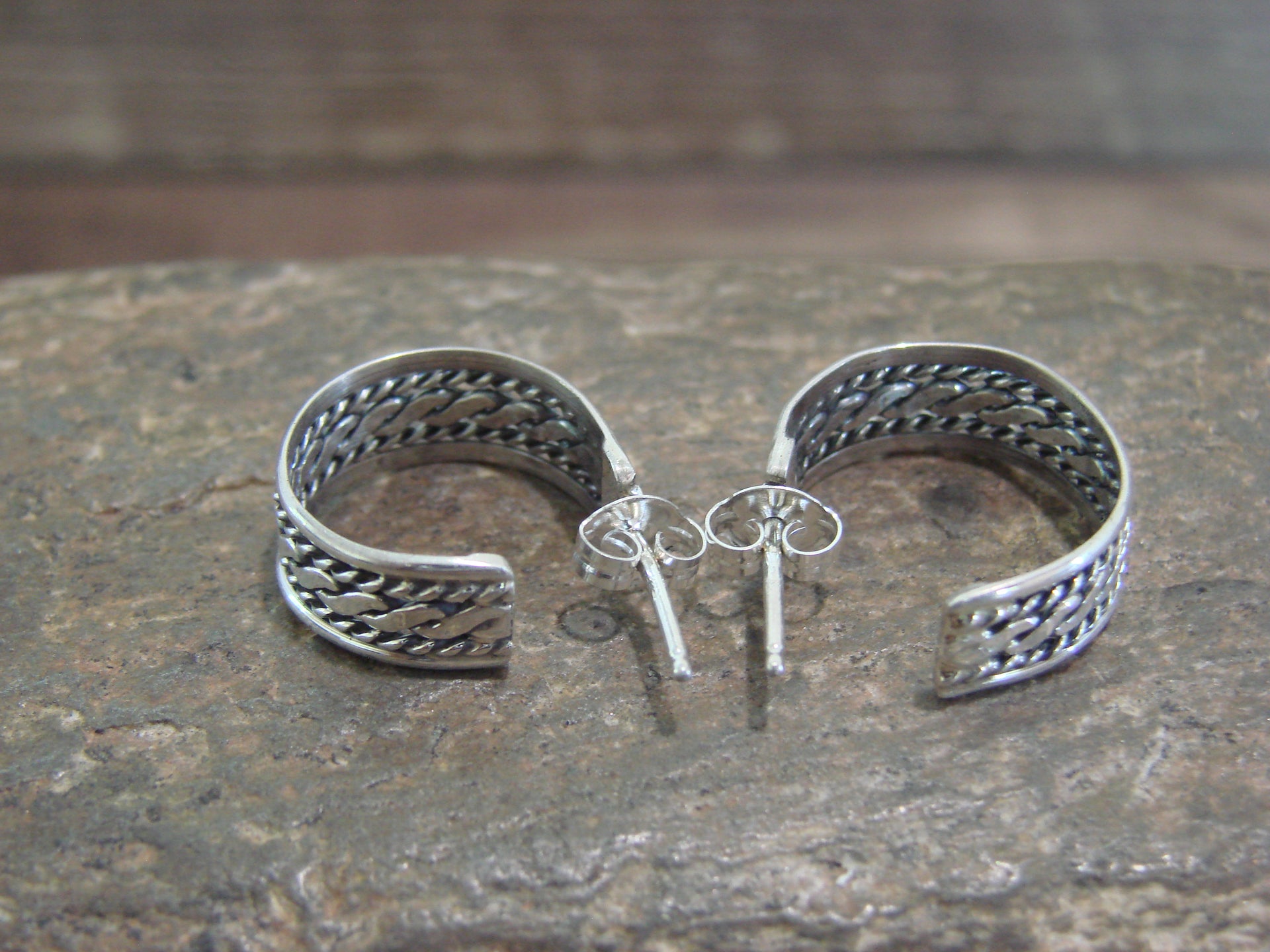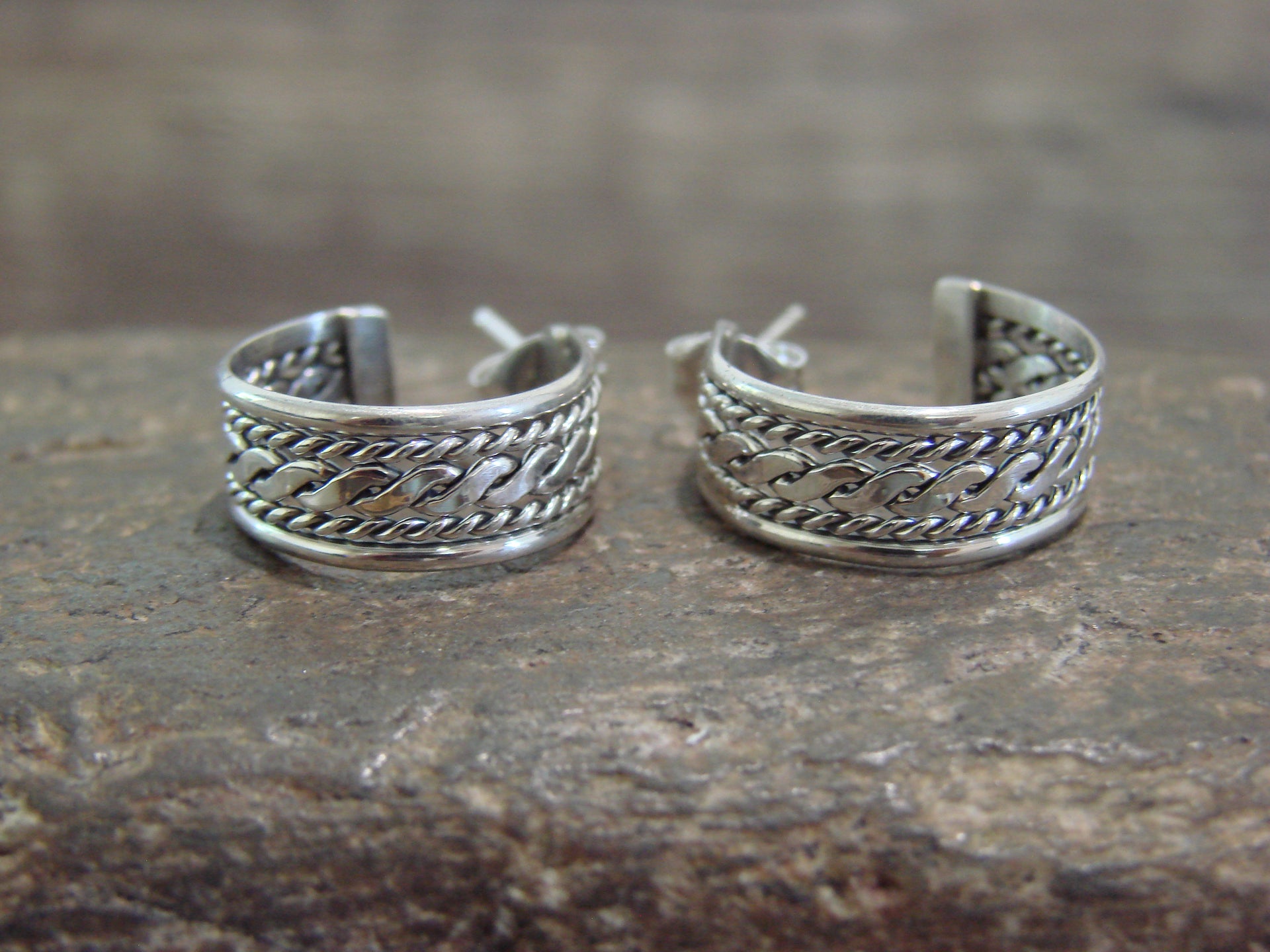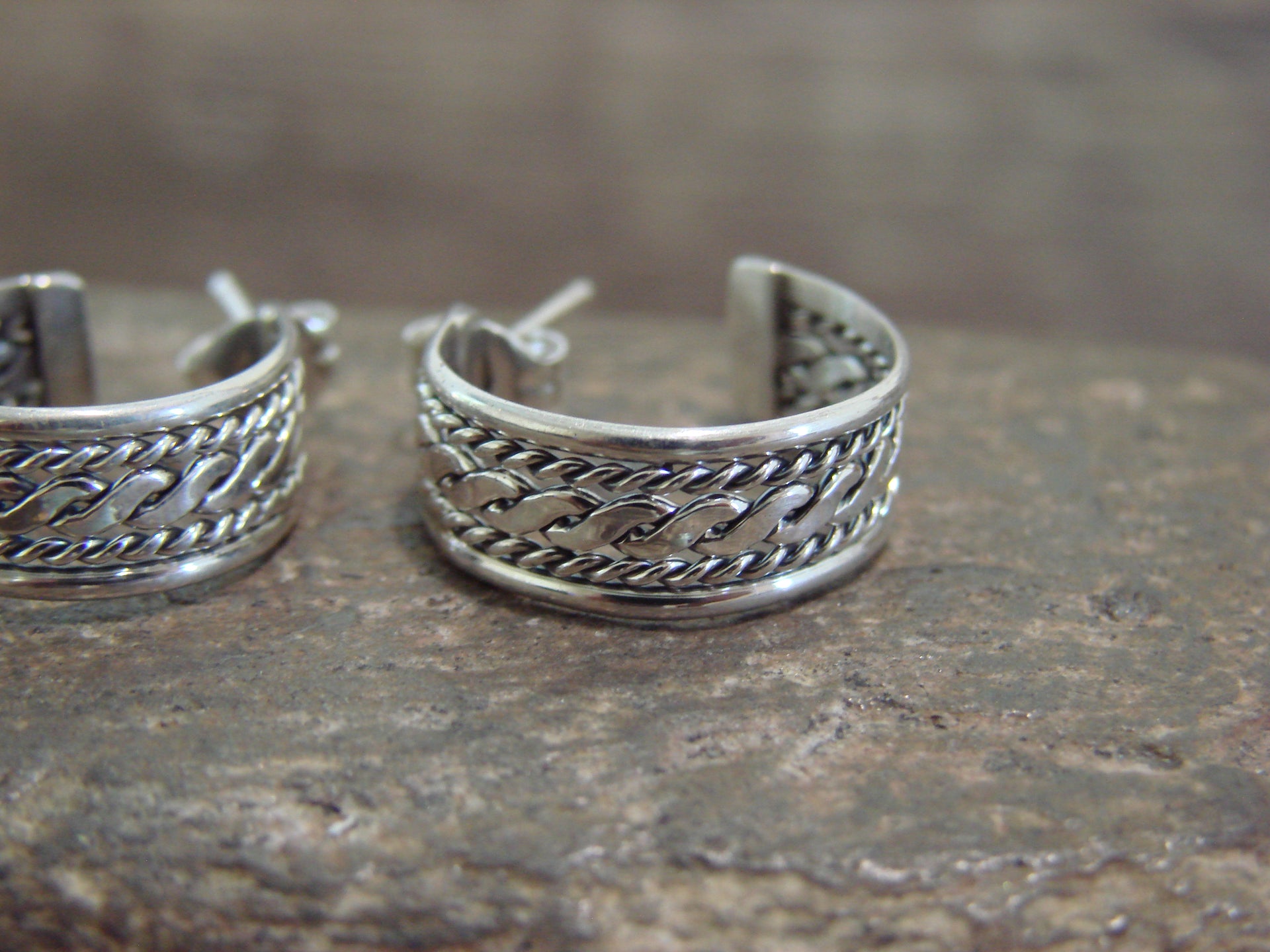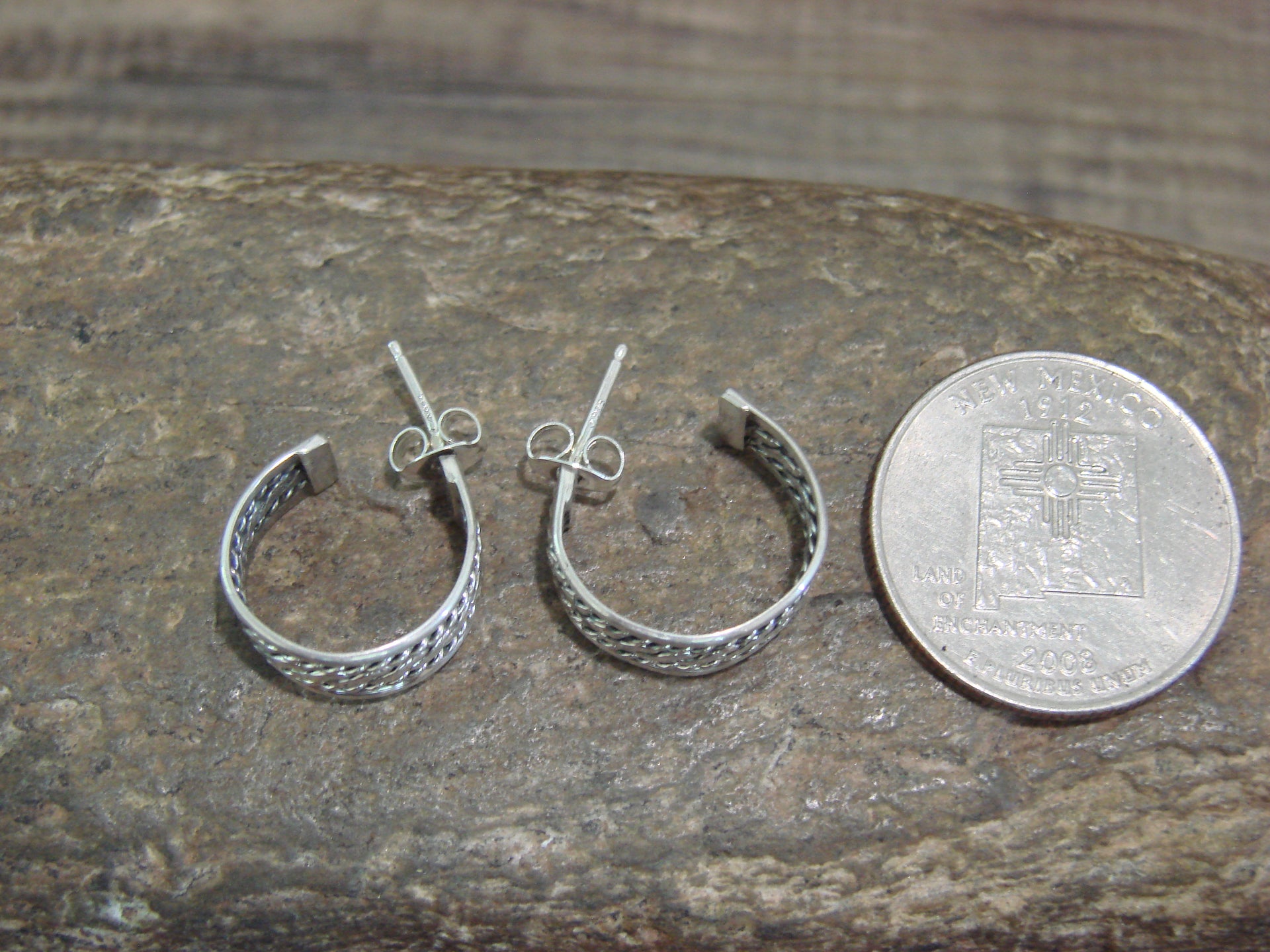 Native American Navajo Indian Sterling Silver Twisted Hoop Post Earrings from Western New Mexico. These post earrings feature beautiful details in sterling silver throughout. Handmade by Navajo artist Elaine Tahe. Unsigned. Free shipping with a gift box included!
