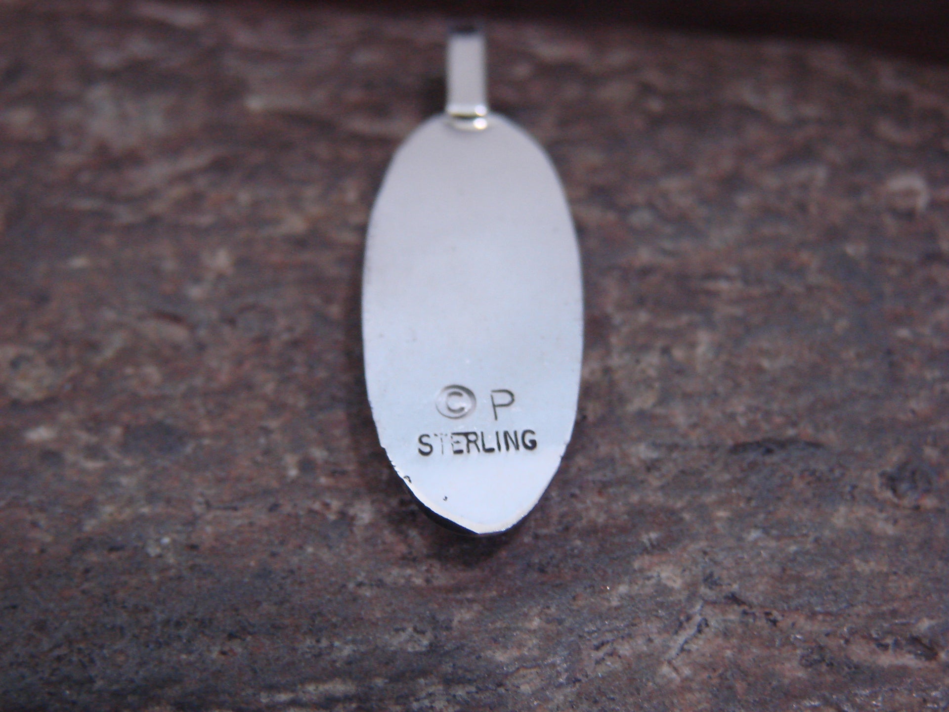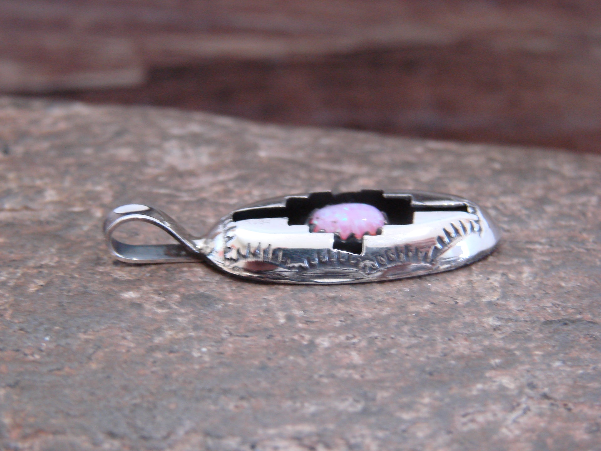 Genuine Native American Navajo Indian Sterling Silver & Pink Opal Shadow Box Pendant from Western New Mexico. This Pendant features a Lab Pink Opal stone set into a sterling silver Crown bezel setting. The Silver is cut out around the stone giving it a very nice shadow box look. Handmade by Felix Perry. Signed "P" and Stamped "Sterling" on the back. Free Shipping with a Gift Box included!