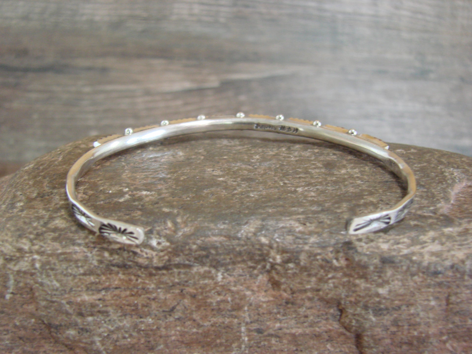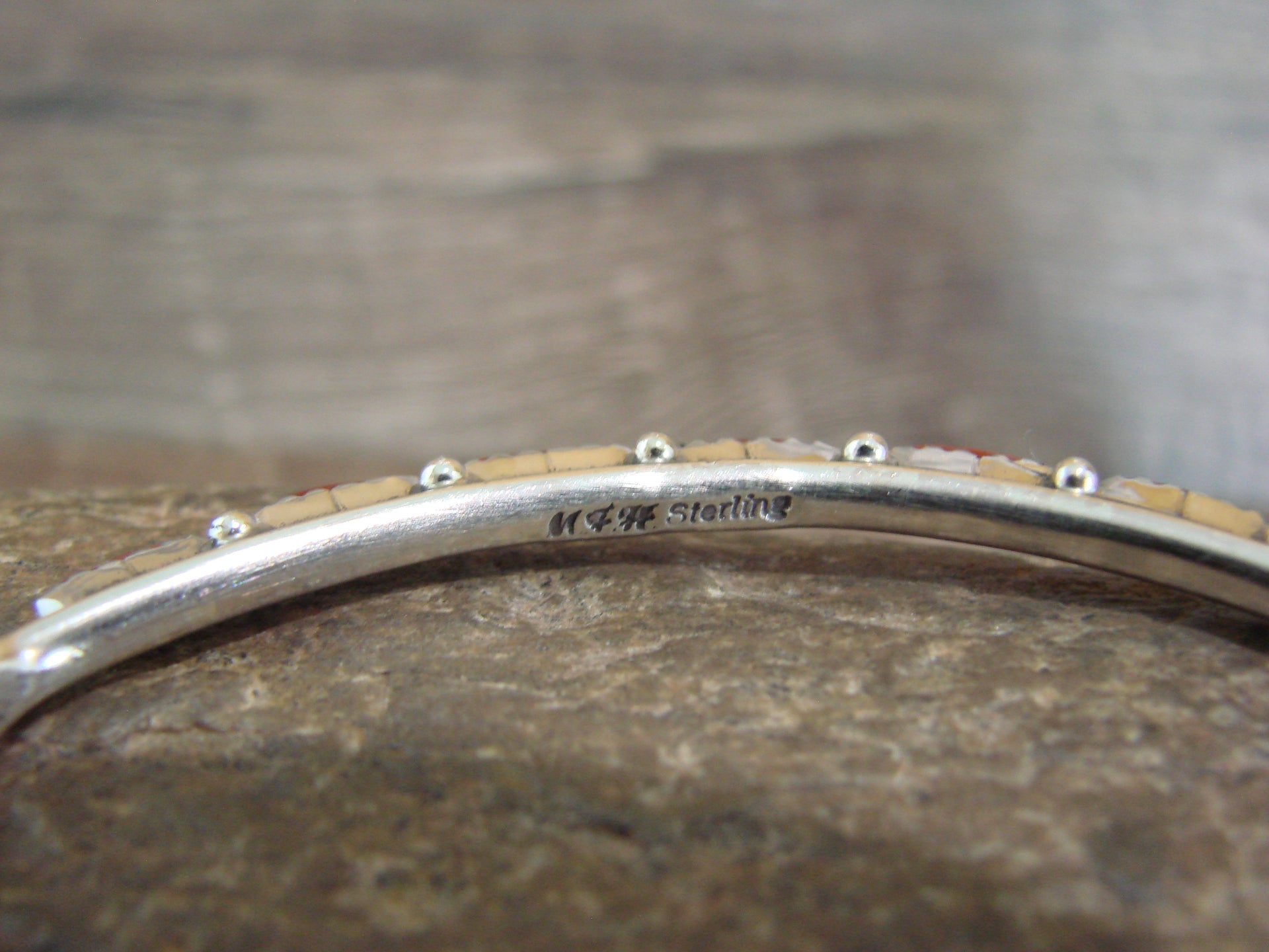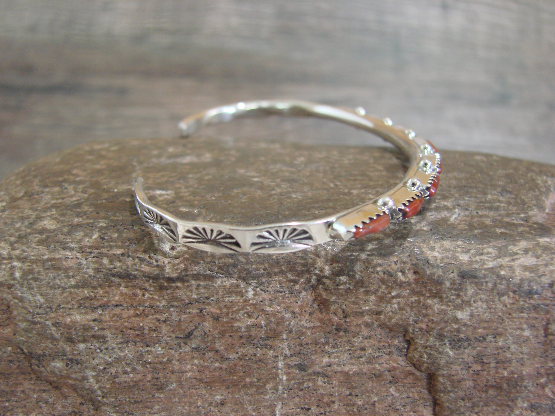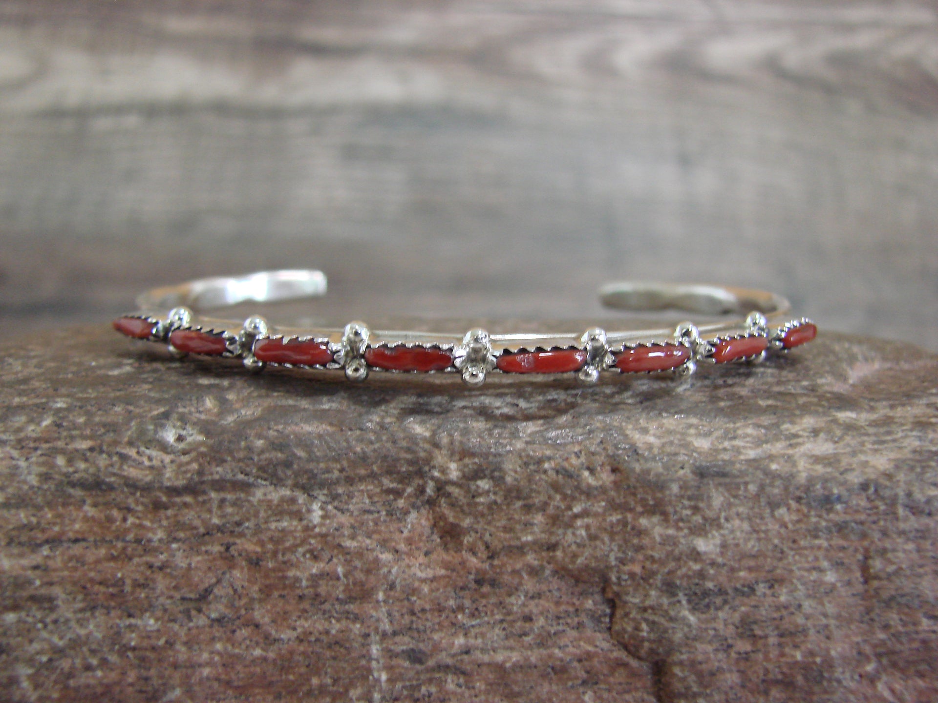 Genuine Native American Zuni Indian Coral Row Sterling Silver Bracelet from Western New Mexico. This Stunning bracelet features 8 Beautiful Coral stones intricately set into Crown Sterling Silver bezel settings. Beautiful details in Sterling Silver surround the stones. Fine Navajo Silversmith workmanship quality makes this bracelet a beautiful hand made masterpiece! Zuni Indian handmade by Murray Hannaweeka. Signed and Stamped Sterling on the inner band. Free gift box and shipping included!