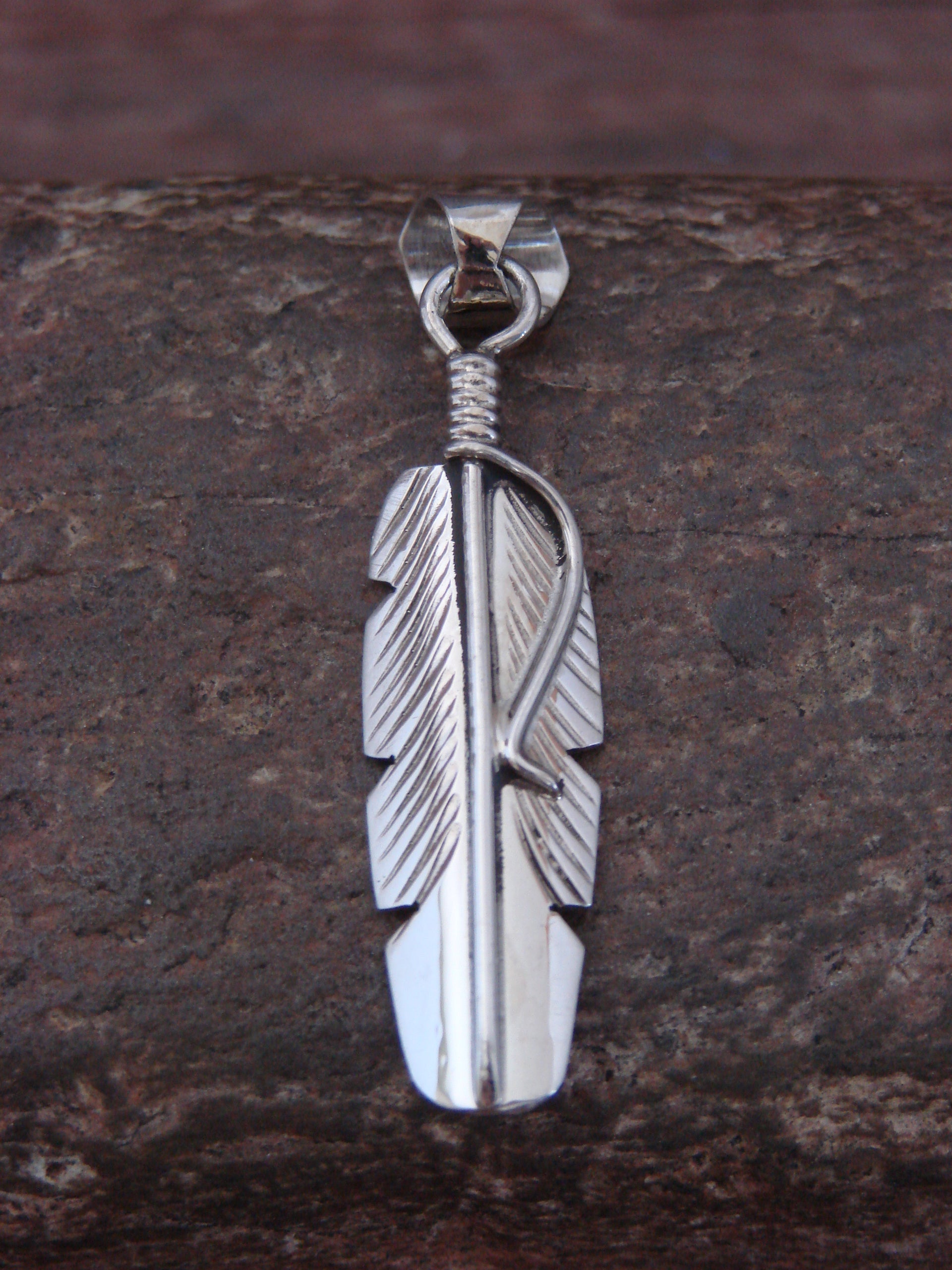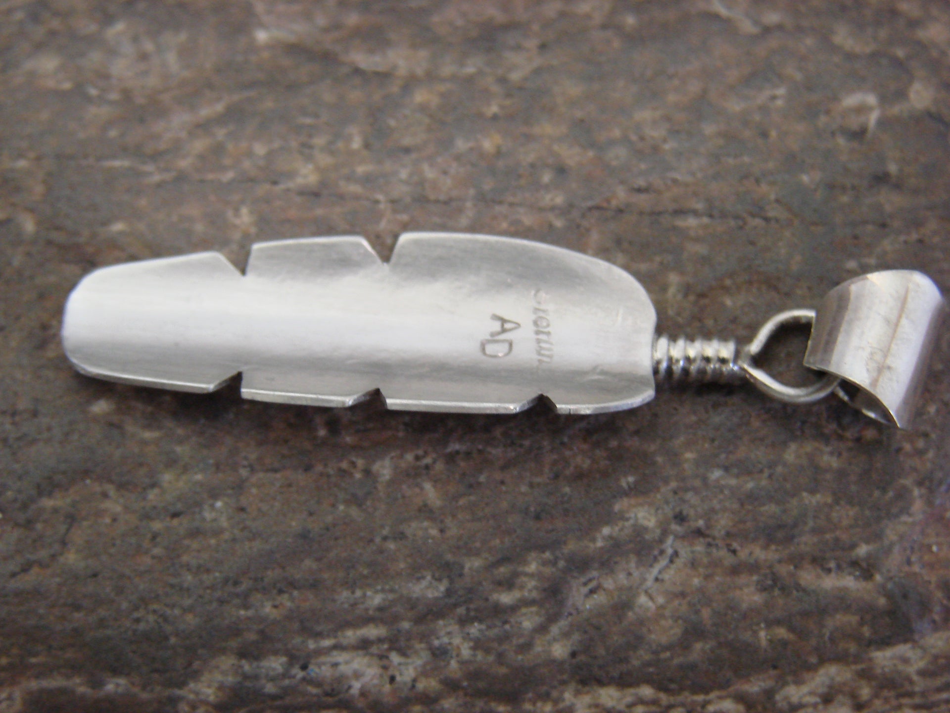 Native American Navajo Indian Sterling Silver Feather Pendant from Western New Mexico. This Beautiful pendant features Stunning Hand Stamping throughout a Smooth Sterling Silver Feather. Polished to a Bright Shine, This Pendant is Gorgeous! Navajo Indian hand made and Hand Stamped by Aaron Davis. Signed and Stamped "Sterling" on the back. Free Shipping with a gift box included!