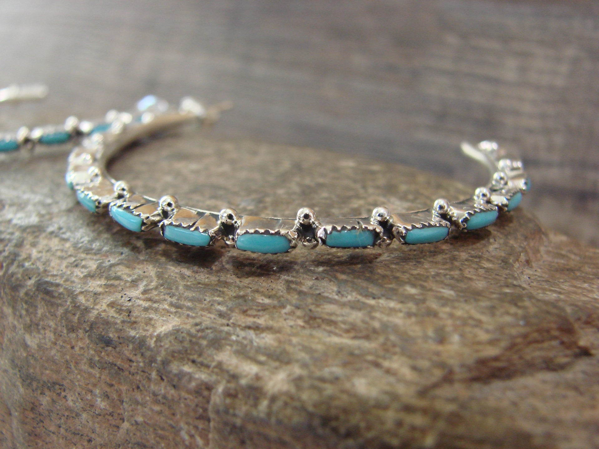 Large Native American Zuni Indian Sterling Silver & Turquoise Needlepoint Earrings from Western New Mexico. These Stunning hoop style earrings feature Genuine Turquoise stones beautifully set into needlepoint crown sterling silver bezel settings. This is a Gorgeous pair of earrings Hand Made to Perfection! Zuni Indian handmade by Alvin & Aurelia Hughte. Unsigned. Free Shipping with a gift box included!
