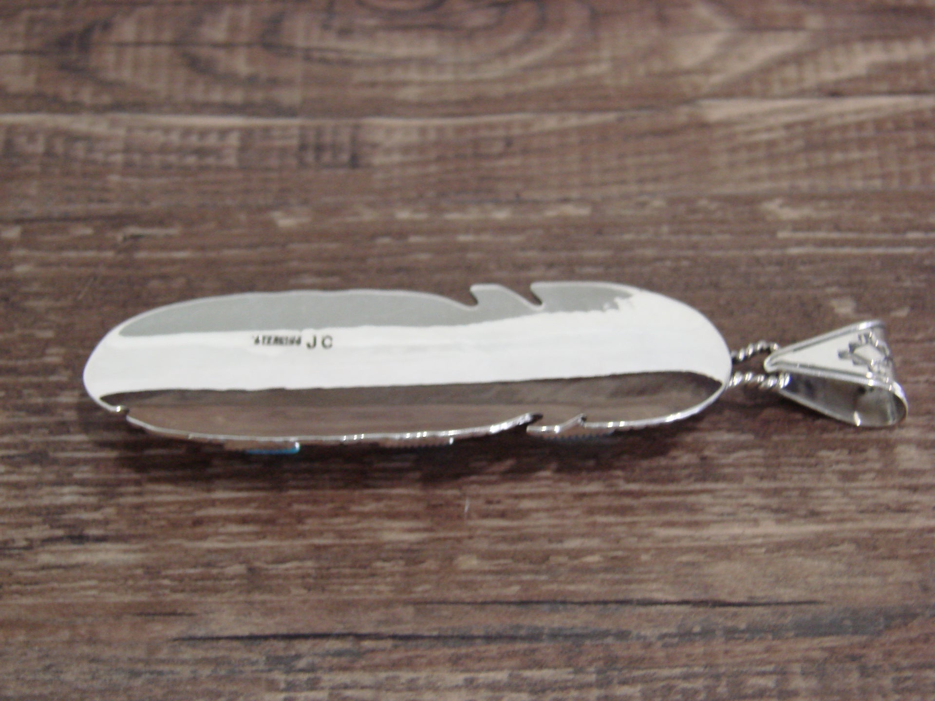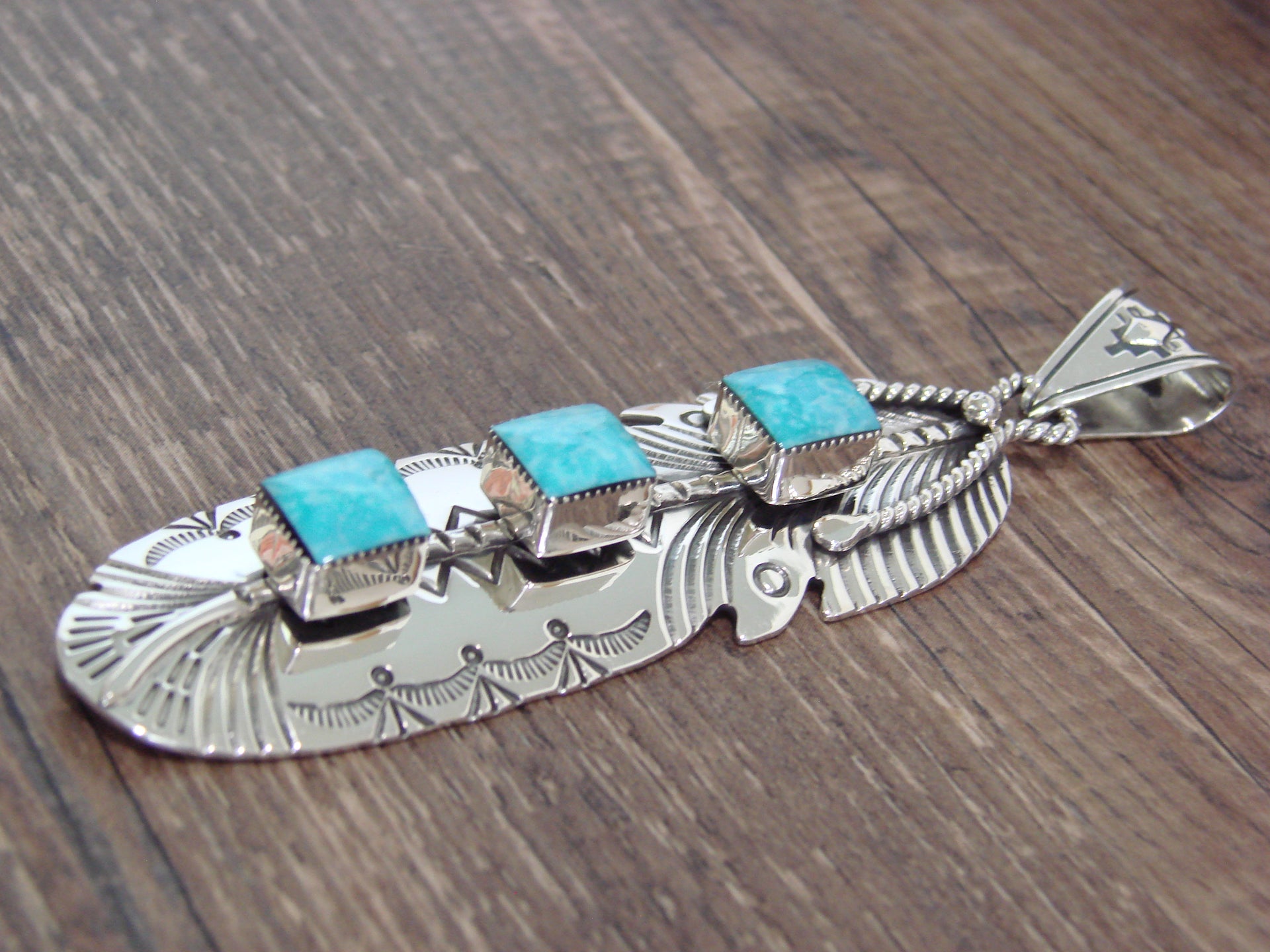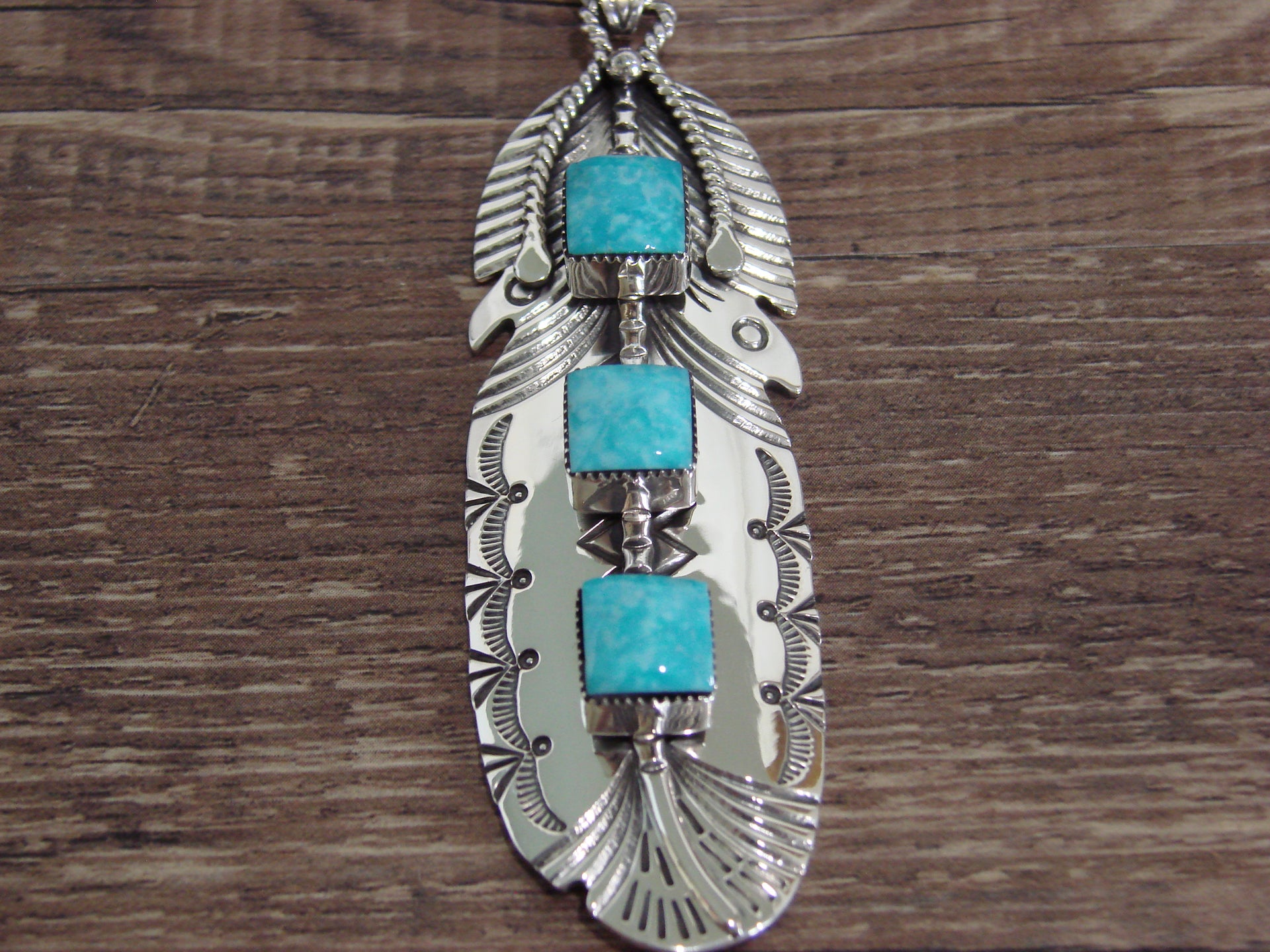 Native American Navajo Indian Sterling Silver Feather Pendant from Western New Mexico. This Beautiful pendant features 3 Turquoise Stones set into crown Sterling Silver bezel settings. The pendant is cut and polished to a Stunning finish! Navajo Indian hand made and Hand Stamped by Jennifer Cayaditto. Signed "JC" and Stamped "Sterling" on the back. Free Shipping with a gift box included!