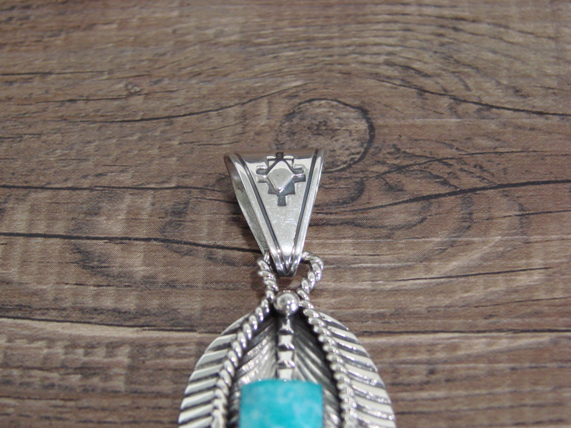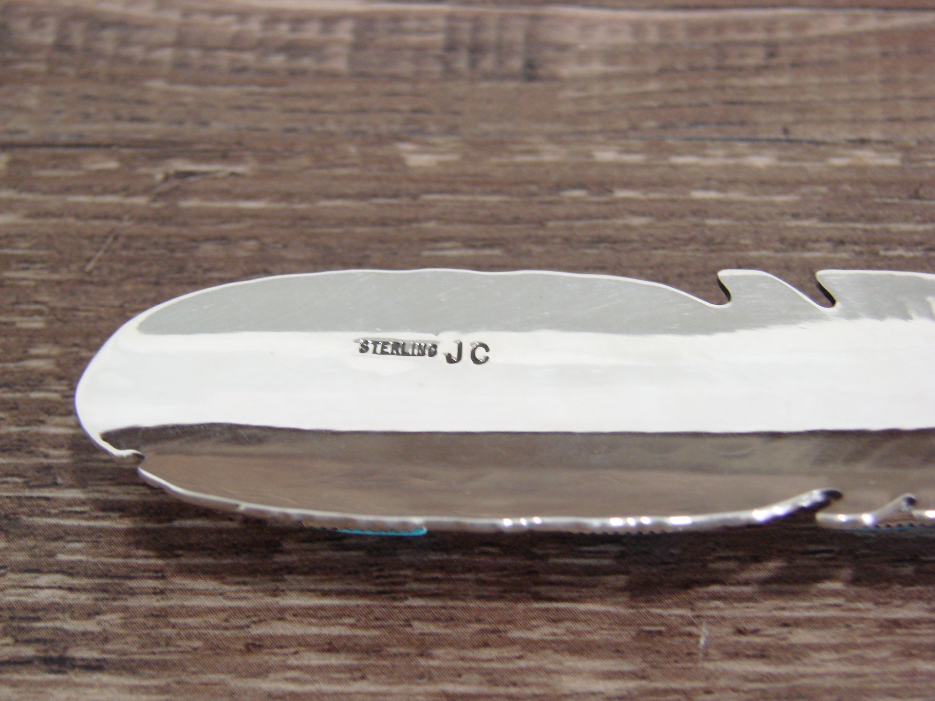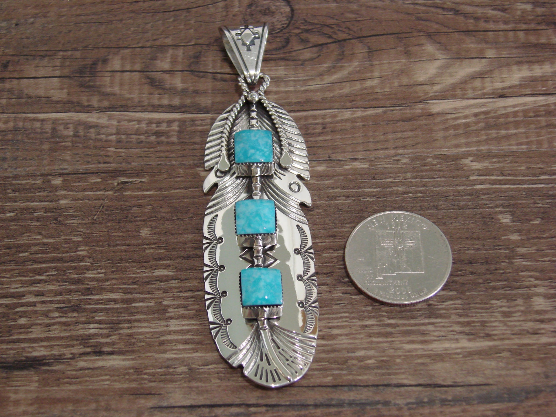Native American Navajo Indian Sterling Silver Feather Pendant from Western New Mexico. This Beautiful pendant features 3 Turquoise Stones set into crown Sterling Silver bezel settings. The pendant is cut and polished to a Stunning finish! Navajo Indian hand made and Hand Stamped by Jennifer Cayaditto. Signed "JC" and Stamped "Sterling" on the back. Free Shipping with a gift box included!