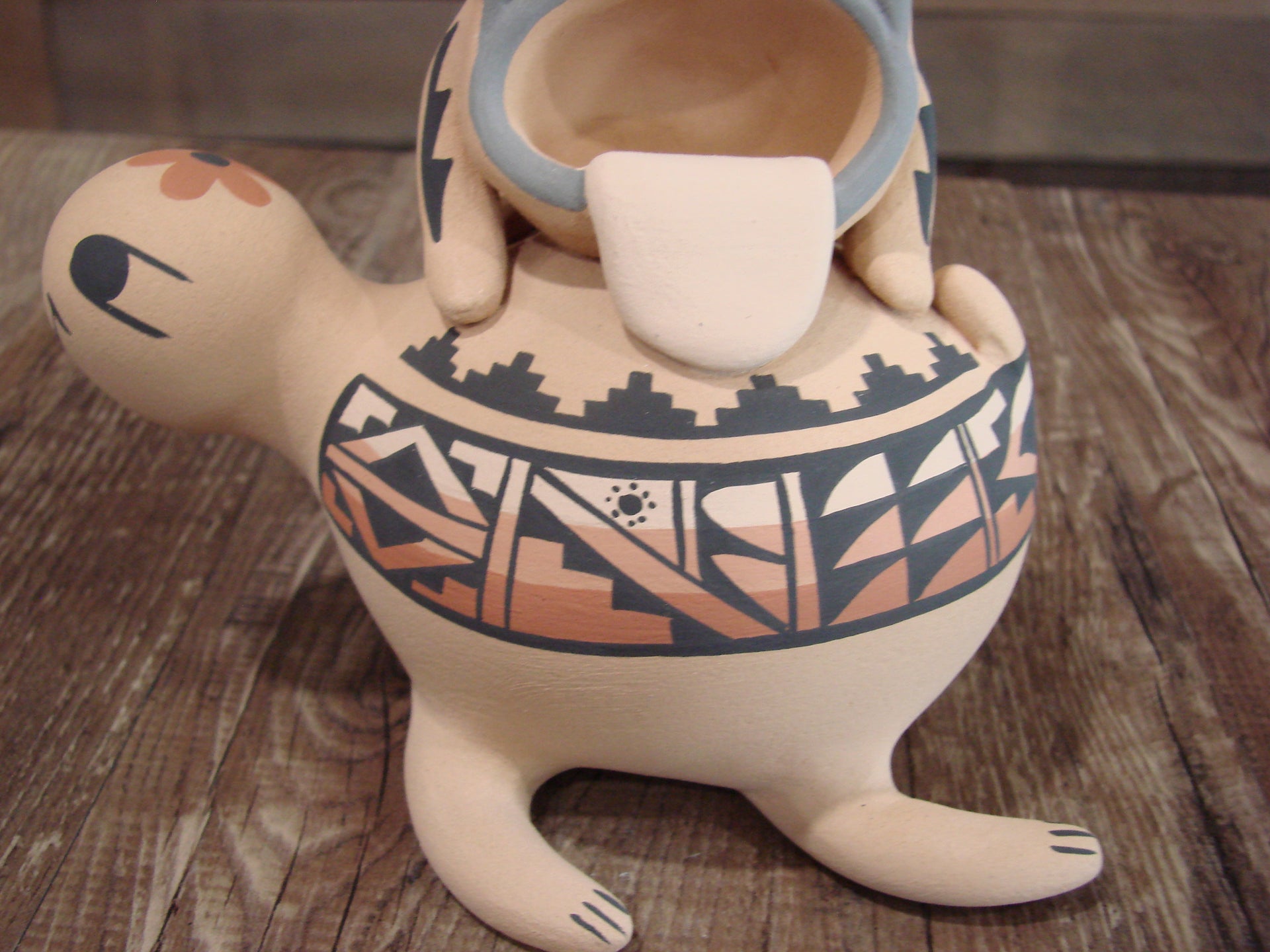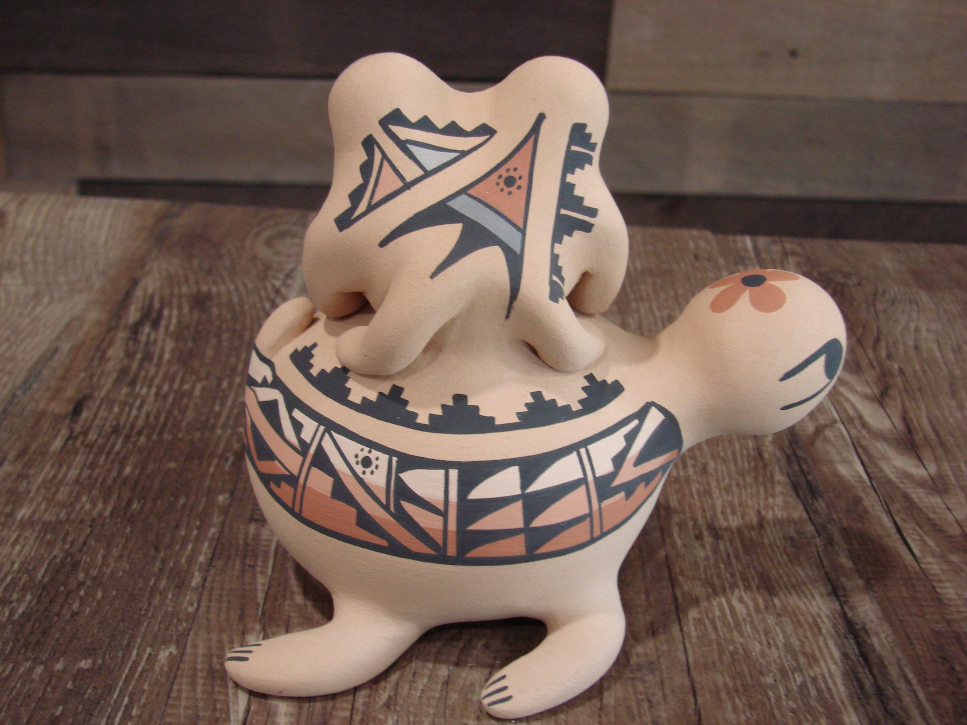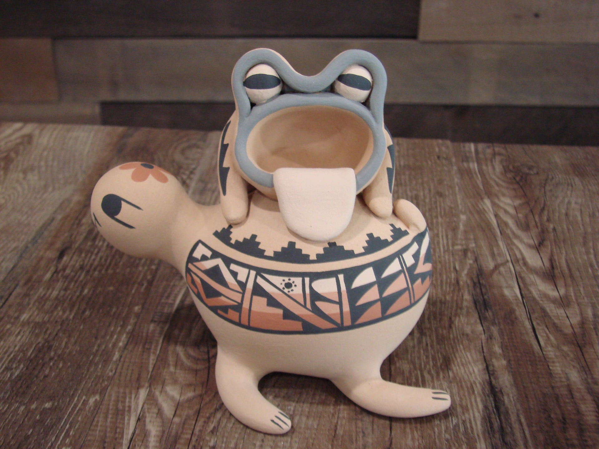 Genuine Native American Jemez Indian Hand Made Clay Frog & Turtle from Northern New Mexico. This Unique Piece features a beautifully Hand Painted Turtle Host with Frog on back. This piece is handmade with Jemez Mountain Clay. Handmade by Chrislyn Fragua. Signed on the bottom. Free shipping included!