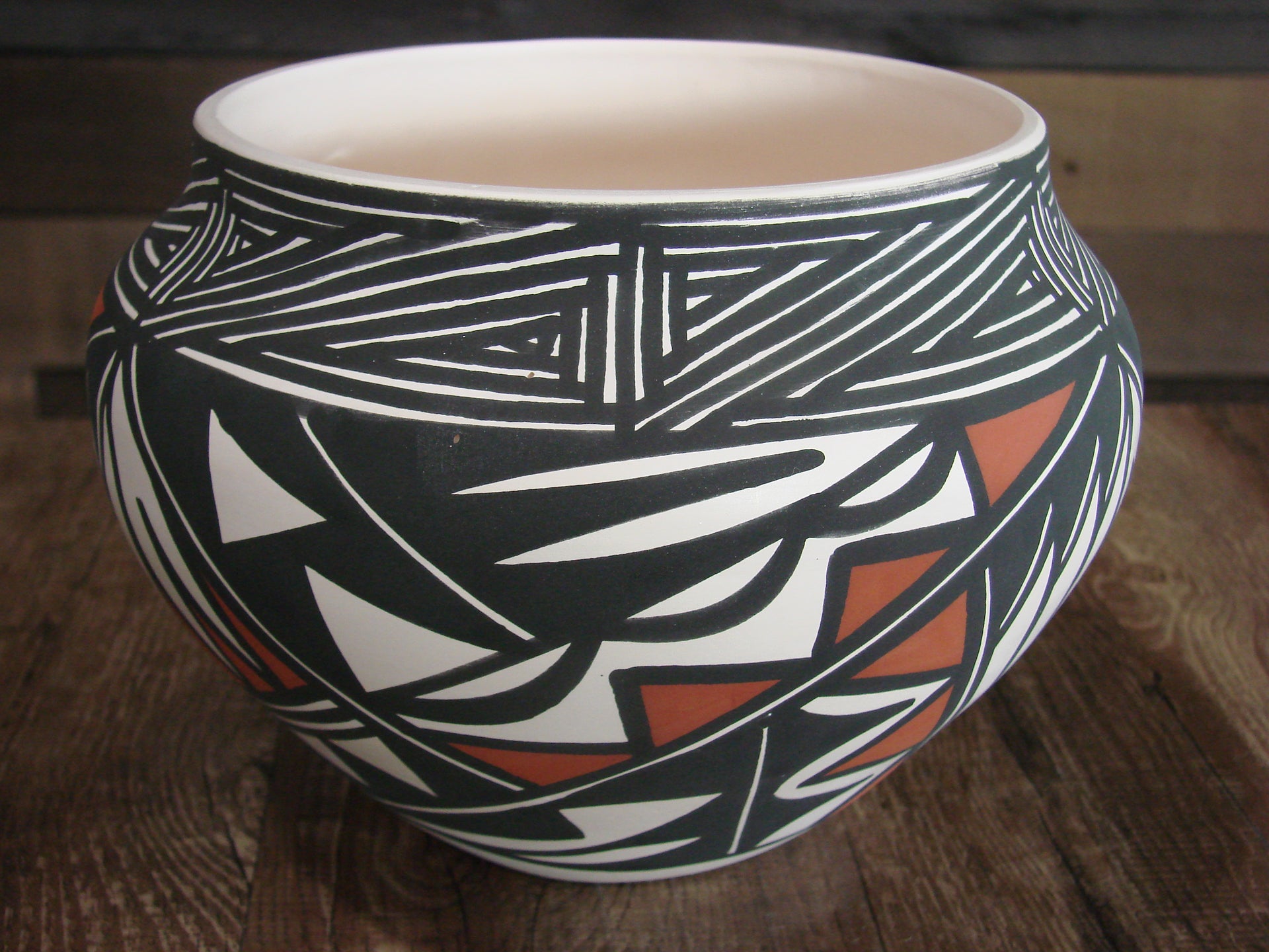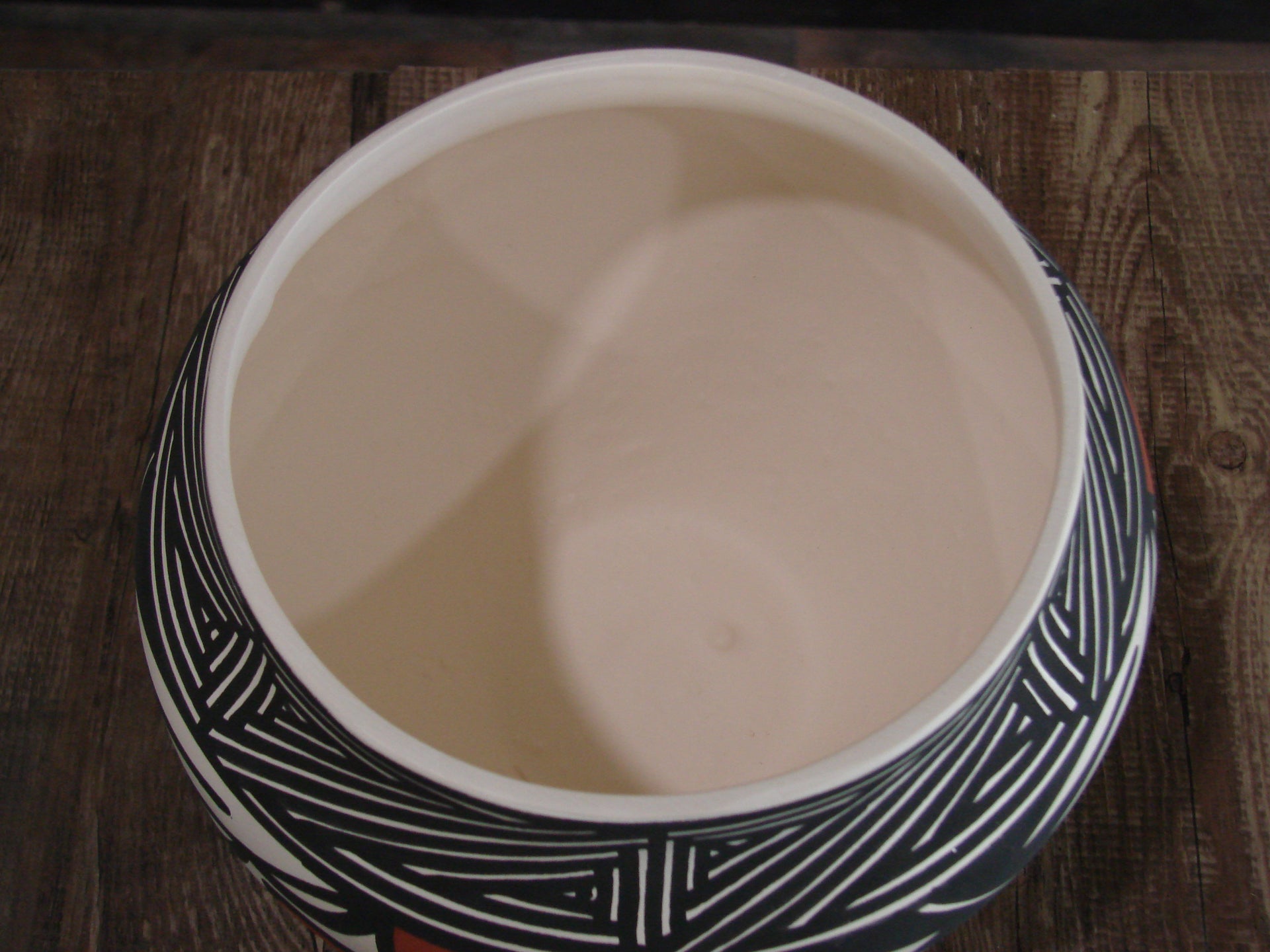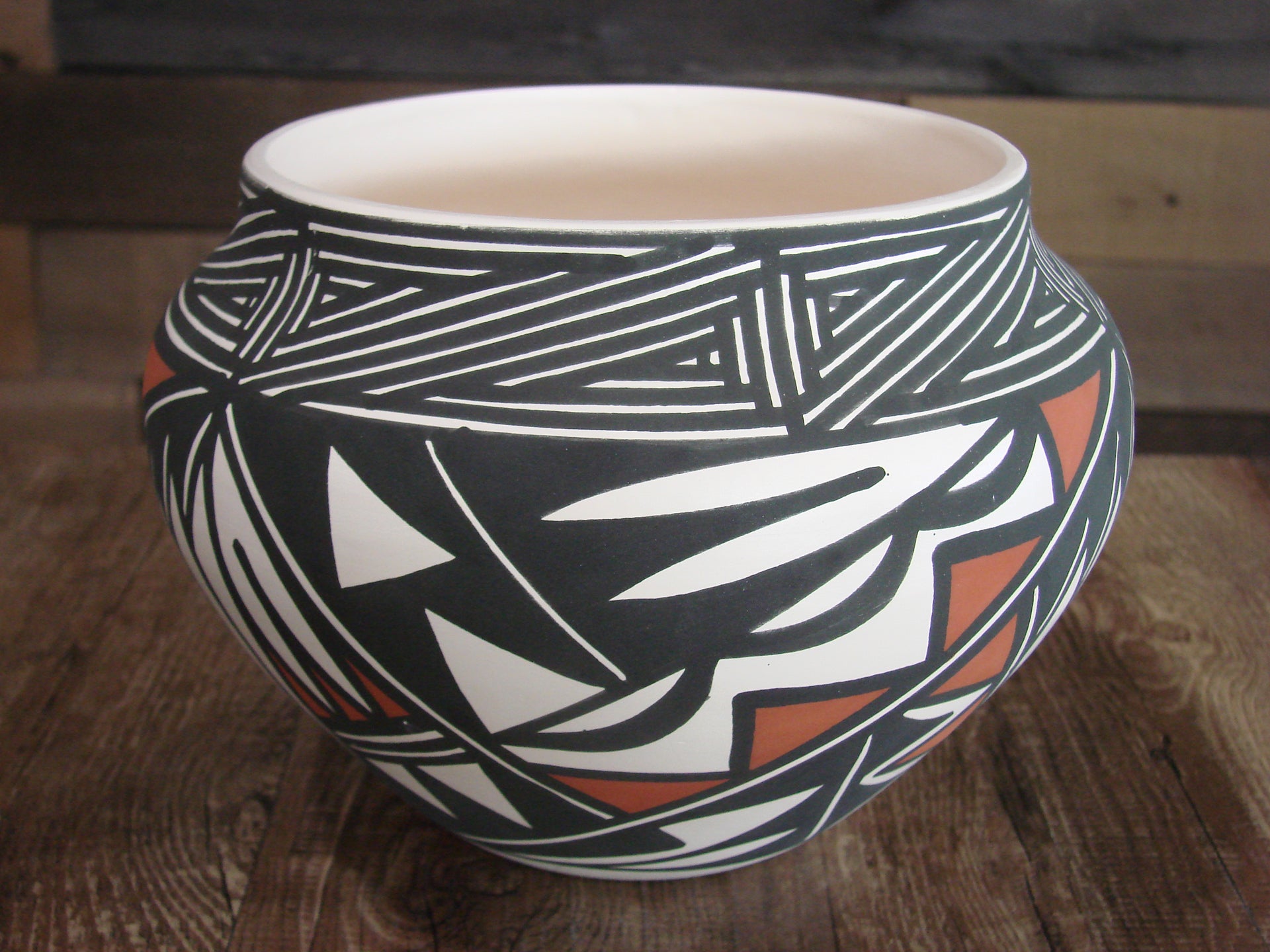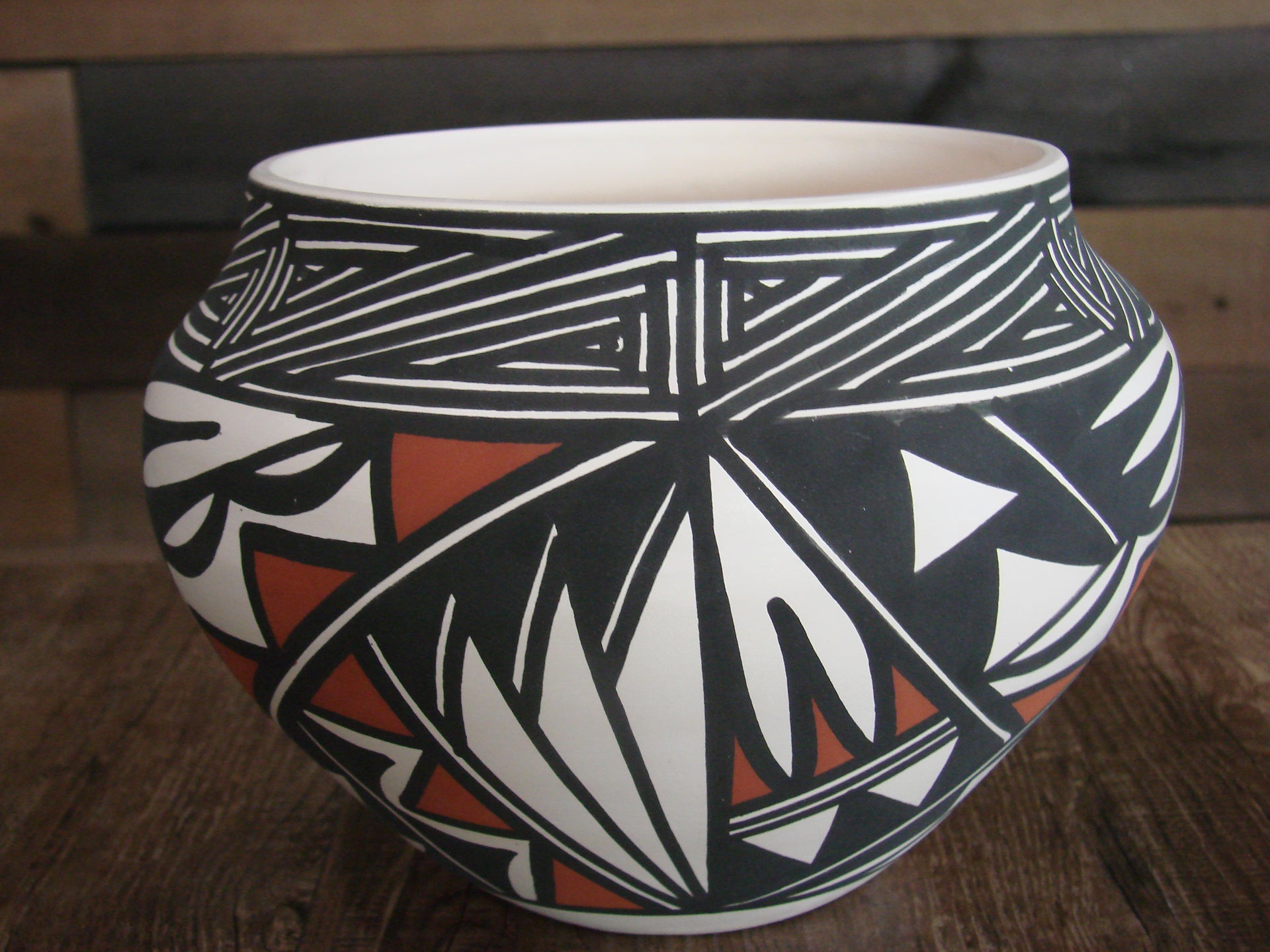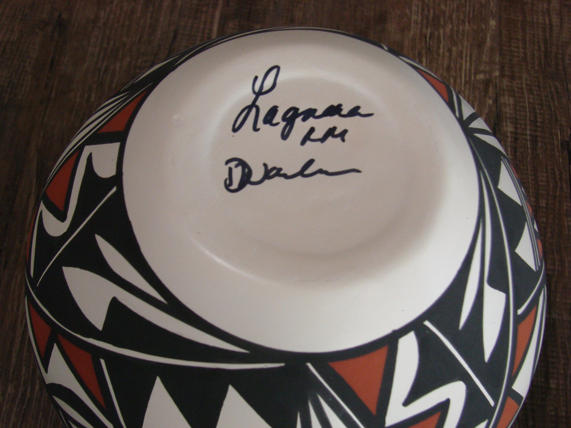 Native American Laguna Pueblo Indian Hand Painted Fine Line Pottery from Western New Mexico. This piece of pottery features Stunning natural pigment hand painted patterns throughout. The detail is exquisite! Hand painted by Laguna artist DW. The bottom is signed. Free Shipping included!