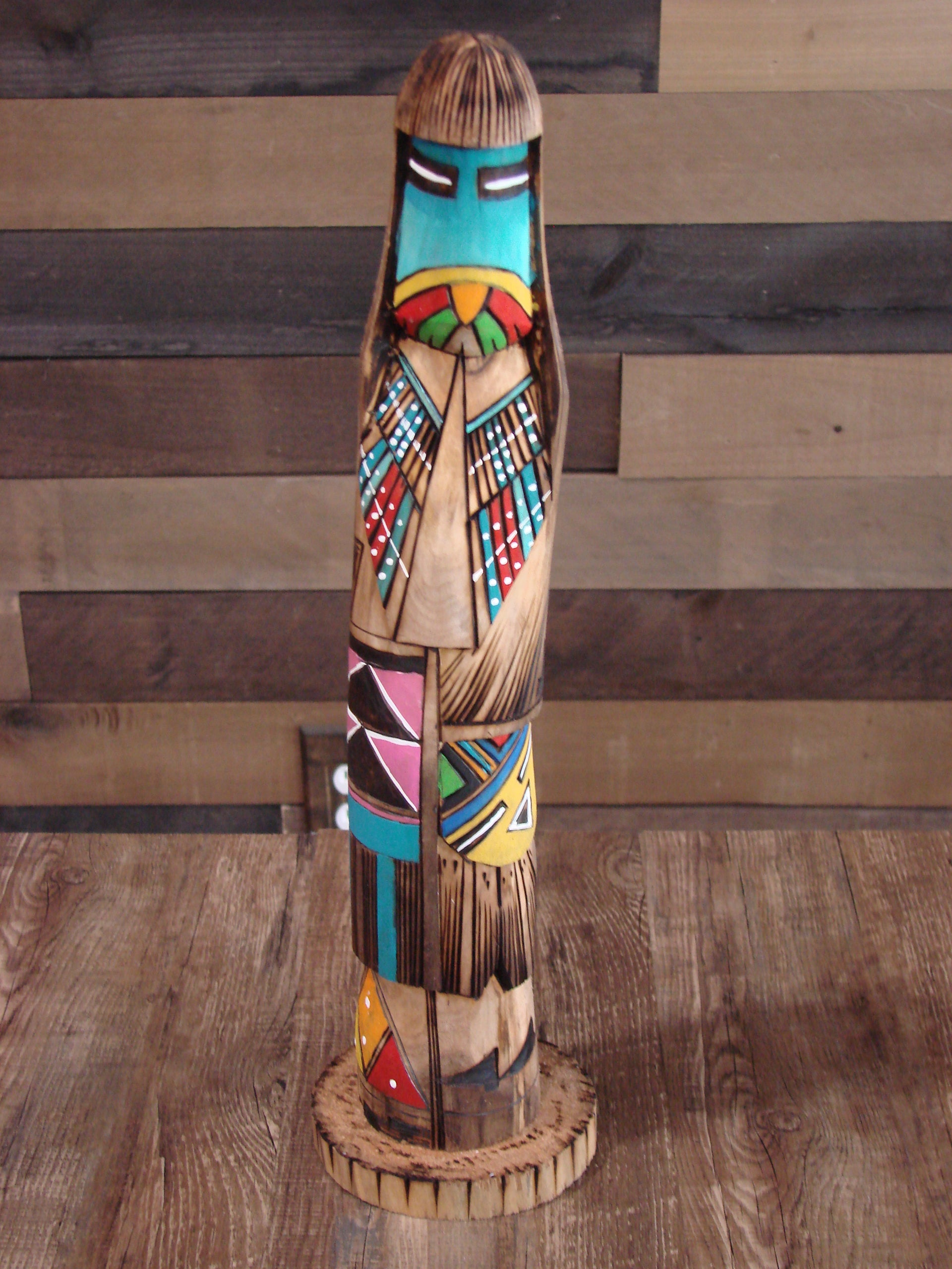 Genuine Native American Navajo Indian Long Hair Shalako Kachina from the Navajo Nation in Western New Mexico. This Stunning Shalako features beautiful hand painting and is hand carved from the traditional Cottonwood Root. The detail and look is extremely Amazing. Handmade by Navajo Indian artist J. Totsoni . Signed "JT" on the bottom. Free Shipping Included!
