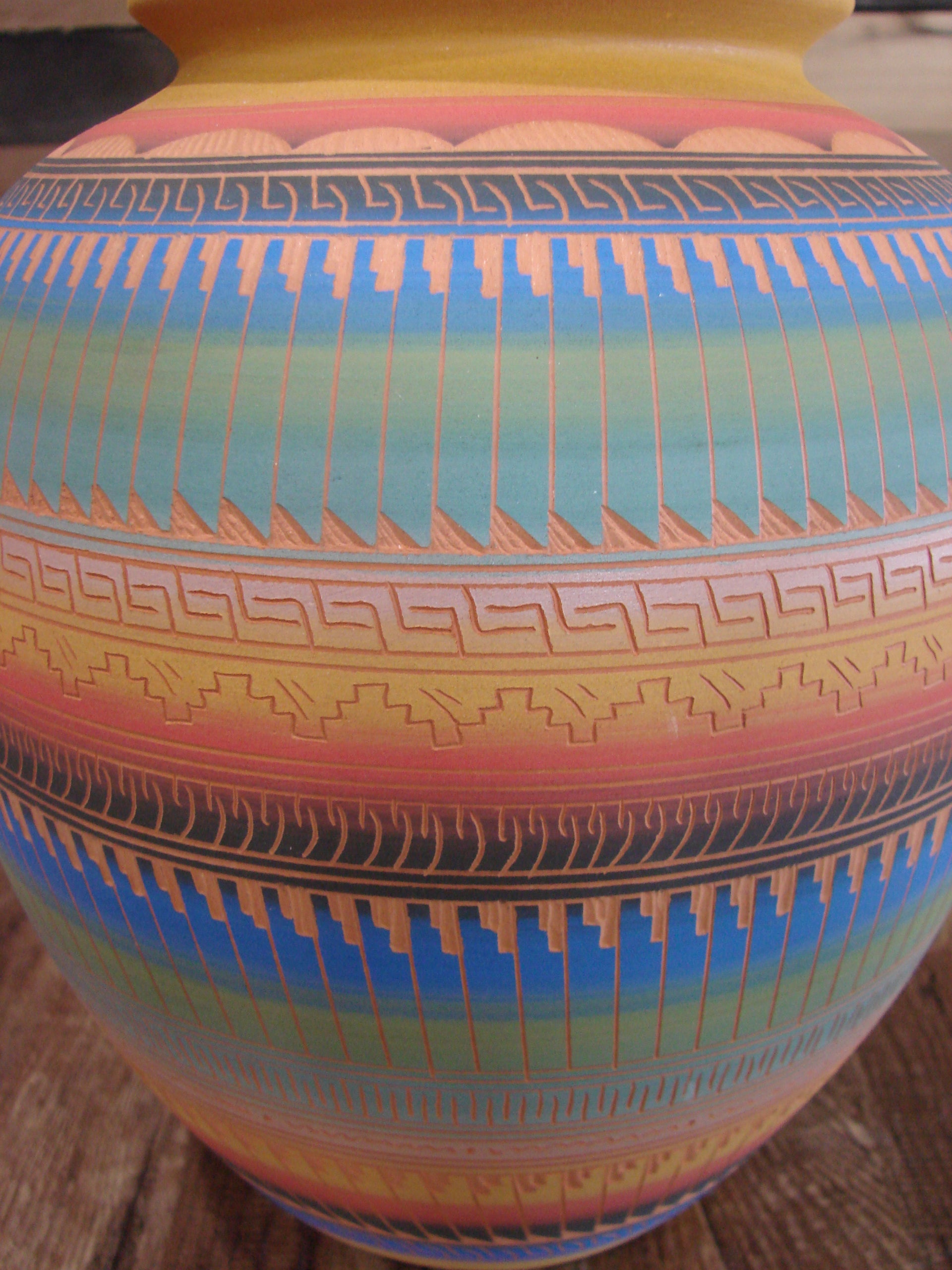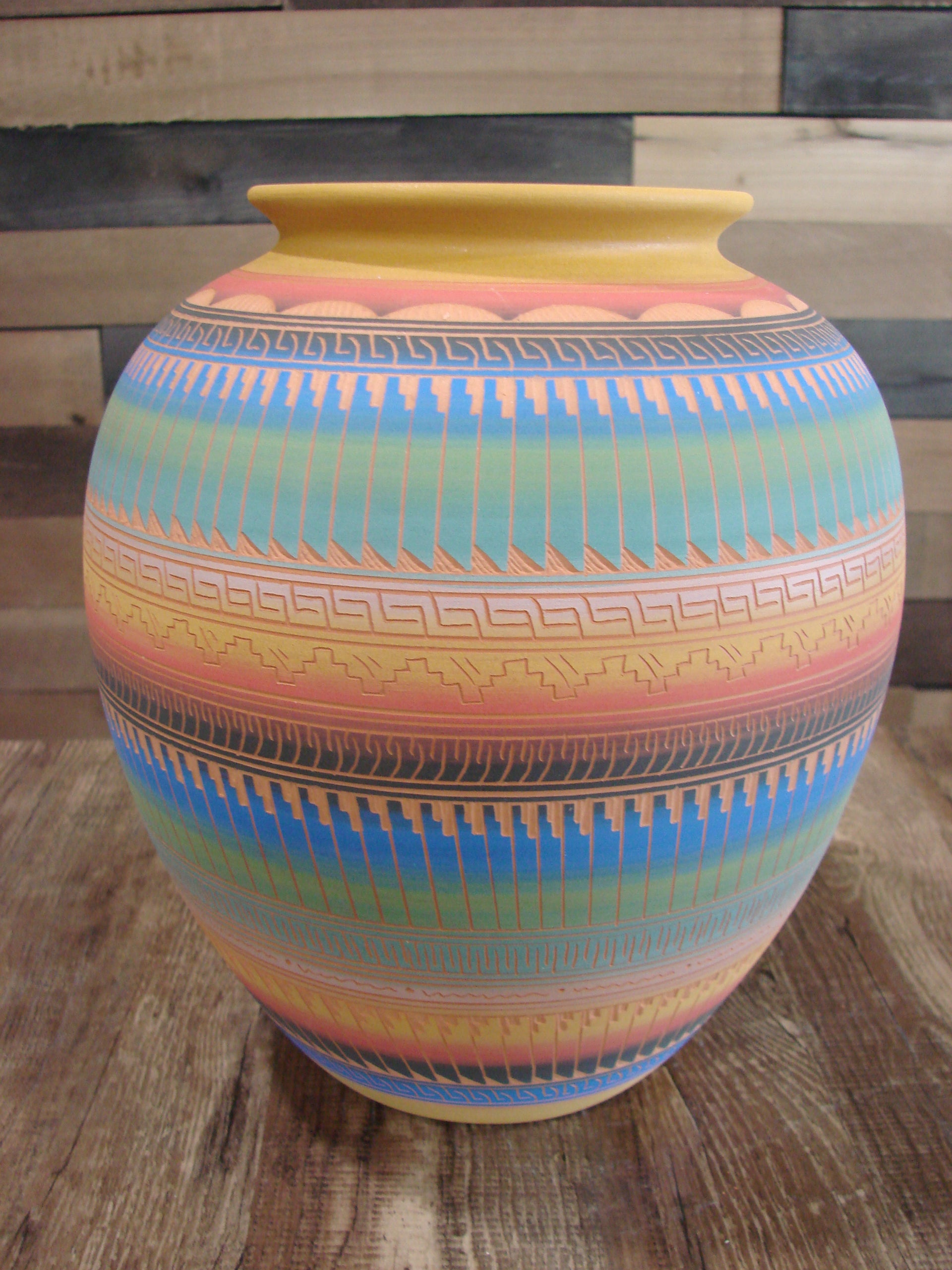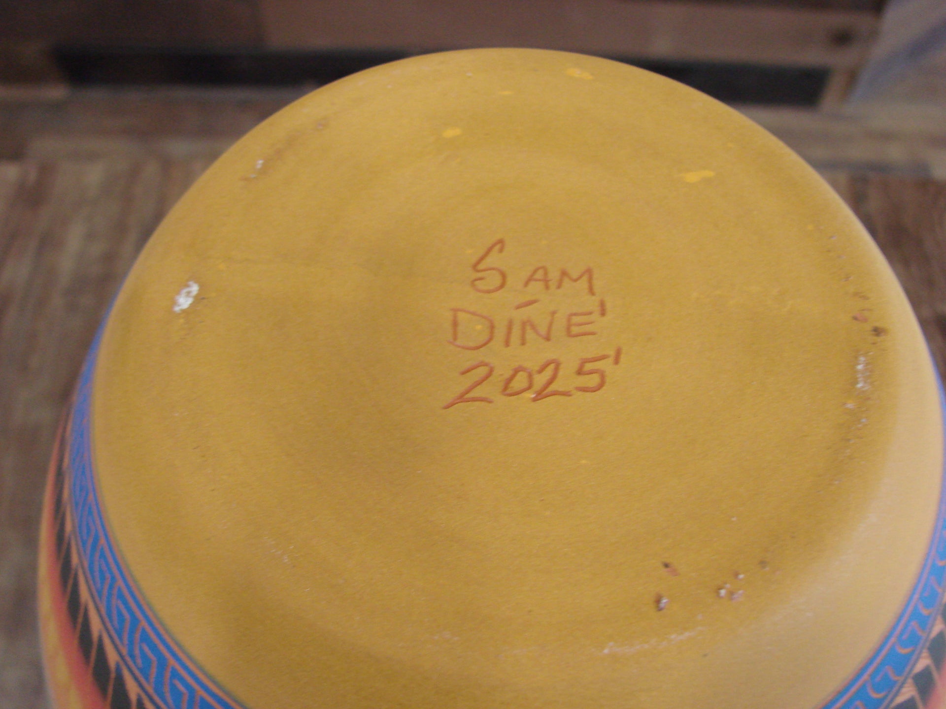 Genuine Native American Navajo Indian Hand Etched and Hand Painted & Hand Etched Pottery from Western New Mexico. This beautiful piece of pottery features stunning Hand Painted and traditional Hand Etched Navajo patterns throughout. Hand etched and painted by SAM. Signed "SAM Dine 2025" on the bottom. Free shipping included!