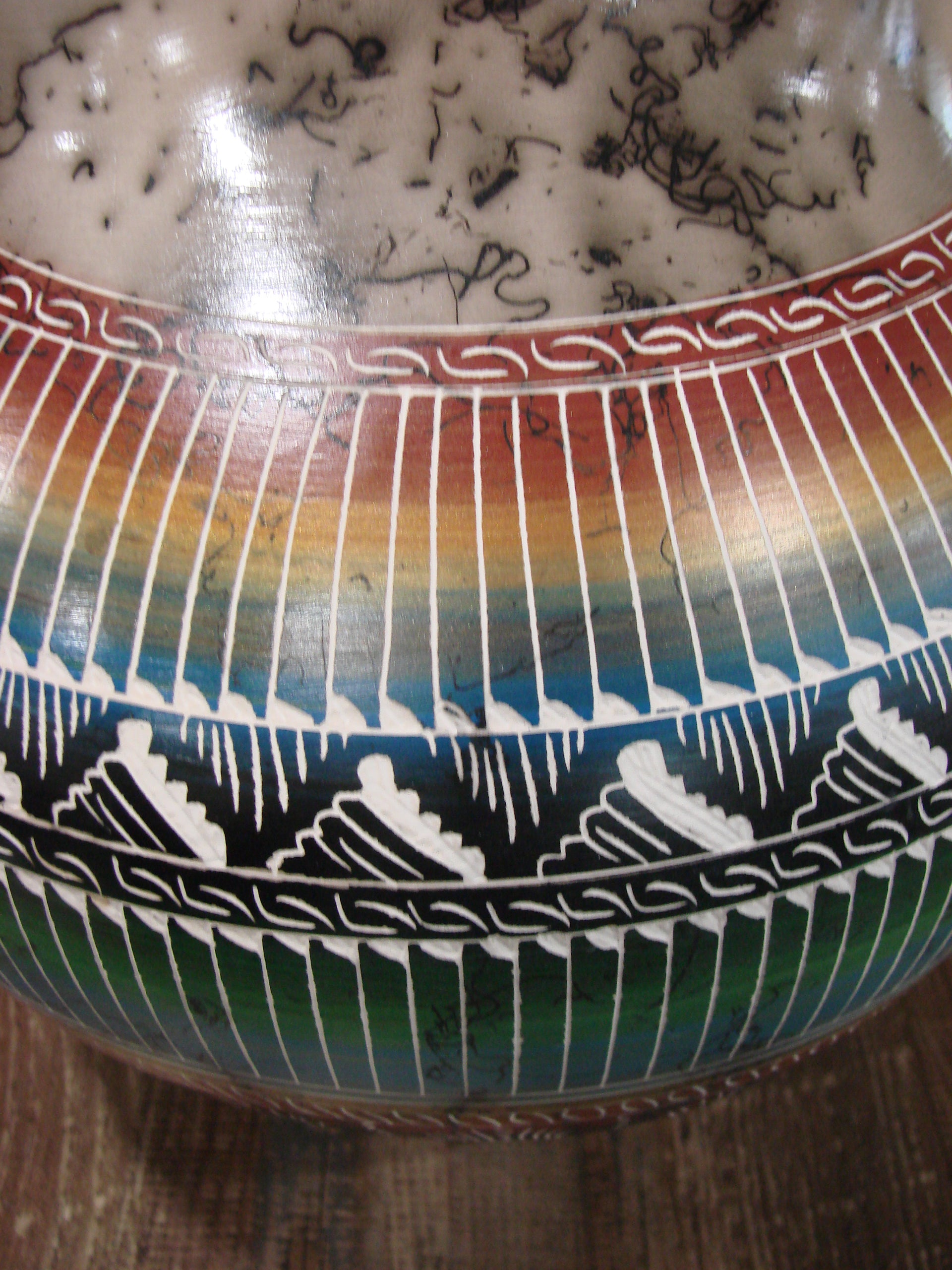 Genuine Native American Navajo Indian Hand Etched and Hand Painted Horse Hair Wedding Vase Pottery from Western New Mexico. This beautiful piece of ceremonial pottery features stunning Hand Painted and traditional Hand Etched Navajo patterns throughout. Horse Hair is laid over this piece during firing to create a unique, one of a kind look! This piece Symbolizes Two becoming One. Hand etched and painted by Cecilia Benally. Signed "C. Benally Dine" on the bottom. Free shipping included!