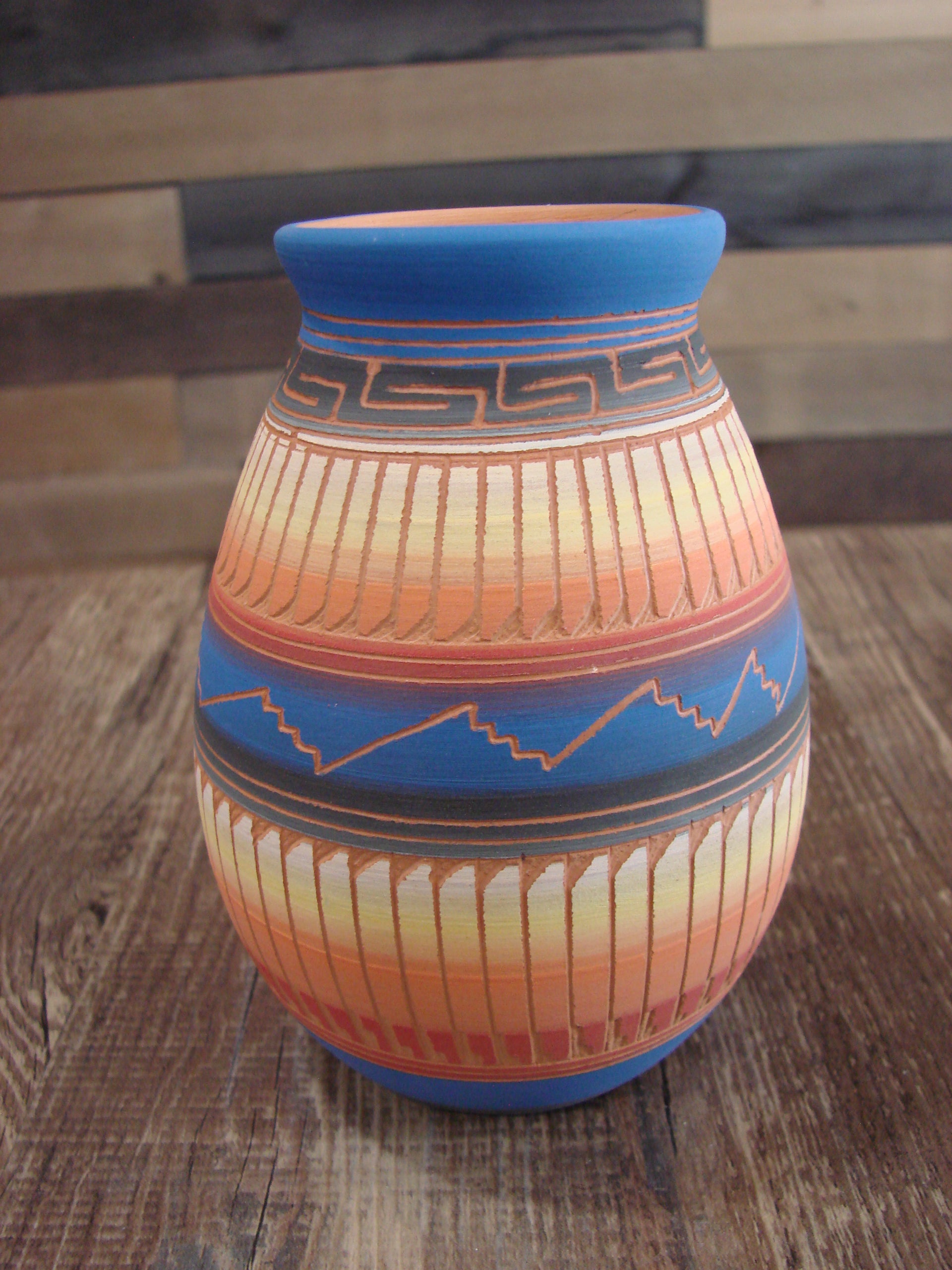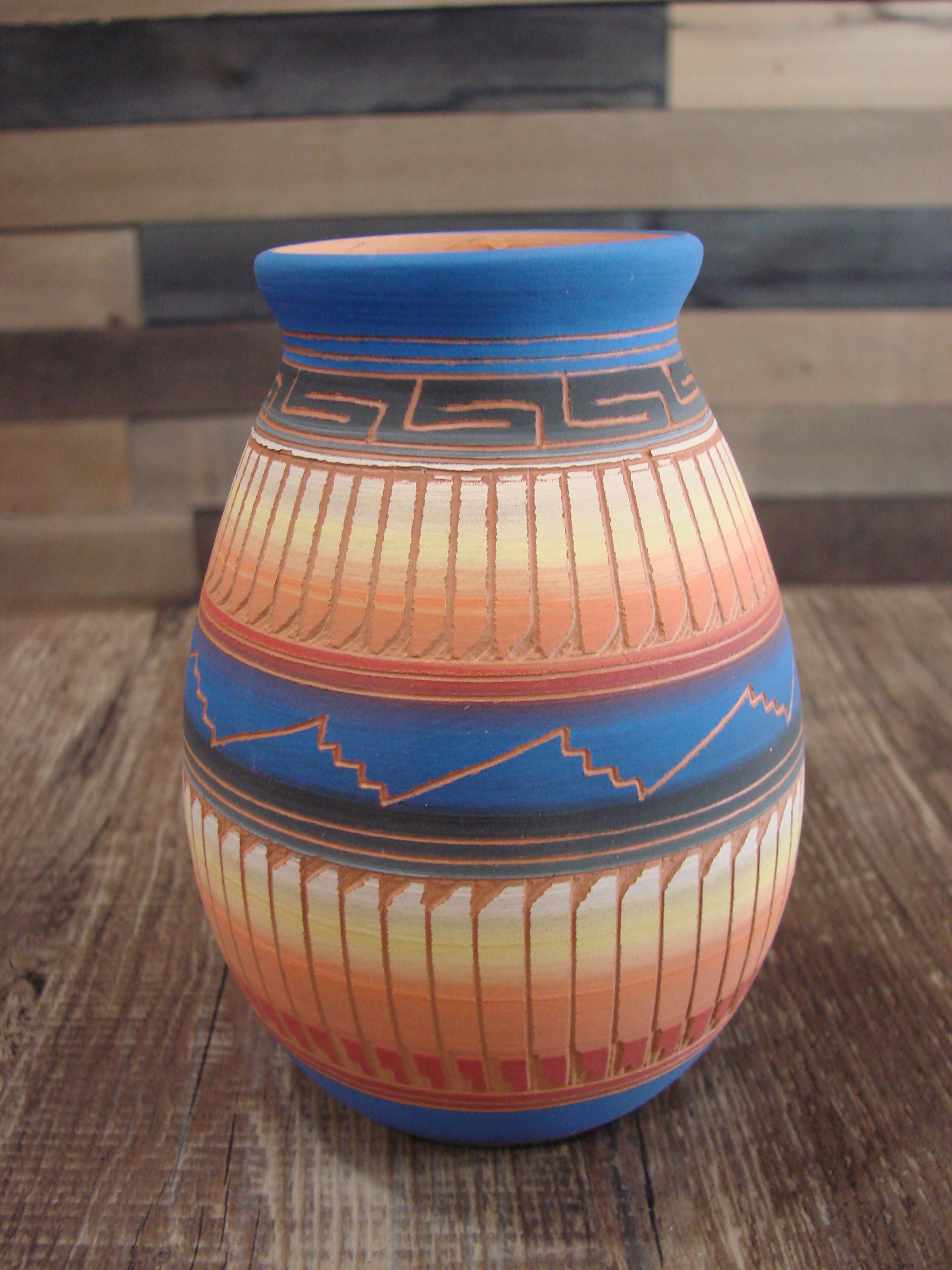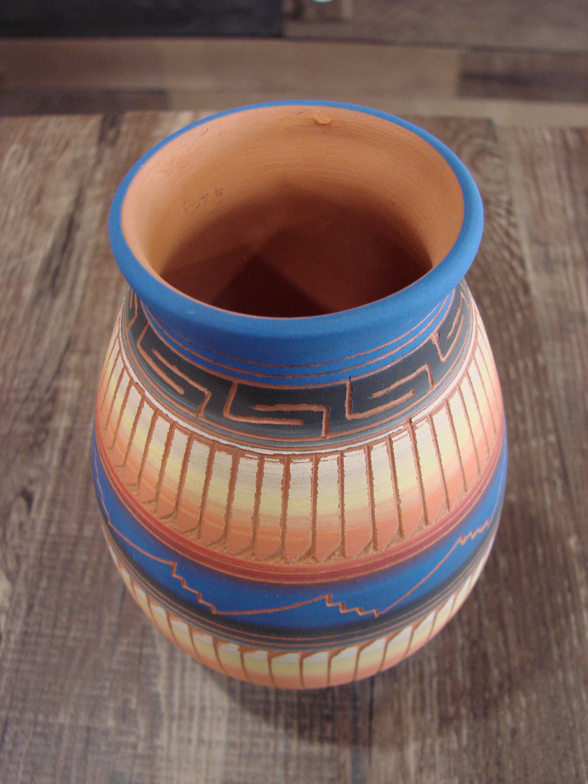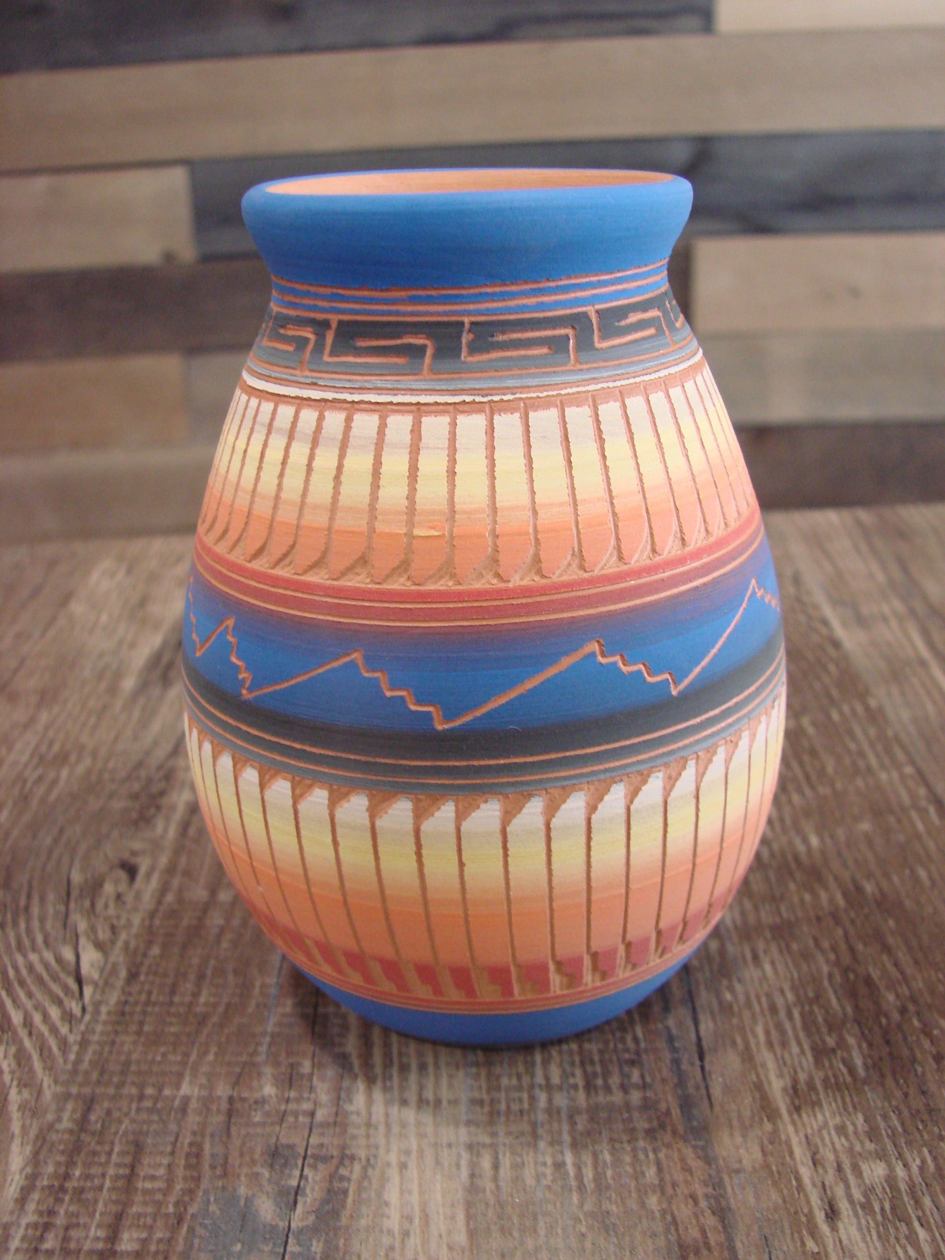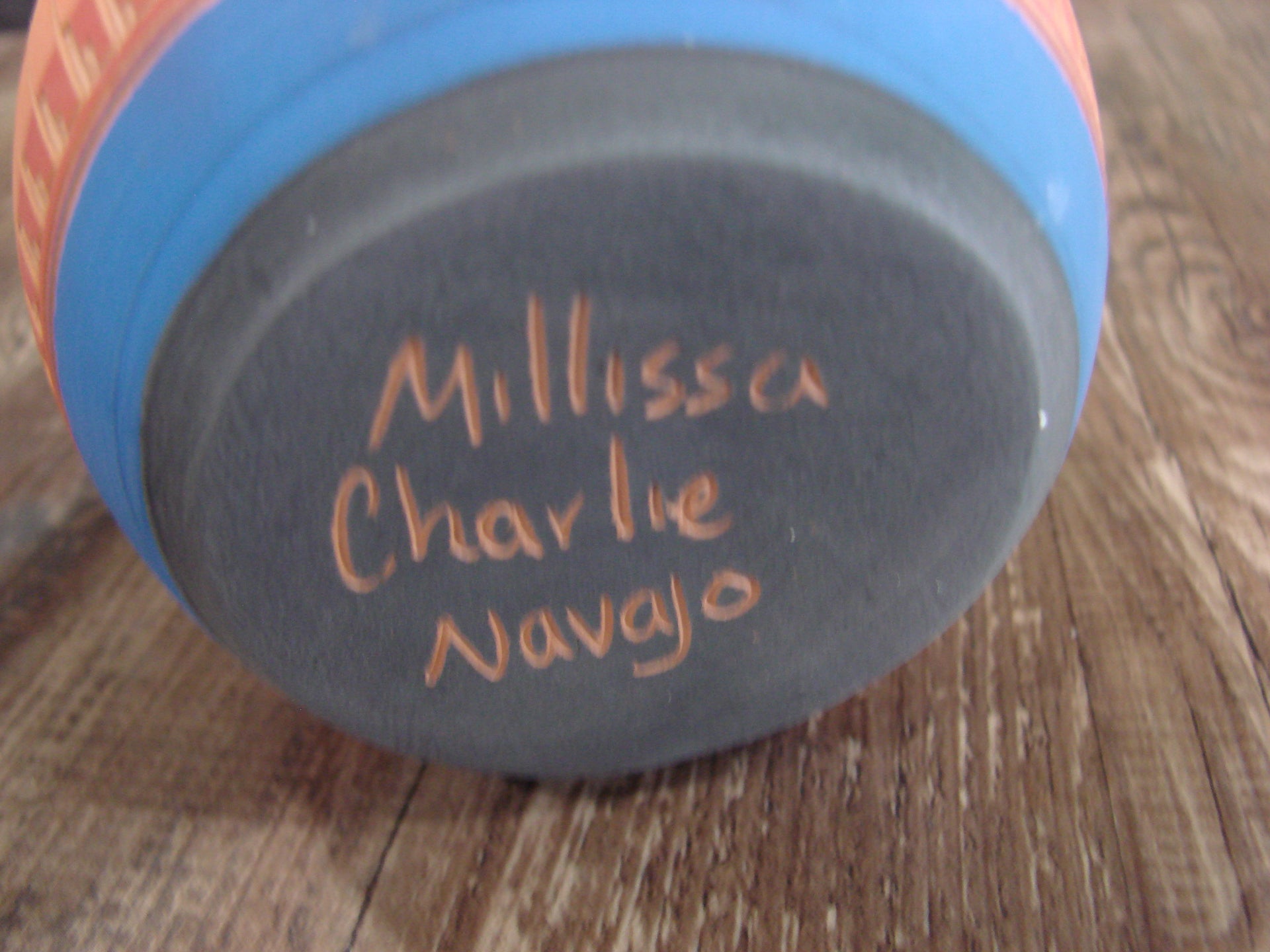 Genuine Native American Navajo Indian Hand Etched and Hand Painted Pottery from Western New Mexico. This beautiful piece of pottery features stunning Hand Painted and traditional Hand Etched Navajo patterns throughout. Hand etched and painted by Michael Charlie. Signed "Millissa Charlie" on the bottom. Free shipping included!