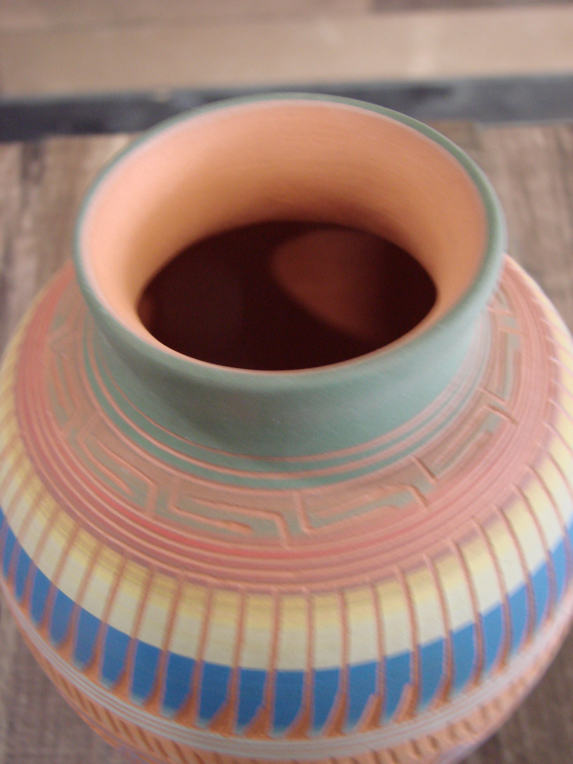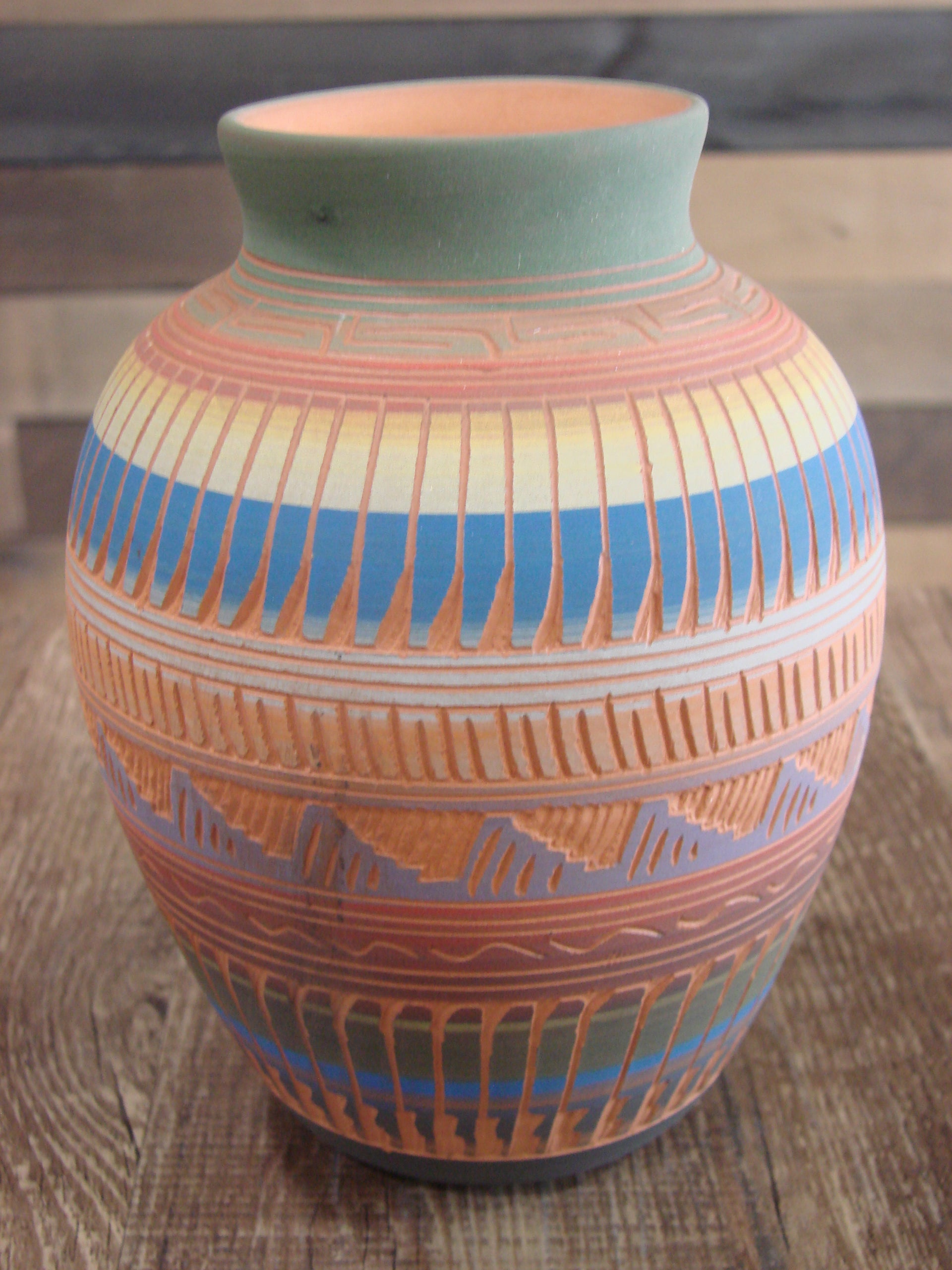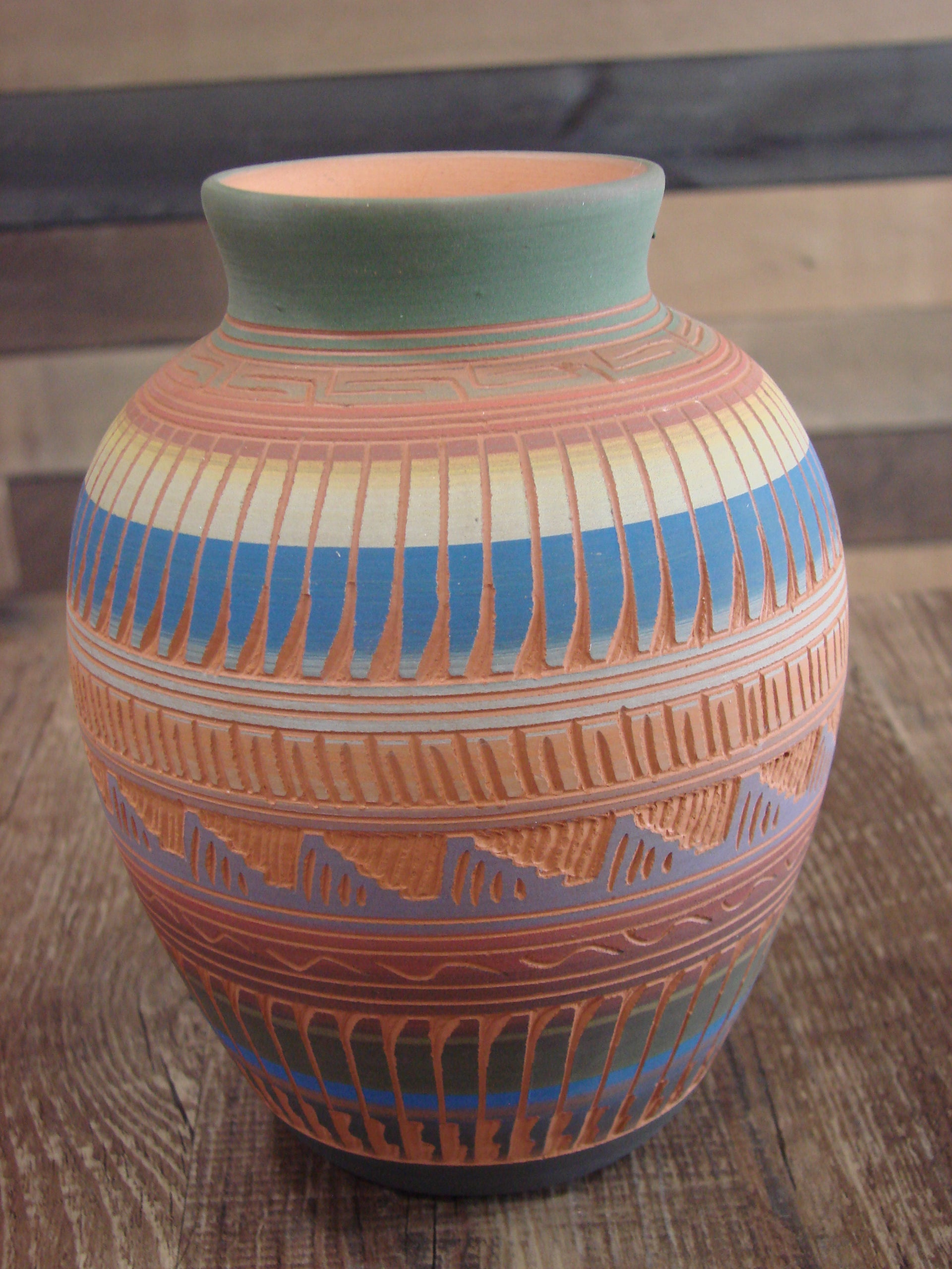 Genuine Native American Navajo Indian Hand Etched and Hand Painted Pottery from Western New Mexico. This beautiful piece of pottery features stunning Hand Painted and traditional Hand Etched Navajo patterns throughout. Hand etched and painted by Michael Charlie. Signed "Michael Charlie" on the bottom. Free shipping included!