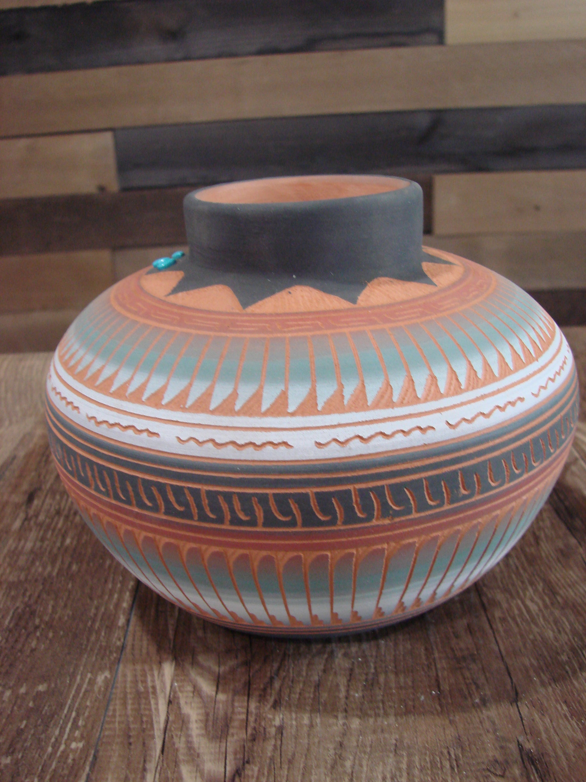 Genuine Native American Navajo Indian Hand Etched and Hand Painted Pottery from Western New Mexico. This beautiful piece of pottery features stunning Hand Painted and traditional Hand Etched Navajo patterns throughout. Hand etched and painted by Robinson & Valencia. Signed "Robinson & Valencia Dine" on the bottom. Free shipping included!