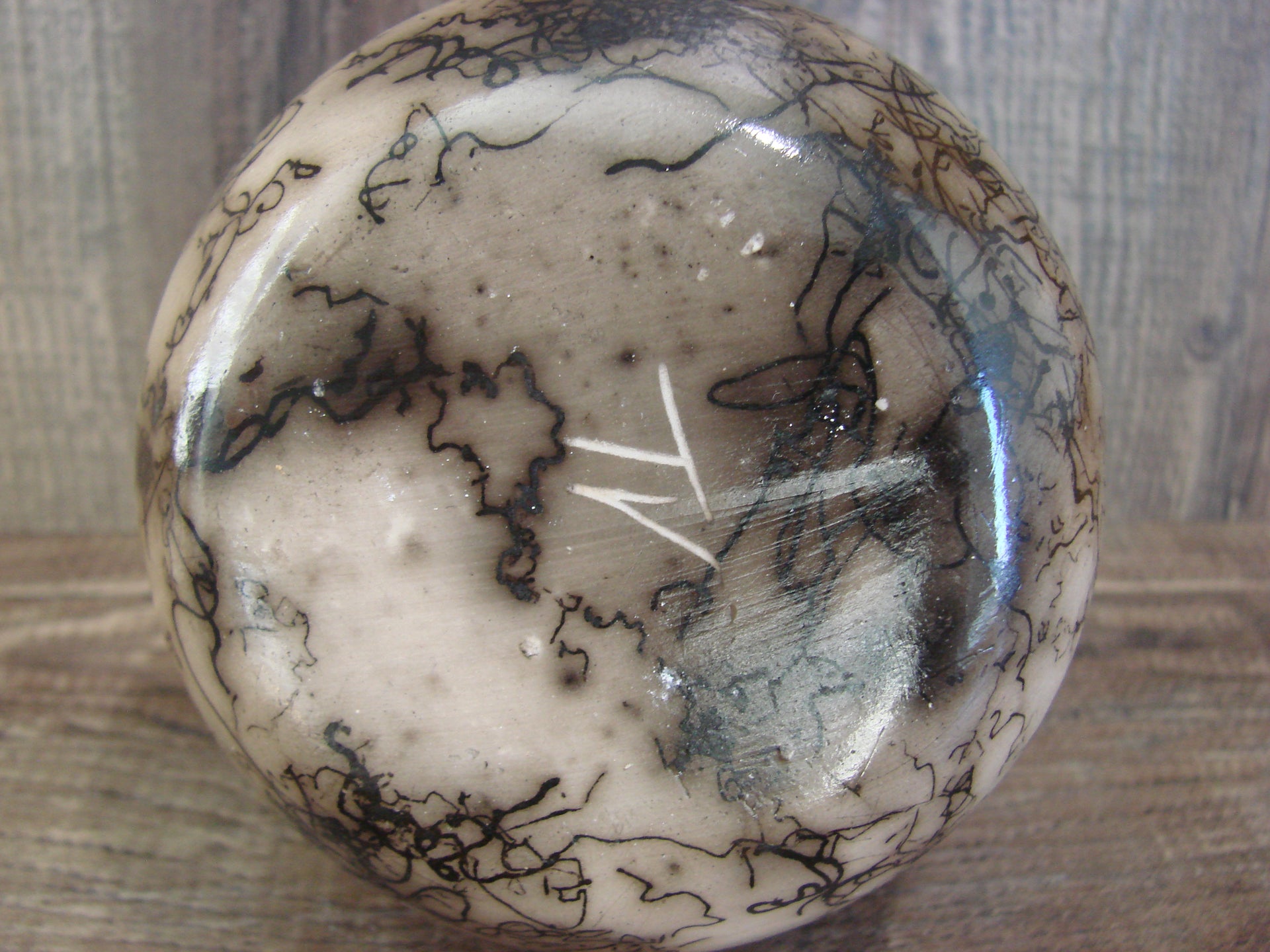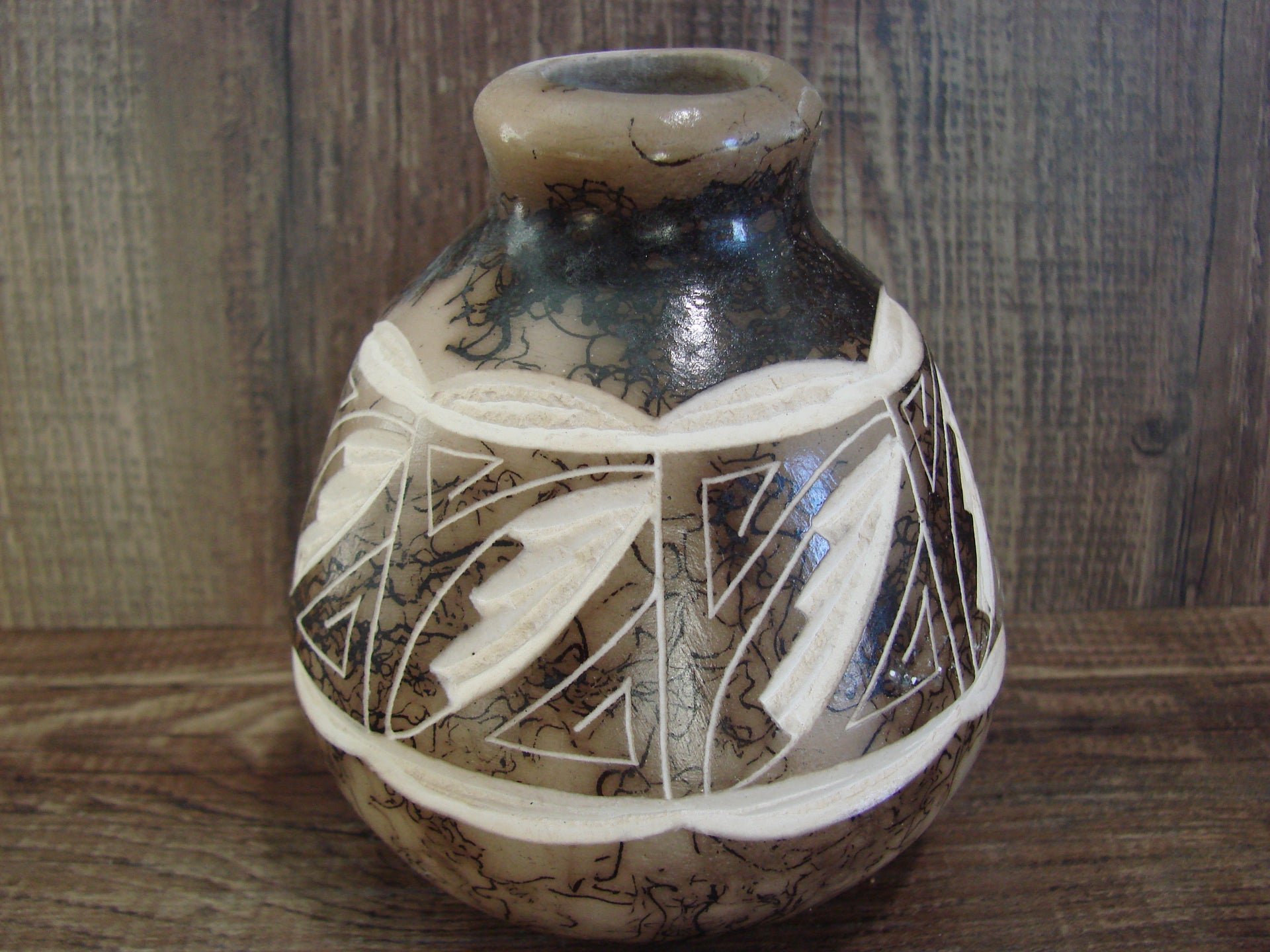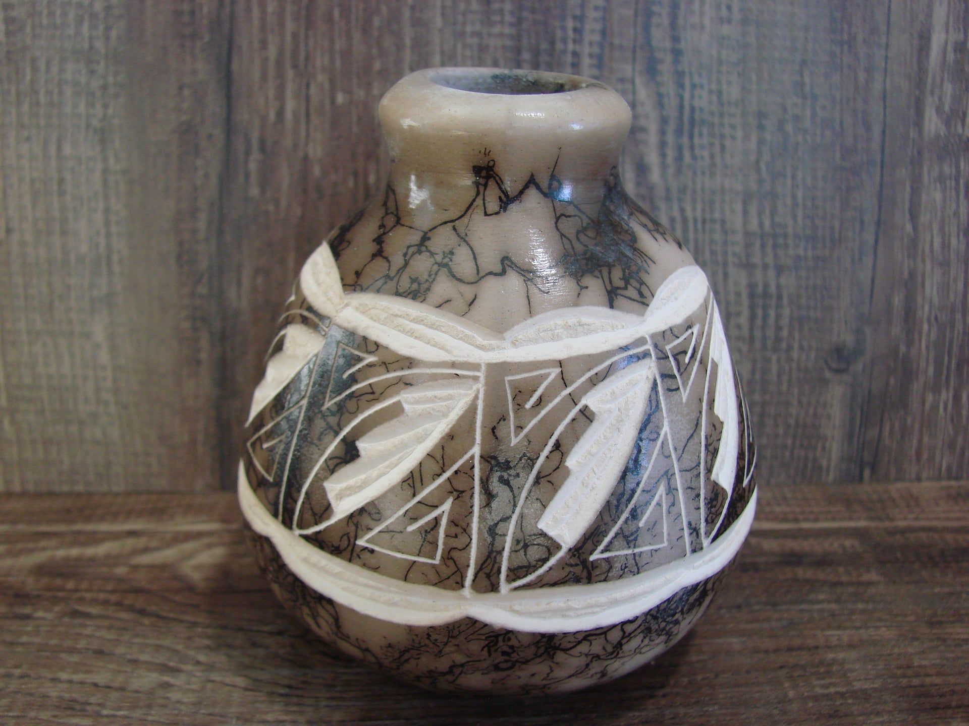 Genuine Native American Navajo Indian Horse Hair Pottery from Western New Mexico. This small piece of pottery features beautiful horse hair throughout. The Horse hair is laid over this piece during firing. The result is a unique one of a kind look. Hand etched by Navajo artist Tom Vail Jr. Signed on the bottom. Free Shipping included!