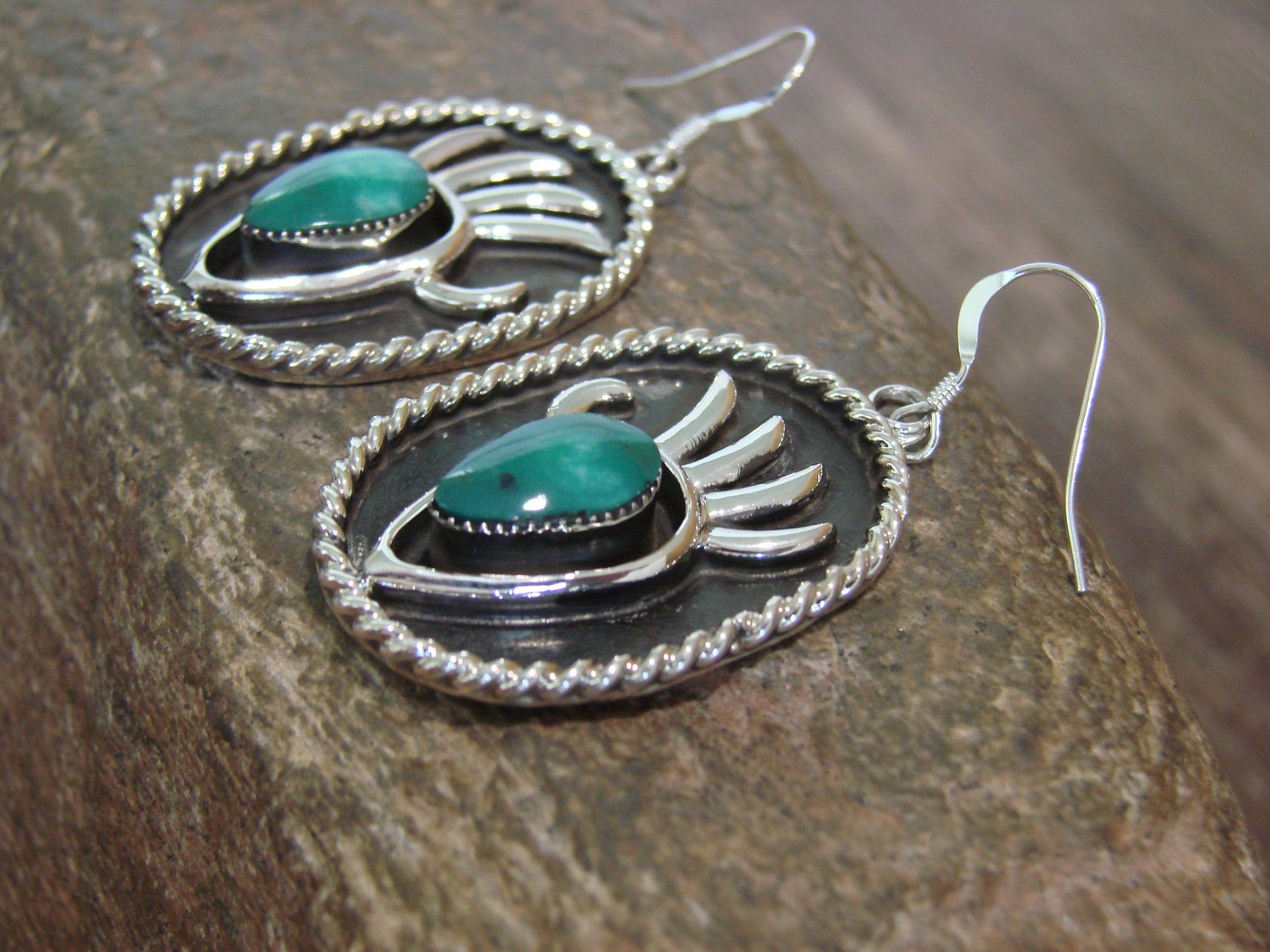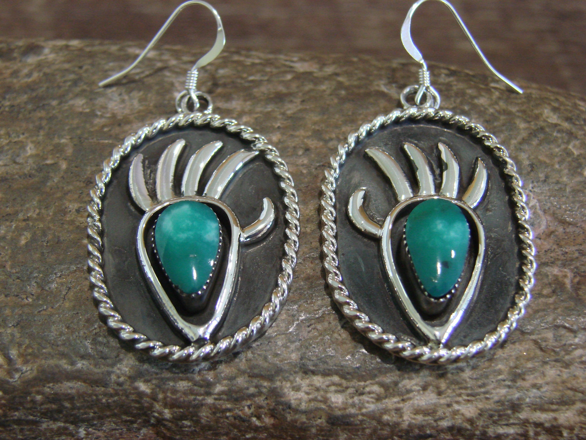 Native American Navajo Indian Turquoise Bear Paw Dangle Earrings from Western New Mexico. These Stunning earrings feature a Genuine Turquoise stone set into a beautiful crown sterling silver bezel setting. The Bear Paw is cut out around the stone giving these a shadow box look. This is a beautiful pair of earrings! Navajo Indian hand made by Jimson Belin. These are hallmarked and stamped ".925" on the back. Free gift box and shipping included!