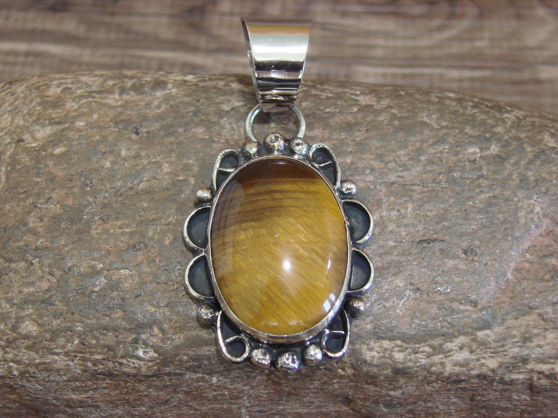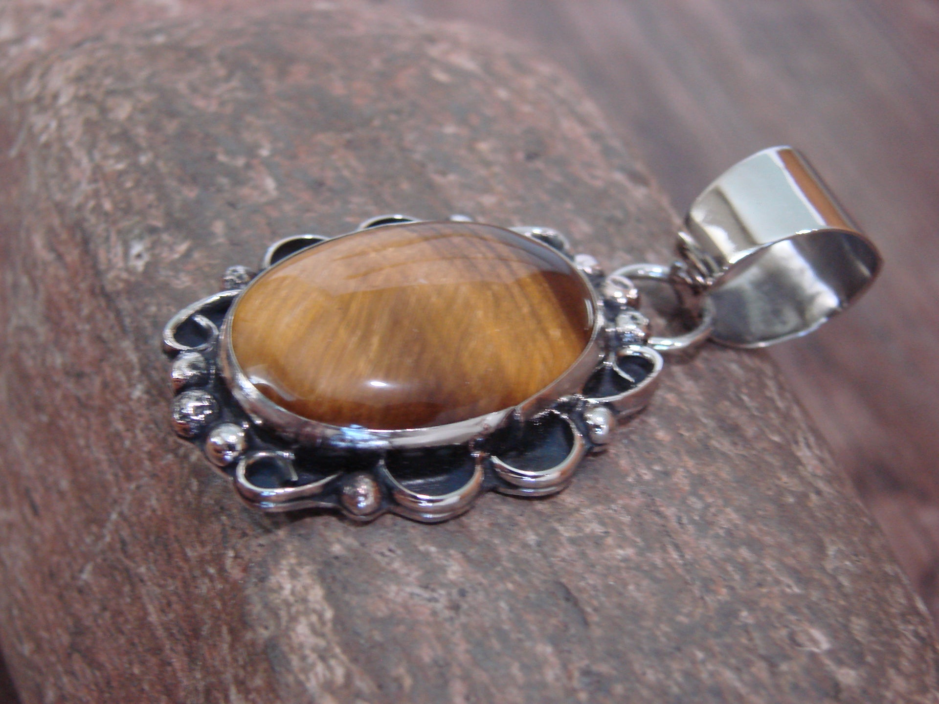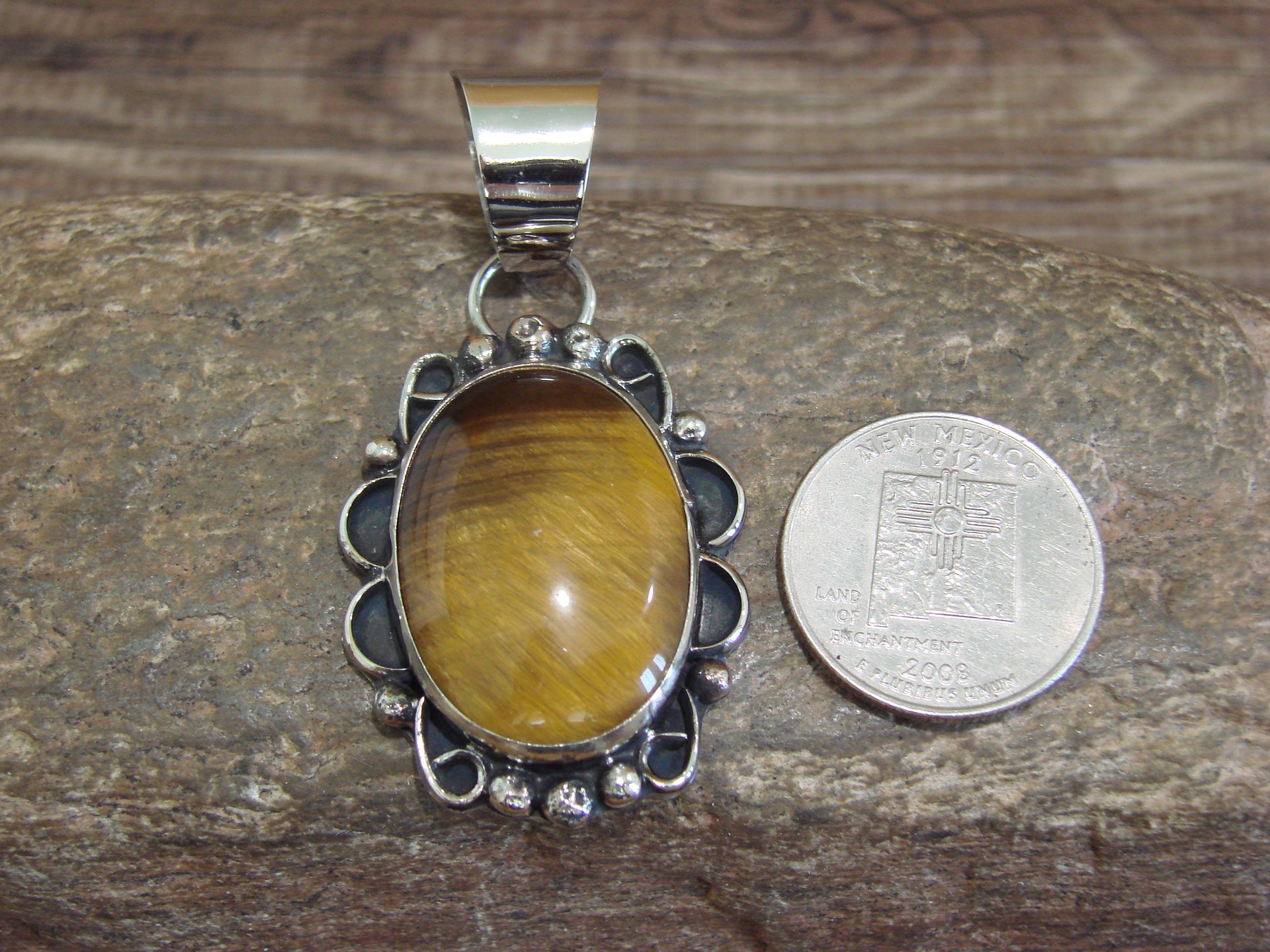 Native American Navajo Indian Nickel Silver & Tiger Eye Pendant from Western New Mexico. This beautiful Pendant is hand cut from Nickel Silver and features stunning traditional Nickel Silver details throughout. The Tiger Eye stone is securely set into a smooth Nickel bezel setting. This Pendant is made with Nickel Silver. Handmade by Jackie Cleveland, wife of the late Navajo Silversmith Albert Cleveland. Signed "JC" on back. Free gift box and shipping included!