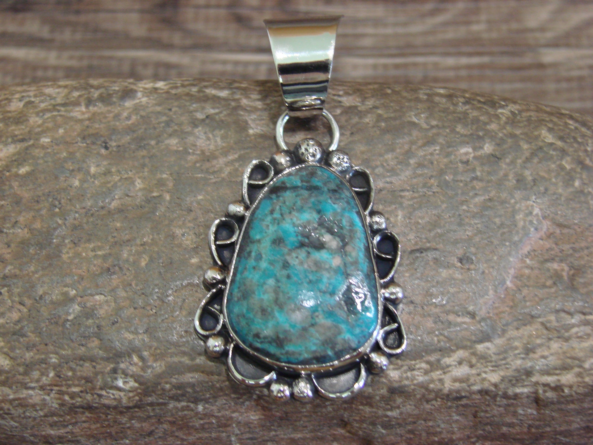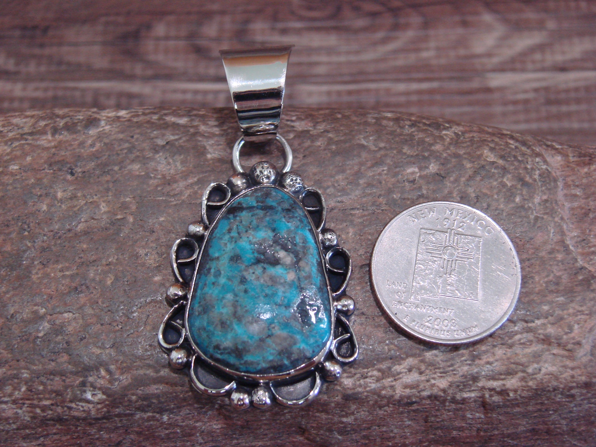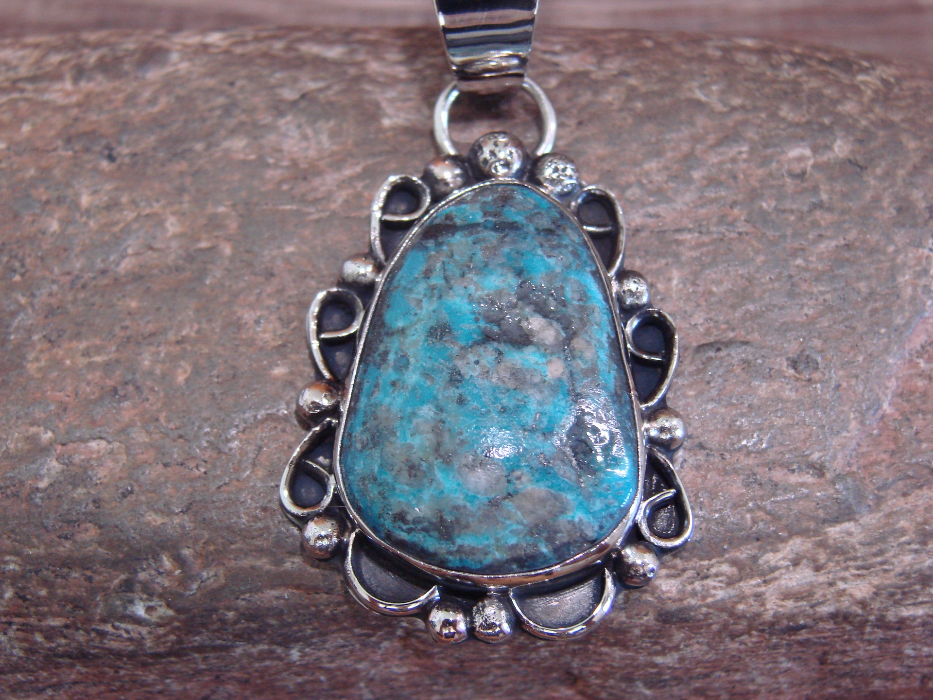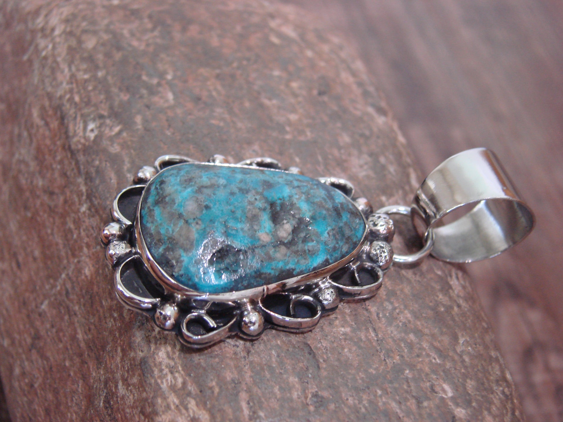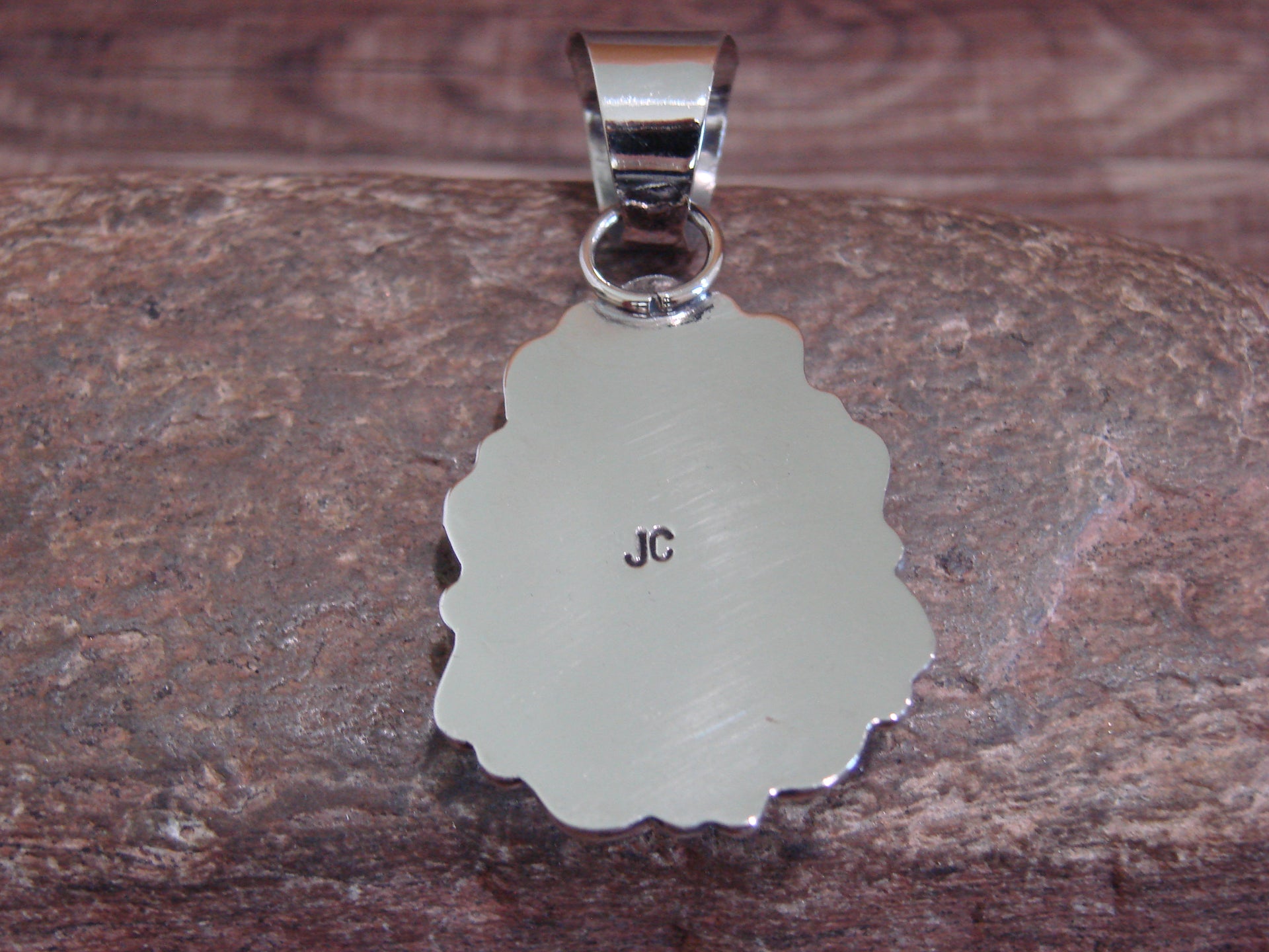 Native American Navajo Indian Nickel Silver & Turquoise Pendant from Western New Mexico. This beautiful Pendant is hand cut from Nickel Silver and features stunning traditional Nickel Silver details throughout. The Genuine Turquoise stone is securely set into a smooth Nickel bezel setting. This Pendant is made with Nickel Silver. Handmade by Jackie Cleveland, wife of the late Navajo Silversmith Albert Cleveland. Signed "JC" on back. Free gift box and shipping included!