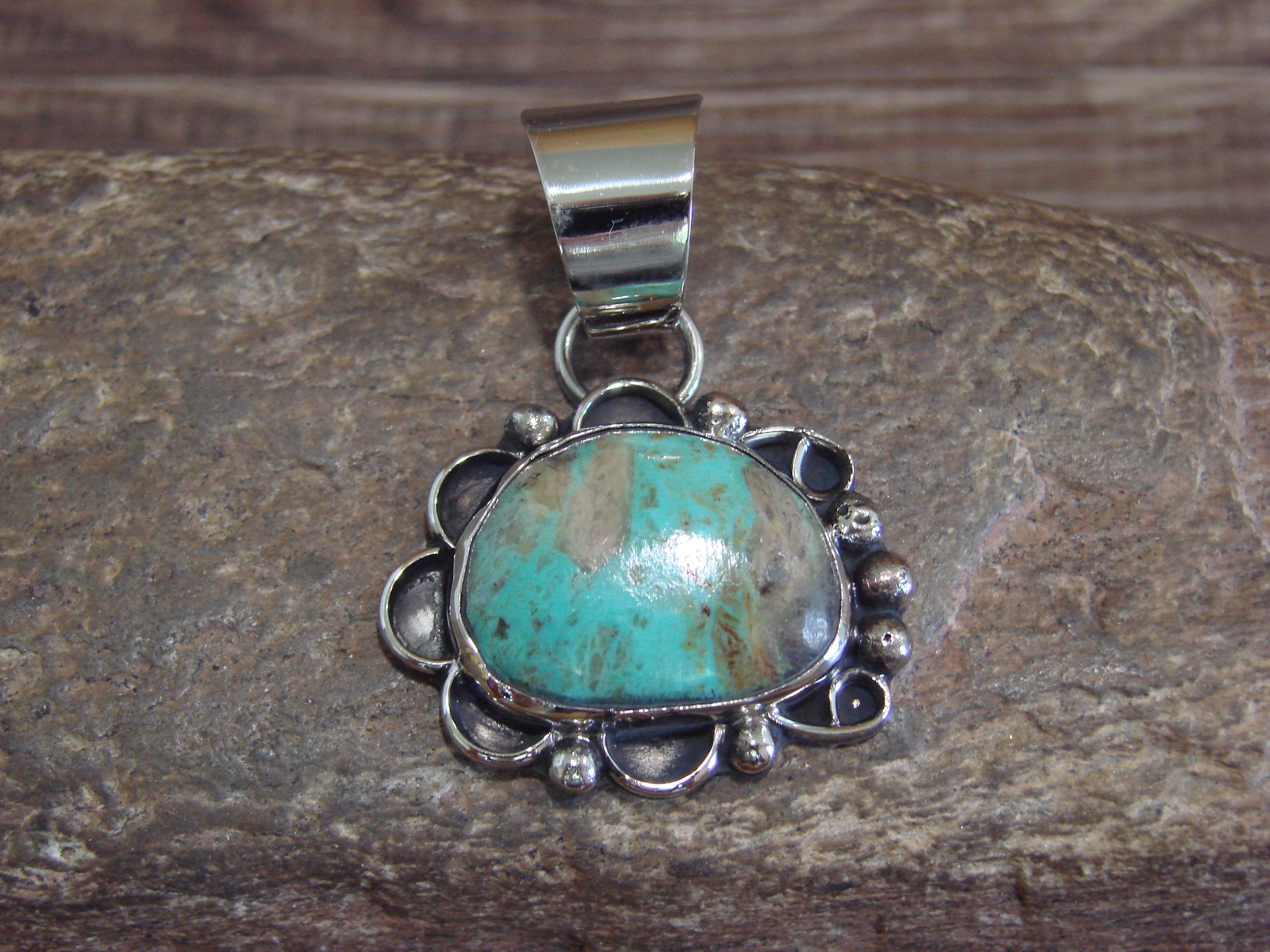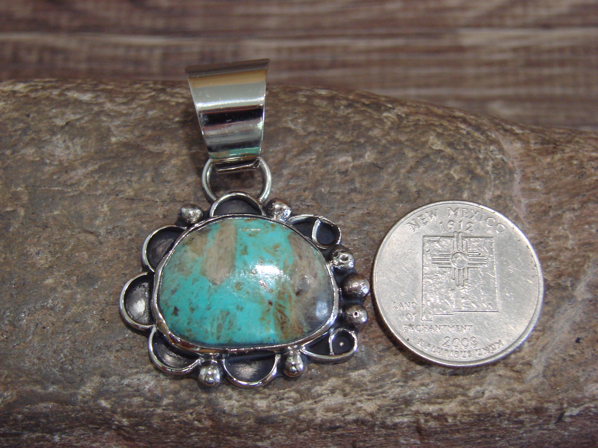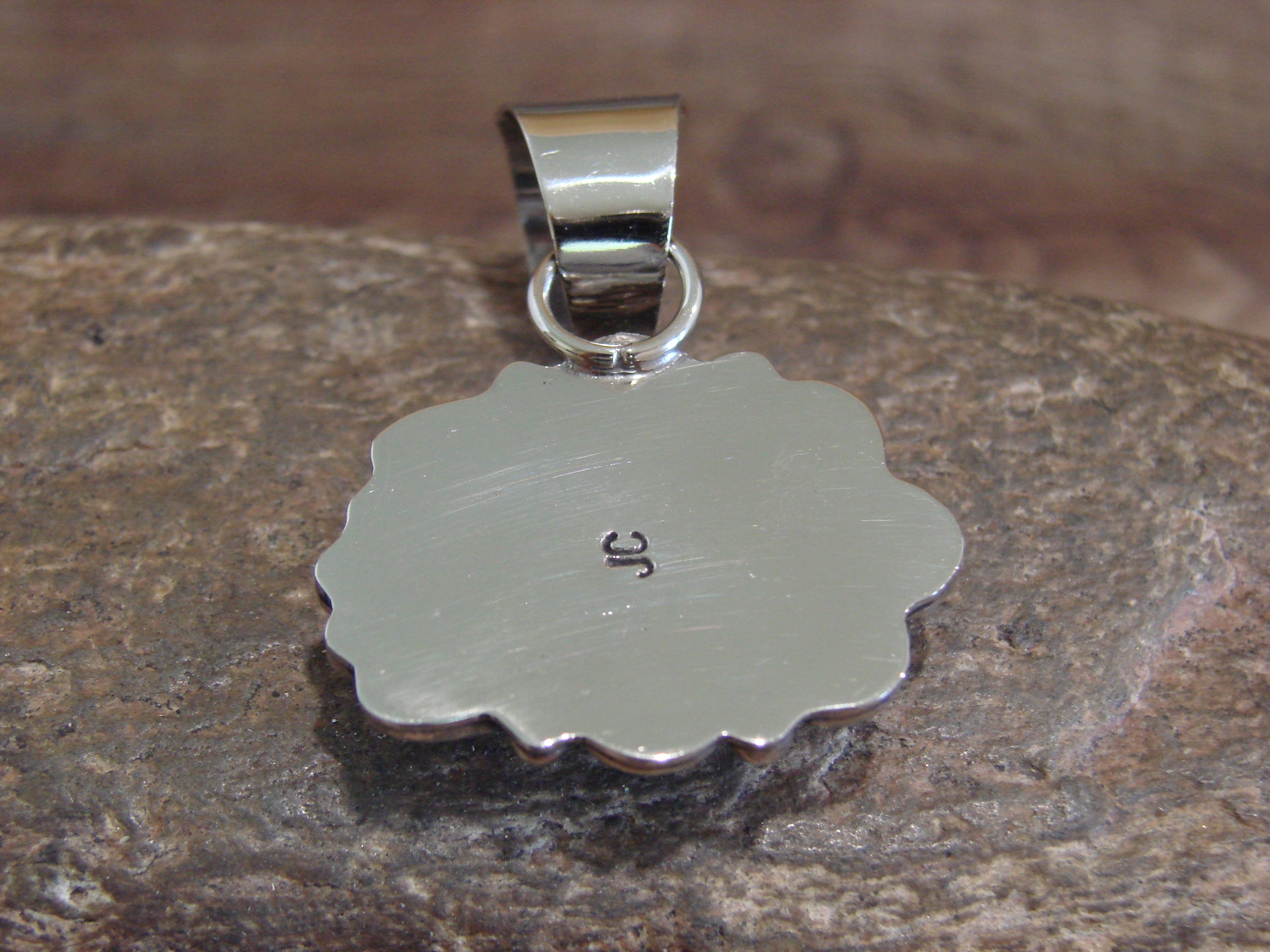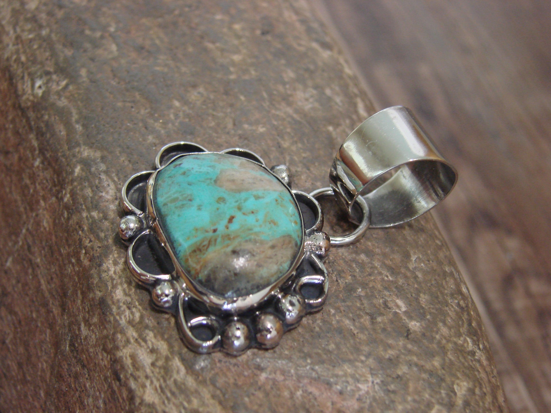 Native American Navajo Indian Nickel Silver & Turquoise Pendant from Western New Mexico. This beautiful Pendant is hand cut from Nickel Silver and features stunning traditional Nickel Silver details throughout. The Genuine Turquoise stone is securely set into a smooth Nickel bezel setting. This Pendant is made with Nickel Silver. Handmade by Jackie Cleveland, wife of the late Navajo Silversmith Albert Cleveland. Signed "JC" on back. Free gift box and shipping included!