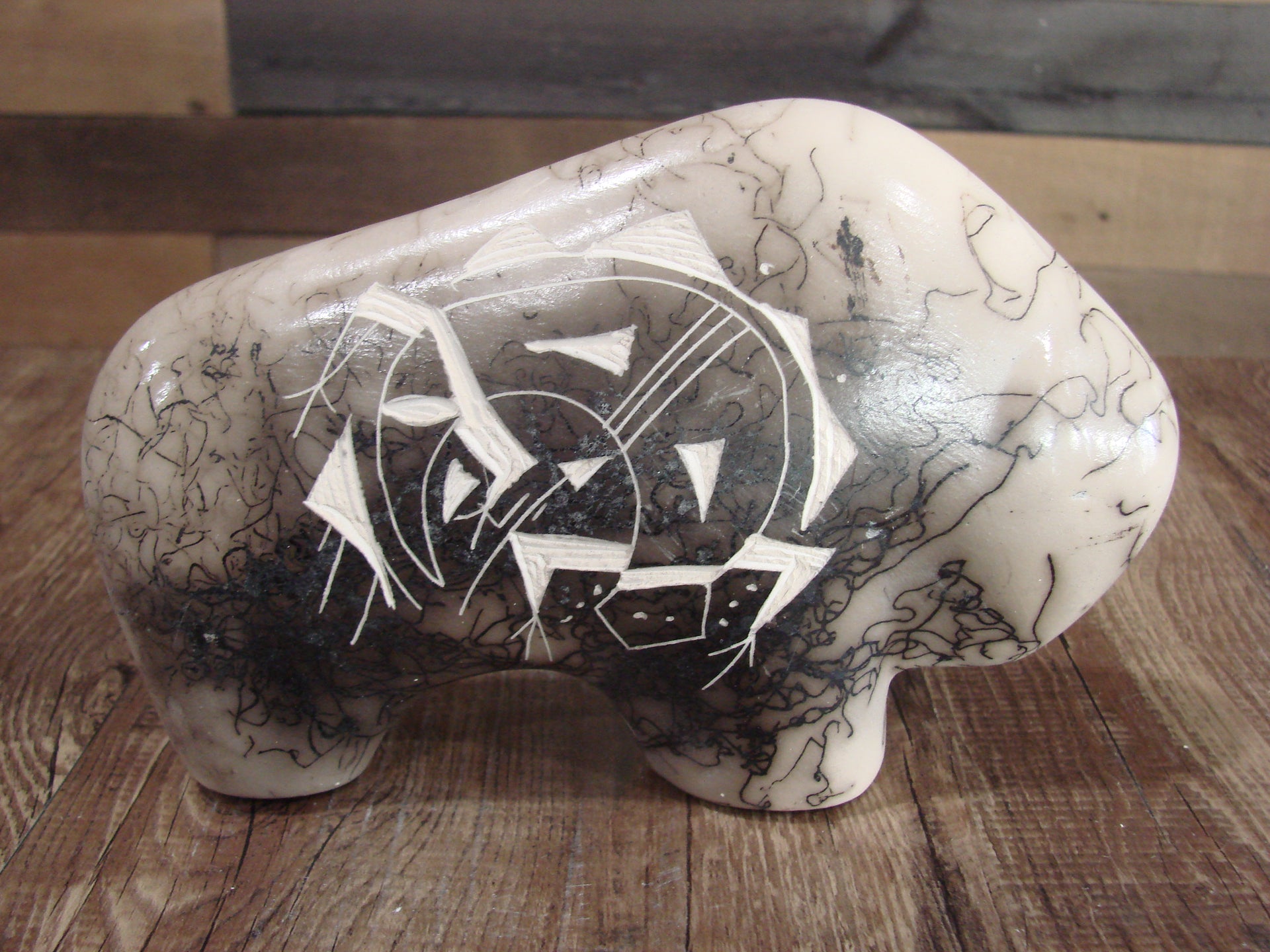 Genuine Native American Navajo Indian Horse Hair Buffalo Sculpture from Western New Mexico. This sculpture features beautiful horse hair and hand etching throughout. The Horse hair is laid over this piece during firing. The result is a unique one of a kind look! Hand etched by Navajo artist Vail. Signed on the bottom. Free Shipping included!