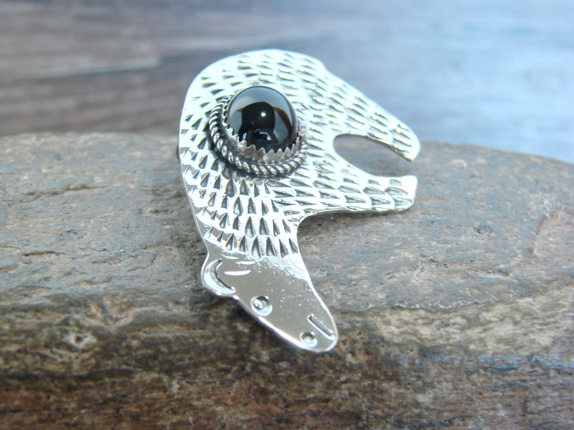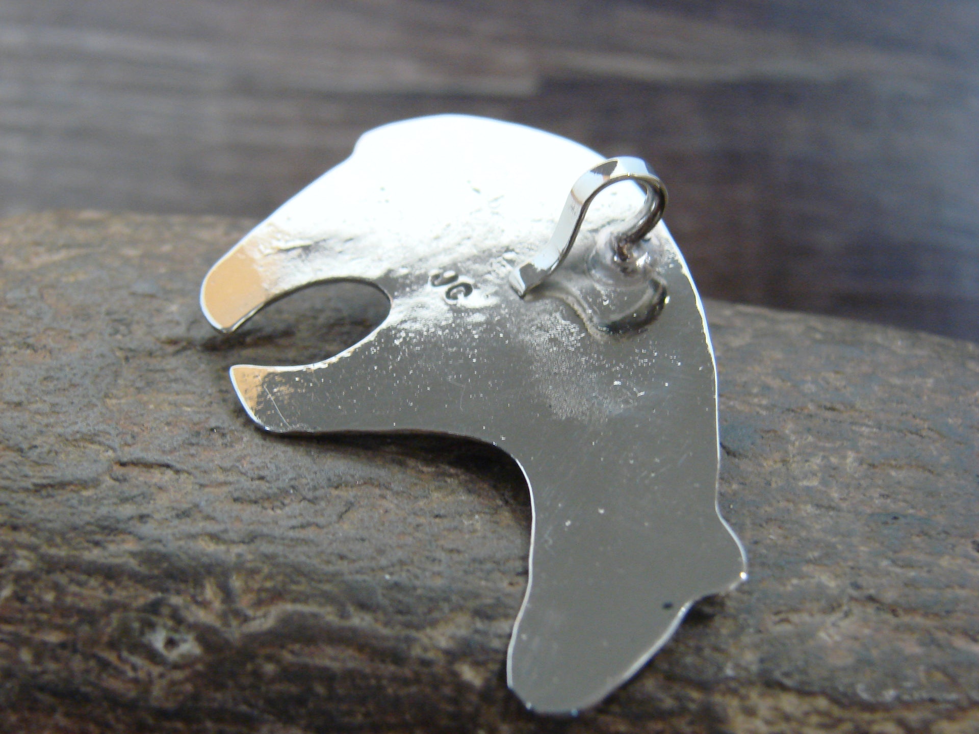 Native American Navajo Indian Nickel Silver & Onyx Bear Pendant from Western New Mexico. This beautiful Pendant is hand cut from Nickel Silver and features stunning traditional hand stamping throughout. The Onyx stone is securely set into a crown Nickel Silver bezel setting. Handmade by Jackie Cleveland, wife of the late Navajo Silversmith Albert Cleveland. Signed "JC" on back. Jackie is widely known for her traditional Navajo style and hand stamping. Free gift box and shipping included!