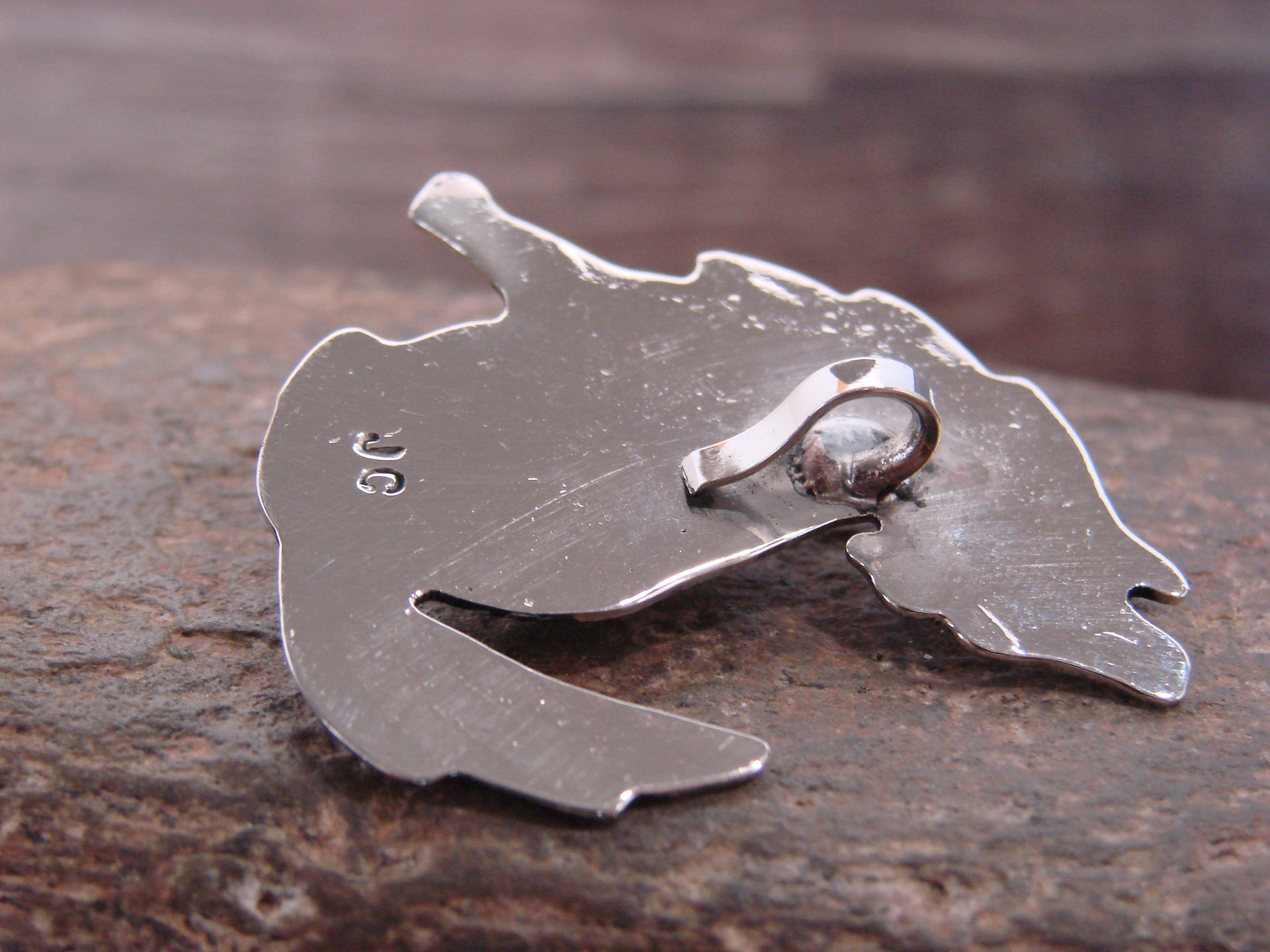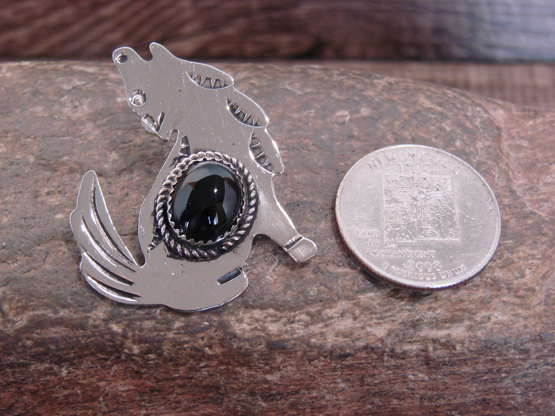 Native American Navajo Indian Nickel Silver & Onyx Coyote Pendant from Western New Mexico. This beautiful Pendant is hand cut from Nickel Silver and features stunning traditional hand stamping throughout. The Onyx stone is securely set into a crown Nickel Silver bezel setting. Handmade by Jackie Cleveland, wife of the late Navajo Silversmith Albert Cleveland. Signed "JC" on back. Jackie is widely known for her traditional Navajo style and hand stamping. Free gift box and shipping included!