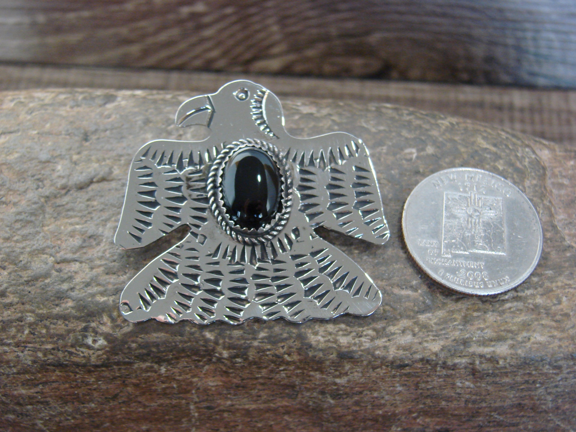 Native American Navajo Indian Nickel Silver & Onyx Eagle Pendant from Western New Mexico. This beautiful Pendant is hand cut from Nickel Silver and features stunning traditional hand stamping throughout. The Onyx stone is securely set into a crown Nickel Silver bezel setting. Handmade by Jackie Cleveland, wife of the late Navajo Silversmith Albert Cleveland. Signed "JC" on back. Jackie is widely known for her traditional Navajo style and hand stamping. Free gift box and shipping included!
