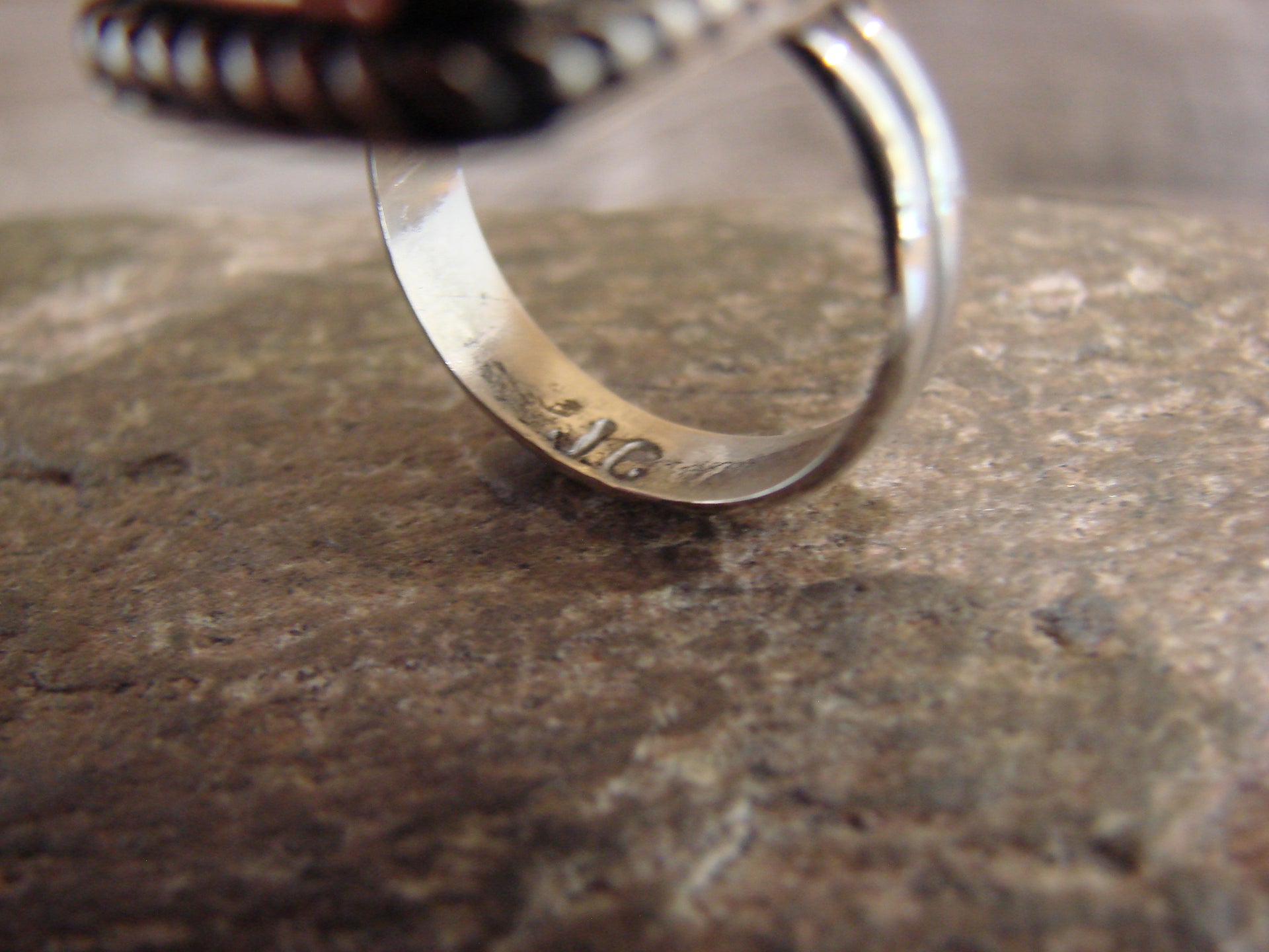 Native American Navajo Indian Nickel Silver & Onyx Ring from Western New Mexico. This ring features a Man Made Onyx stone set into a smooth Nickel Silver bezel setting. Beautiful Nickel Silver details Surround the Stone. This ring is made in Nickel Silver. This ring is Stunning! Navajo Indian handmade by Silversmith Jackie Cleveland. Signed "JC" on the back. Free Shipping and Gift Box included!