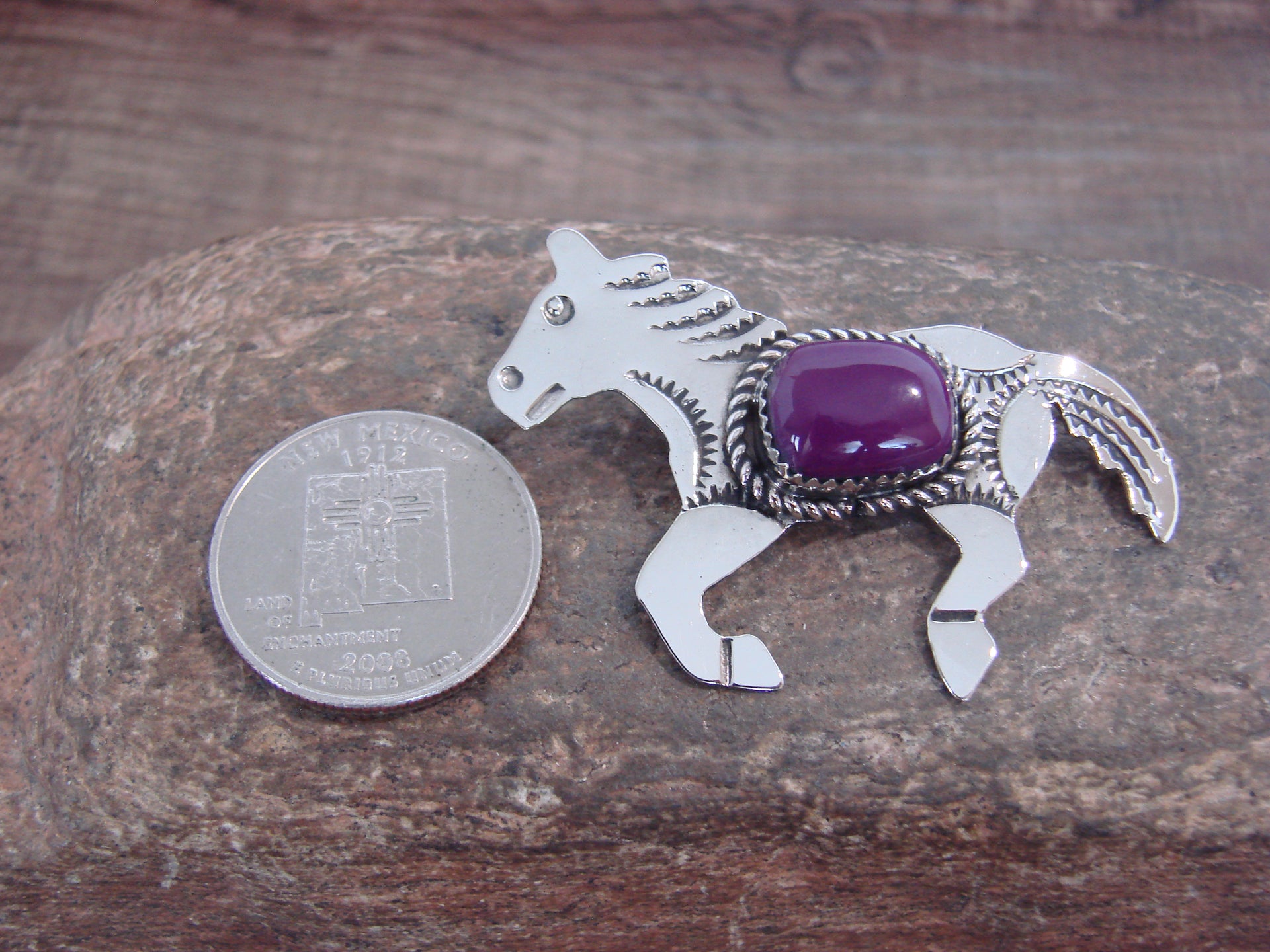 Native American Navajo Indian Nickel Silver & Purple Spiny Oyster Horse Pendant from Western New Mexico. This beautiful Pendant is hand cut from Nickel Silver and features stunning traditional hand stamping throughout. The Man Made stone is securely set into a crown Nickel Silver bezel setting. Handmade by Jackie Cleveland, wife of the late Navajo Silversmith Albert Cleveland. Signed "JC" on back. Jackie is widely known for her traditional Navajo style and hand stamping. Free gift box and shipping included!